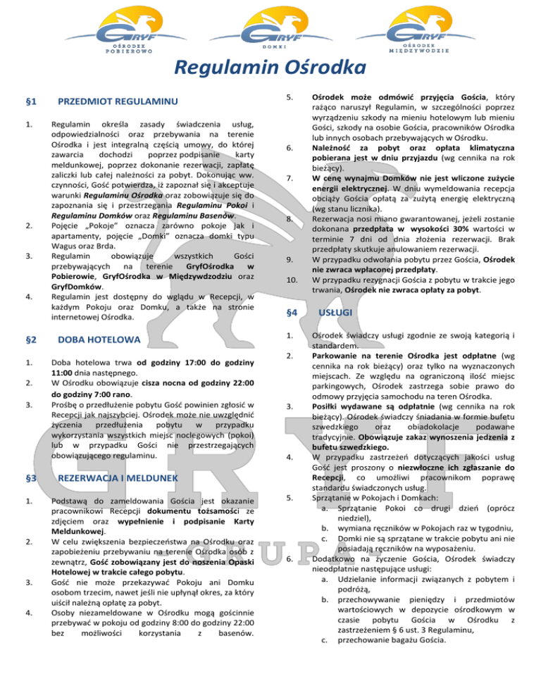 Regulamin Ośrodka §1 1. 2. 3. 4. §2 1. 2. 3. §3 1. 2. 3. 4. PRZEDMIOT REGULAMINU Regulamin określa zasady świadczenia usług, odpowiedzialności oraz przebywania na terenie Ośrodka i jest integralną częścią umowy, do której zawarcia dochodzi poprzez podpisanie karty meldunkowej, poprzez dokonanie rezerwacji, zapłatę zaliczki lub całej należności za pobyt. Dokonując ww. czynności, Gość potwierdza, iż zapoznał się i akceptuje warunki Regulaminu Ośrodka oraz zobowiązuje się do zapoznania się i przestrzegania Regulaminu Pokoi i Regulaminu Domków oraz Regulaminu Basenów. Pojęcie „Pokoje” oznacza zarówno pokoje jak i apartamenty, pojęcie „Domki” oznacza domki typu Wagus oraz Brda. Regulamin obowiązuje wszystkich Gości przebywających na terenie GryfOśrodka w Pobierowie, GryfOśrodka w Międzywdzodziu oraz GryfDomków. Regulamin jest dostępny do wglądu w Recepcji, w każdym Pokoju oraz Domku, a także na stronie internetowej Ośrodka. DOBA HOTELOWA Doba hotelowa trwa od godziny 17:00 do godziny 11:00 dnia następnego. W Ośrodku obowiązuje cisza nocna od godziny 22:00 do godziny 7:00 rano. Prośbę o przedłużenie pobytu Gość powinien zgłosić w Recepcji jak najszybciej. Ośrodek może nie uwzględnić życzenia przedłużenia pobytu w przypadku wykorzystania wszystkich miejsc noclegowych (pokoi) lub w przypadku Gości nie przestrzegających obowiązującego regulaminu. 5. 6. 7. 8. 9. 10. §4 1. 2. 3. 4. REZERWACJA I MELDUNEK Podstawą do zameldowania Gościa jest okazanie pracownikowi Recepcji dokumentu tożsamości ze zdjęciem oraz wypełnienie i podpisanie Karty Meldunkowej. W celu zwiększenia bezpieczeństwa na Ośrodku oraz zapobieżeniu przebywaniu na terenie Ośrodka osób z zewnątrz, Gość zobowiązany jest do noszenia Opaski Hotelowej w trakcie całego pobytu. Gość nie może przekazywać Pokoju ani Domku osobom trzecim, nawet jeśli nie upłynął okres, za który uiścił należną opłatę za pobyt. Osoby niezameldowane w Ośrodku mogą gościnnie przebywać w pokoju od godziny 8:00 do godziny 22:00 bez możliwości korzystania z basenów. 5. 6. Ośrodek może odmówić przyjęcia Gościa, który rażąco naruszył Regulamin, w szczególności poprzez wyrządzeniu szkody na mieniu hotelowym lub mieniu Gości, szkody na osobie Gościa, pracowników Ośrodka lub innych osobach przebywających w Ośrodku. Należność za pobyt oraz opłata klimatyczna pobierana jest w dniu przyjazdu (wg cennika na rok bieżący). W cenę wynajmu Domków nie jest wliczone zużycie energii elektrycznej. W dniu wymeldowania recepcja obciąży Gościa opłatą za zużytą energię elektryczną (wg stanu licznika). Rezerwacja nosi miano gwarantowanej, jeżeli zostanie dokonana przedpłata w wysokości 30% wartości w terminie 7 dni od dnia złożenia rezerwacji. Brak przedpłaty skutkuje anulowaniem rezerwacji. W przypadku odwołania pobytu przez Gościa, Ośrodek nie zwraca wpłaconej przedpłaty. W przypadku rezygnacji Gościa z pobytu w trakcie jego trwania, Ośrodek nie zwraca opłaty za pobyt. USŁUGI Ośrodek świadczy usługi zgodnie ze swoją kategorią i standardem. Parkowanie na terenie Ośrodka jest odpłatne (wg cennika na rok bieżący) oraz tylko na wyznaczonych miejscach. Ze względu na ograniczoną ilość miejsc parkingowych, Ośrodek zastrzega sobie prawo do odmowy przyjęcia samochodu na teren Ośrodka. Posiłki wydawane są odpłatnie (wg cennika na rok bieżący). Ośrodek świadczy śniadania w formie bufetu szwedzkiego oraz obiadokolacje podawane tradycyjnie. Obowiązuje zakaz wynoszenia jedzenia z bufetu szwedzkiego. W przypadku zastrzeżeń dotyczących jakości usług Gość jest proszony o niezwłoczne ich zgłaszanie do Recepcji, co umożliwi pracownikom poprawę standardu świadczonych usług. Sprzątanie w Pokojach i Domkach: a. Sprzątanie Pokoi co drugi dzień (oprócz niedziel), b. wymiana ręczników w Pokojach raz w tygodniu, c. Domki nie są sprzątane w trakcie pobytu ani nie posiadają ręczników na wyposażeniu. Dodatkowo na życzenie Gościa, Ośrodek świadczy nieodpłatnie następujące usługi: a. Udzielanie informacji związanych z pobytem i podróżą, b. przechowywanie pieniędzy i przedmiotów wartościowych w depozycie ośrodkowym w czasie pobytu Gościa w Ośrodku z zastrzeżeniem § 6 ust. 3 Regulaminu, c. przechowanie bagażu Gościa. §5 1. 2. 3. 4. 5. 6. 7. §6 1. 2. 3. ODPOWIEDZIALNOŚĆ GOŚCI W przypadku zagubienia klucza, Gość zobowiązany jest do uiszczenia opłaty w wysokości 50,00 złotych. Dzieci poniżej 12 roku życia powinny znajdować się na terenie Ośrodka pod stałym nadzorem opiekunów prawnych. Opiekunowie prawni ponoszą odpowiedzialność materialną za wszelkie szkody powstałe w wyniku działania dzieci. Gość ponosi pełną odpowiedzialność materialną za wszelkiego rodzaju uszkodzenia i zniszczenia wyposażenia i urządzeń technicznych Ośrodka, powstałe z jego winy lub z winy odwiedzających go osób. Każdorazowo Gość opuszczający pokój, ze względów bezpieczeństwa, powinien zamknąć okna, zwinąć markizy, wyłączyć telewizor, zgasić światło, zakręcić krany oraz zamknąć drzwi na klucz. Ośrodkowi przysługuje ustawowe prawo zastawu na rzeczach wniesionych przez Gościa do Ośrodka w przypadku opóźnienia z uregulowaniem płatności za pobyt lub nieuregulowaniem należności za świadczone usługi. W Ośrodku zabronione jest: a. Zakłócanie spokoju, np. wykonywanie lub odtwarzanie głośnej muzyki bez zgody kierownictwa, b. zachowanie Gości i osób korzystających z usług Ośrodka nie powinno zakłócać spokojnego pobytu innych Gości, c. zachowanie powszechnie uznawane za nieprzyzwoite, d. korzystanie z grilla na balkonie lub tarasie w pokoju lub apartamencie, e. parkowania samochodów w innych niż wyznaczonych miejscach. W przypadku naruszenia postanowień Regulaminu, Ośrodek może odmówić świadczenia usług osobie, która je narusza. Oso