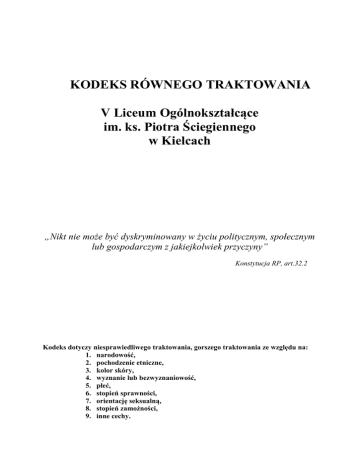 KODEKS RÓWNEGO TRAKTOWANIA V Liceum Ogólnokształcące im. ks. Piotra Ściegiennego w Kielcach „Nikt nie może być dyskryminowany w życiu politycznym, społecznym lub gospodarczym z jakiejkolwiek przyczyny” Konstytucja RP, art.32.2 Kodeks dotyczy niesprawiedliwego traktowania, gorszego traktowania ze względu na: 1. narodowość, 2. pochodzenie etniczne, 3. kolor skóry, 4. wyznanie lub bezwyznaniowość, 5. płeć, 6. stopień sprawności, 7. orientację seksualną, 8. stopień zamożności, 9. inne cechy. Kodeks Równego Traktowania V Liceum Ogólnokształcące im. ks. Piotra Ściegiennego w Kielcach Spis treści Treść kodeksu Równego Traktowania V Liceum Ogólnokształcącego im. ks. Piotra Ściegiennego w Kielcach ........................................................................................................... 2 Cel Kodeksu ............................................................................................................................... 3 Działania Antydyskryminacyjne w Szkole. ............................................................................... 4 Pełnomocnik Dyrekcji Ds. Równego Traktowania: ................................................................... 5 Kontakt ................................................................................................................................... 5 Zadania ................................................................................................................................... 5 Przepisy Końcowe Kodeksu....................................................................................................... 6 Informacje Ogólne...................................................................................................................... 7 ABC antydyskryminacji - przydatne definicje ....................................................................... 7 Równouprawnienie............................................................................................................. 7 Równość ............................................................................................................................. 7 Stereotyp ............................................................................................................................. 7 Uprzedzenie ........................................................................................................................ 7 Dyskryminacja ................................................................................................................... 7 Rodzaje dyskryminacji ........................................................................................................... 8 Ageizm (czyt. ejdżyzm) ...................................................................................................... 8 Ableizm (czyt. ablejsm) ..................................................................................................... 8 Antysemityzm .................................................................................................................... 8 Dyskryminacja wielokrotna ............................................................................................... 9 Homofobia .......................................................................................................................... 9 Islamofobia ......................................................................................................................... 9 Klasizm............................................................................................................................... 9 Ksenofobia ....................................................................................................................... 10 Rasizm .............................................................................................................................. 10 Romofobia ........................................................................................................................ 10 Seksizm ............................................................................................................................ 10 Podstawy Prawne ..................................................................................................................... 11 Konwencja w sprawie zwalczania dyskryminacji w dziedzinie oświaty ............................. 11 Sytuacja prawna w Polsce dotycząca dyskryminacji ........................................................... 16 Konstytucja Rzeczypospolitej Polskiej ............................................................................ 16 Kodeks Karny ................................................................................................................... 16 Kodeks Pracy.................................................................................................................... 17 Ustawa o wdrożeniu niektórych przepisów Unii Europejskiej w zakresie równego traktowania. ...................................................................................................................... 17 Żródło ................................................................................... Błąd! Nie zdefiniowano zakładki. 1 Kodeks Równego Traktowania V Liceum Ogólnokształcące im. ks. Piotra Ściegiennego w Kielcach Treść kodeksu Równego Traktowania V Liceum Ogólnokształcącego im. ks. Piotra Ściegiennego w Kielcach „My, kadra pedagogiczna, pracownicy i pracownice, uczniowie i uczennice oraz rodzice i opiekunowie prawni V Liceum Ogólnokształcącego im. ks. Piotra Ściegiennego w Kielcach, oświadczamy, że respektujemy obowiązujące w Polsce przepisy dotyczące przeciwdziałania dyskryminacji i równego traktowania oraz dokładamy wszelkich starań, aby zapewnić ich przestrzeganie w naszej szkole. Zdajemy sobie sprawę, że niektóre osoby i grupy społeczne w Polsce doświadczają niesprawiedliwego, gorszego traktowania ze względu na narodowo