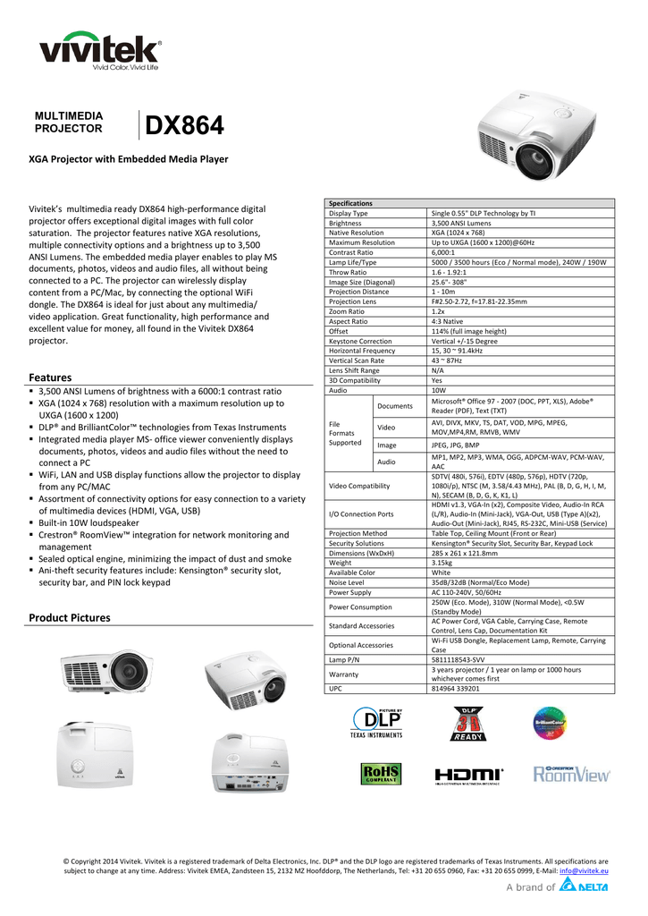 MULTIMEDIA PROJECTOR DX864 XGA Projector with Embedded Media Player Vivitek’s multimedia ready DX864 high-performance digital projector offers exceptional digital images with full color saturation. The projector features native XGA resolutions, multiple connectivity options and a brightness up to 3,500 ANSI Lumens. The embedded media player enables to play MS documents, photos, videos and audio files, all without being connected to a PC. The projector can wirelessly display content from a PC/Mac, by connecting the optional WiFi dongle. The DX864 is ideal for just about any multimedia/ video application. Great functionality, high performance and excellent value for money, all found in the Vivitek DX864 projector. Features 3,500 ANSI Lumens of brightness with a 6000:1 contrast ratio XGA (1024 x 768) resolution with a maximum resolution up to UXGA (1600 x 1200) DLP® and BrilliantColor™ technologies from Texas Instruments Integrated media player MS- office viewer conveniently displays documents, photos, videos and audio files without the need to connect a PC WiFi, LAN and USB display functions allow the projector to display from any PC/MAC Assortment of connectivity options for easy connection to a variety of multimedia devices (HDMI, VGA, USB) Built-in 10W loudspeaker Crestron® RoomView™ integration for network monitoring and management Sealed optical engine, minimizing the impact of dust and smoke Ani-theft security features include: Kensington® security slot, security bar, and PIN lock keypad Specifications Display Type Brightness Native Resolution Maximum Resolution Contrast Ratio Lamp Life/Type Throw Ratio Image Size (Diagonal) Projection Distance Projection Lens Zoom Ratio Aspect Ratio Offset Keystone Correction Horizontal Frequency Vertical Scan Rate Lens Shift Range 3D Compatibility Audio Documents File Formats Supported Video AVI, DIVX, MKV, TS, DAT, VOD, MPG, MPEG, MOV,MP4,RM, RMVB, WMV Image JPEG, JPG, BMP Audio Video Compatibility I/O Connection Ports Projection Method Security Solutions Dimensions (WxDxH) Weight Available Color Noise Level Power Supply Power Consumption Product Pictures Standard Accessories Optional Accessories Lamp P/N Warranty UPC Single 0.55" DLP Technology by TI 3,500 ANSI Lumens XGA (1024 x 768) Up to UXGA (1600 x 1200)@60Hz 6,000:1 5000 / 3500 hours (Eco / Normal mode), 240W / 190W 1.6 - 1.92:1 25.6"- 308" 1 - 10m F#2.50-2.72, f=17.81-22.35mm 1.2x 4:3 Native 114% (full image height) Vertical +/-15 Degree 15, 30 ~ 91.4kHz 43 ~ 87Hz N/A Yes 10W Microsoft® Office 97 - 2007 (DOC, PPT, XLS), Adobe® Reader (PDF), Text (TXT) MP1, MP2, MP3, WMA, OGG, ADPCM-WAV, PCM-WAV, AAC SDTV( 480i, 576i), EDTV (480p, 576p), HDTV (720p, 1080i/p), NTSC (M, 3.58/4.43 MHz), PAL (B, D, G, H, I, M, N), SECAM (B, D, G, K, K1, L) HDMI v1.3, VGA-In (x2), Composite Video, Audio-In RCA (L/R), Audio-In (Mini-Jack), VGA-Out, USB (Type A)(x2), Audio-Out (Mini-Jack), RJ45, RS-232C, Mini-USB (Service) Table Top, Ceiling Mount (Front or Rear) Kensington® Security Slot, Security Bar, Keypad Lock 285 x 261 x 121.8mm 3.15kg White 35dB/32dB (Normal/Eco Mode) AC 110-240V, 50/60Hz 250W (Eco. Mode), 310W (Normal Mode), <0.5W (Standby Mode) AC Power Cord, VGA Cable, Carrying Case, Remote Control, Lens Cap, Documentation Kit Wi-Fi USB Dongle, Replacement Lamp, Remote, Carrying Case 5811118543-SVV 3 years projector / 1 year on lamp or 1000 hours whichever comes first 814964 339201 © Copyright 2014 Vivitek. Vivitek is a registered trademark of Delta Electronics, Inc. DLP® and the DLP logo are registered trademarks of Texas Instruments. All specifications are subject to change at any time. Address: Vivitek EMEA, Zandsteen 15, 2132 MZ Hoofddorp, The Netherlands, Tel: +31 20 655 0960, Fax: +31 20 655 0999, E-Mail: [email protected]