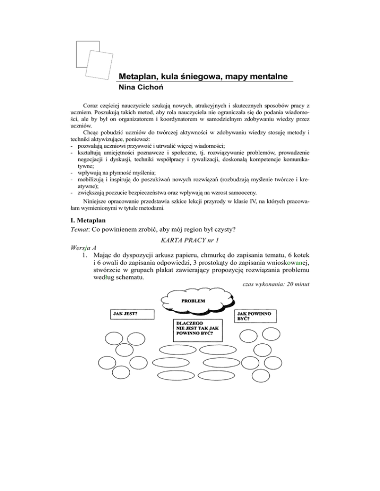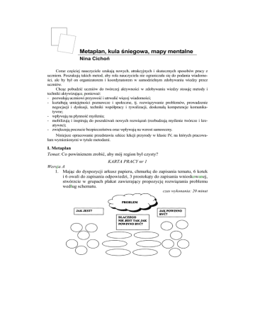 Metaplan, kula śniegowa, mapy mentalne Nina Cichoń Coraz częściej nauczyciele szukają nowych, atrakcyjnych i skutecznych sposobów pracy z uczniem. Poszukują takich metod, aby rola nauczyciela nie ograniczała się do podania wiadomości, ale by był on organizatorem i koordynatorem w samodzielnym zdobywaniu wiedzy przez uczniów. Chcąc pobudzić uczniów do twórczej aktywności w zdobywaniu wiedzy stosuję metody i techniki aktywizujące, ponieważ: - pozwalają uczniowi przyswoić i utrwalić więcej wiadomości; - kształtują umiejętności poznawcze i społeczne, tj. rozwiązywanie problemów, prowadzenie negocjacji i dyskusji, techniki współpracy i rywalizacji, doskonalą kompetencje komunikatywne; - wpływają na płynność myślenia; - mobilizują i inspirują do poszukiwań nowych rozwiązań (rozbudzają myślenie twórcze i kreatywne); - zwiększają poczucie bezpieczeństwa oraz wpływają na wzrost samooceny. Niniejsze opracowanie przedstawia szkice lekcji przyrody w klasie IV, na których pracowałam wymienionymi w tytule metodami. I. Metaplan Temat: Co powinienem zrobić, aby mój region był czysty? KARTA PRACY nr 1 Wersja A 1. Mając do dyspozycji arkusz papieru, chmurkę do zapisania tematu, 6 kotek i 6 owali do zapisania odpowiedzi, 3 prostokąty do zapisania wnioskowanej, stwórzcie w grupach plakat zawierający propozycję rozwiązania problemu według schematu. czas wykonania: 20 minut Nina Cichoń WNIOSKI .................................................................................................................................. .................................................................................................................................. .................................................................................................................................. 2. Wybierzcie lidera grupy, który przedstawi propozycję rozwiązania problemu. 3. Sporządźcie notatkę, zapisując nioski w zeszycie. WERSJA B 1. Mając do dyspozycji kartony i kredki wykonajcie w grupach plakat zawierający propozycję rozwiązania problemu według schematu czas pracy: 20 minut JAK JEST? DLACZEGO NIE JEST TAK, JAK POWINNO? JAK POWINNO BYĆ? 2. Wybierzcie lidera grupy, który przedstawi propozycję rozwiązania problemu. WNIOSEK: Uczniowie na przygotowanym przez nauczyciela materiale pracowali krócej i stworzyli więcej danych. Zaangażowanie twórcze i emocjonalne pracujących uczniów z wykorzystaniem kredek i kartonów było o wiele większe. II. Kula śniegowa Temat: Jak należy dbać o zdrowie? KARTA PRAC nr 2 1. Z podanego wykazu: Co wpływa na nasze zdrowie? – wybierz 10 najważniejszych Twoim zdaniem czynników. 2. W parze z kolegą (koleżanką) na drodze negocjacji z 20 czynników wybierzcie 10 wspólnych – waszym zdaniem – najważniejszych. 3. Pary połączcie w grupy 4-osobowe, sprawdźcie, które czynniki są wspólne i przedstawcie z 40 czynników – 10 najważniejszych. 4. Porównajcie wyniki grup 4-osobowych z całej klasy. 5. Sporządź notatkę, wpisując 10 najważniejszych czynników mających wpływ na zdrowie człowieka. Co wpływa na nasze zdrowie? – lista czynników 1. Spożywanie margaryny. 2. Sprawdzanie daty produkcji i terminu ważności na opakowaniu. 3. Kupowanie tanich produktów spożywczych nieznanego pochodzenia. 4. Urozmaicona dieta. 5. Wypoczynek czynny. 6. Częste przebywanie na świeżym powietrzu. 7. Codzienna kąpiel. 8. Mycie zębów po każdym posiłku. Metaplan, kula śniegowa i mapy mentalne 9. Dbanie o higienę osobistą i otoczenia. 10. Palenie papierosów. 11. Nie używanie narkotyków. 12. Stwarzanie miłej atmosfery. 13. Spożywanie owoców i warzyw gotowanych. 14. Częste oglądanie telewizji. 15. Przebywanie w zatłoczonych miejscach. 16. Zanieczyszczenie środowiska. 17. Spożywanie dużej ilości słodyczy. 18. Częste przejadanie się. 19. Spożywanie posiłków gorących. 20. Spożywanie posiłków zimnych. 21. Częste odkurzanie i wietrzenie pomieszczeń. 22. Spożywanie owoców i warzyw w postaci surówek. 23. Spożywanie potraw o małej zawartości tłuszczów. 24. Stosowanie diet odchudzających. 25. Hałas. 26. Codzienna zmiana bielizny osobistej. 27. Zabawy z przygodnie spotkanymi zwierzętami 28. Niedojadanie. 29. Hartowanie organizmu. 30. Spożywanie 4-5 posiłków dziennie. 31. Codzienne spacery. 32. Spożywanie chipsów, hamburgerów, coca-coli. 33. Miła atmosfera podczas spożywania posiłków. 34. Akceptacja grupy rówieśniczej. 35. Stres. 36. 0chrona naturalnego środowiska. III. Mapy mentalne Temat: Pojęcie zdrowia i choroby 1. 2. 3. 4. 5. 6. KARTA PRACY nr 3 W grupach 4 osobowych wylosujcie jeden z tematów: - zdrowe środowisko, - zdrowe społeczeństwo, - zdrowy dom, - zdrowy człowiek. W kopertach znajdują się kolorowe kartki. Na każdej z nich wpisz pojedyncze skojarzenia związane z tym tematem. Praca w grupie, wymieszanie kartek i porządkowanie w zbiory. Mając do dyspozycji kartki ze skojarzeniami, flamastry i papier opracujcie mapę pojęć (poster) poprzez przyklejanie kartek i rysowanie. Zaprezentujcie swój poster. Uzupełnij wiadomości z podręcznika, podając definicję zdrowia według Organizacji WHO. Nina Cichoń Notatka w zeszycie: Spostrzeżenia po przeprowadzonych zajęciach Początkowo praca z uczniami metodami aktywizującymi była trudna. Nie potrafili bez ingerencji nauczyciela wysłuchać nawzajem swoich wypowiedzi, właściwie przeprowadzić dyskusji, każdy chciał mówić w danej chwili. Jednym słowem panował chaos. Problemy były również ze sporządzeniem notatki w innej formie, dla uczniów nietypowej np. w postaci graficznej – metaplanu. Na plakacie dominowały szczegóły i szczególiki. Lekcja 45 minutowa była za krótka. Z biegiem czasu zdobyli doświadczenia, w grupach zapanowała zdrowa rywalizacja, uczniowie nauczyli się dyskutować i słuchać innych. Podczas pracy byli zdyscyplinowani, prześcigający się w różnego