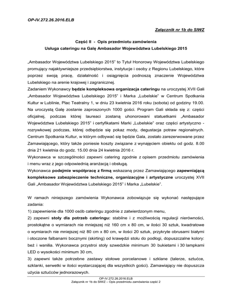 OP-IV.272.26.2016.ELB Załącznik nr 1b do SIWZ Część II - Opis przedmiotu zamówienia Usługa cateringu na Galę Ambasador Województwa Lubelskiego 2015 „Ambasador Województwa Lubelskiego 2015” to Tytuł Honorowy Województwa Lubelskiego promujący najaktywniejsze przedsiębiorstwa, instytucje i osoby z Regionu Lubelskiego, które poprzez swoją pracę, działalność i osiągnięcia podnoszą znaczenie Województwa Lubelskiego na arenie krajowej i zagranicznej. Zadaniem Wykonawcy będzie kompleksowa organizacja cateringu na uroczystej XVII Gali „Ambasador Województwa Lubelskiego 2015” i Marka „Lubelskie” w Centrum Spotkania Kultur w Lublinie, Plac Teatralny 1, w dniu 23 kwietnia 2016 roku (sobota) od godziny 19.00. Na uroczystą Galę zostanie zaproszonych 1000 gości. Program Gali składa się z: części oficjalnej, podczas której laureaci zostaną uhonorowani statuetkami „Ambasador Województwa Lubelskiego 2015” i certyfikatami Marki „Lubelskie” oraz części artystyczno rozrywkowej podczas, której odbędzie się pokaz mody, degustacja potraw regionalnych. Centrum Spotkania Kultur, w którym odbywać się będzie Gala, zostało zarezerwowane przez Zamawiającego, który także poniesie koszty związane z wynajęciem obiektu od godz. 8.00 dnia 21 kwietnia do godz. 15.00 dnia 24 kwietnia 2016 r. Wykonawca w szczególności zapewni catering zgodnie z opisem przedmiotu zamówienia i menu wraz z jego odpowiednią aranżacją i obsługą. Wykonawca podejmie współpracę z firmą wskazaną przez Zamawiającego zapewniającą kompleksowe zabezpieczenie techniczne, organizacyjne i artystyczne uroczystej XVII Gali „Ambasador Województwa Lubelskiego 2015” i Marka „Lubelskie”. W ramach niniejszego zamówienia Wykonawca zobowiązuje się wykonać następujące zadania: 1) zapewnienie dla 1000 osób cateringu zgodnie z zatwierdzonym menu, 2) zapewni stoły dla potrzeb cateringu: stabilne i z możliwością regulacji nierówności, prostokątne o wymiarach nie mniejszej niż 160 cm x 80 cm, w ilości 30 sztuk, kwadratowe o wymiarach nie mniejszej niż 80 cm x 80 cm, w ilości 20 sztuk, przykryte obrusami białymi i otoczone falbanami bocznymi (skirting) od krawędzi stołu do podłogi, dopuszczalne kolory: beż i wanilia. Wykonawca przystroi stoły szwedzkie minimum 30 bukietami i 30 lampkami LED o wysokości minimum 30 cm, 3) zapewni także potrzebne zastawy stołowe porcelanowe i szklane (talerze, sztućce, szklanki, serwetki w ilości wystarczającej dla wszystkich gości). Zamawiający nie dopuszcza użycia sztućców jednorazowych. OP-IV.272.26.2016.ELB Załącznik nr 1b do SIWZ – Opis przedmiotu zamówienia część 2 4) zapewni obsługę cateringową (kelnerską) w ilości nie mniejszej niż 30 kelnerów- obsługa kelnerska od początku do ostatniego gościa, 5) zapewni także niezbędne urządzenia gastronomiczne do serwowania potraw na gorąco, pater do serwowania posiłków i innego niezbędnego wyposażenia w ilościach pozwalających na nieograniczony dostęp do potraw. 6) Wykonawca zadba o czystość w miejscu i podczas świadczenia usługi cateringu oraz uprzątnie miejsca po zakończeniu usługi. 7) Menu na uroczystą Galę z okazji 17. edycji Ambasadora Województwa Lubelskiego dla 1000 osób, w dniu 23 kwietnia 2016 r. w Centrum Spotkania Kultur w Lublinie. Całość menu podana w formie szwedzkiego bufetu. ILOŚĆ NAZWA DANIA WAGA PORCJI PORCJI (ml/g) DANIA GORĄCE W PODGRZEWACZACH 1.Zupa serowa na winie z grzankami 400 200 2.Krem z pieczonych pomidorów 400 200 250 100 250 100 5.Kurczak z warzywami i ryżem 250 100 6.Kus Kus z warzywami 250 150 7.Ziemniaki opiekane 250 150 8.Warzywa: brokuł, marchewka, kalafior 250 150 Rydze w galarecie 100 100 Śledź w sosie czosnkowym 100 100 Rolada ze szczupaka 100 100 Karp pieczony po kaszubsku 100 100 Terina z soli, pstrąga i łososia 100 100 Bukiet mięs wędzonych i pieczonych 200 100 Cielęcina w sosie tuńczykowym 100 100 Pierś kacza w sosie żurawinowym 100 100 Pasztet z rydzami i kawałkami indyka 100 100 Kurczak w sosie curry 100 100 100 100 z kurczakiem i groszkiem ptysiowym 3.Dorsz w sosie z porów z domieszką białego wina 4.Polędwiczki wieprzowe w sosie borowikowym STÓŁ SZWEDZKI Roladki z kurczaka nadziewane susz. pomidorami i mozarellą OP-IV.272.26.2016.ELB Załącznik nr 1b do SIWZ – Opis przedmiotu zamówienia część 2 Volevunte z nadzieniami 150 50 Sery żółte i pleśniowe z winogronem 100 100 Sałatka grecka z fetą 100 100 Sałatka nicejska z tuńczykiem 100 100 100 100 jajkiem przepiórczym i szparagami 100 100 Pikle (pieczarka, papryka, ogórek 100 100 Sosy - trzy rodzaje 150 100 Pieczywo – trzy rodzaje 650 Sałatka z kurczaka z pomidorkami koktajlowymi i kuleczkami mozarelli Mix sałat z wędzonym łososiem, STÓŁ „SMAKI LUBELSZCZYZNY” Forszmak Lubelski 100 200 Żur na zakwasie z wędzonką i jajkiem 100 200 Prażucha (lemieszka) z boczkiem i cebulą 80 200 Pierogi ruskie 100 100 Pierogi z kapustą i grzybami 100 100 Łupcie z kaszą gryczaną 80 200 Naleśniki ze szpinakiem 80 100 Kartacze 80 100 Bigos staropolski 300 100 Klopsiki z kaszą jaglaną 400 100 Pieróg jaglany 80 100 Pieróg gryczany 50 100 Podpłomyki, cebularze 400 0,80 STÓŁ DESEROWY I NAPOJE Owoce 500 100 Soki (pomarańczowy, jabłkowy, grejpfrutowy) 400 1000 Woda mineralna 400 1000 Kawa, herbata serwowana w dwóch punktach (serwisach) bez limitu nie mniej niż 1000 porcji OP-IV.272.26.2016.ELB Załącznik nr 1b do SIWZ – Opis przedmiotu zamówienia część 2