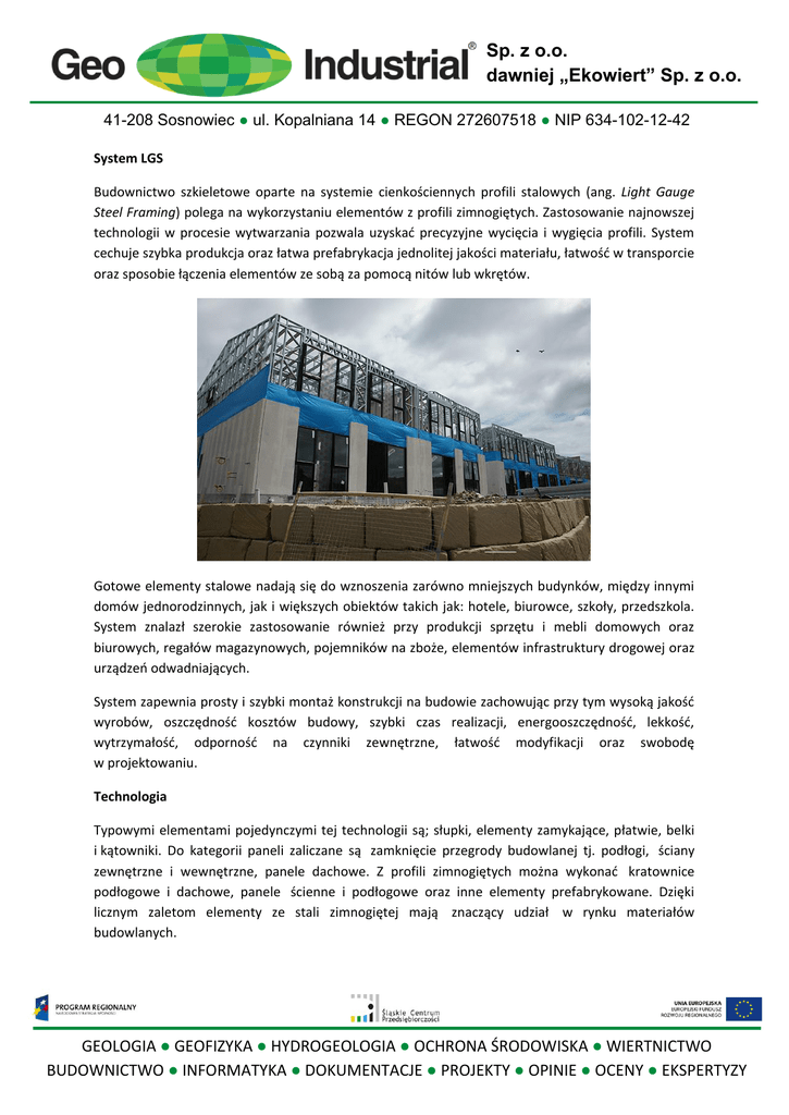 Sp. z o.o. dawniej „Ekowiert” Sp. z o.o. 41-208 Sosnowiec ● ul. Kopalniana 14 ● REGON 272607518 ● NIP 634-102-12-42 System LGS Budownictwo szkieletowe oparte na systemie cienkościennych profili stalowych (ang. Light Gauge Steel Framing) polega na wykorzystaniu elementów z profili zimnogiętych. Zastosowanie najnowszej technologii w procesie wytwarzania pozwala uzyskad precyzyjne wycięcia i wygięcia profili. System cechuje szybka produkcja oraz łatwa prefabrykacja jednolitej jakości materiału, łatwośd w transporcie oraz sposobie łączenia elementów ze sobą za pomocą nitów lub wkrętów. Gotowe elementy stalowe nadają się do wznoszenia zarówno mniejszych budynków, między innymi domów jednorodzinnych, jak i większych obiektów takich jak: hotele, biurowce, szkoły, przedszkola. System znalazł szerokie zastosowanie również przy produkcji sprzętu i mebli domowych oraz biurowych, regałów magazynowych, pojemników na zboże, elementów infrastruktury drogowej oraz urządzeo odwadniających. System zapewnia prosty i szybki montaż konstrukcji na budowie zachowując przy tym wysoką jakośd wyrobów, oszczędnośd kosztów budowy, szybki czas realizacji, energooszczędnośd, lekkośd, wytrzymałośd, odpornośd na czynniki zewnętrzne, łatwośd modyfikacji oraz swobodę w projektowaniu. Technologia Typowymi elementami pojedynczymi tej technologii są; słupki, elementy zamykające, płatwie, belki i kątowniki. Do kategorii paneli zaliczane są zamknięcie przegrody budowlanej tj. podłogi, ściany zewnętrzne i wewnętrzne, panele dachowe. Z profili zimnogiętych można wykonad kratownice podłogowe i dachowe, panele ścienne i podłogowe oraz inne elementy prefabrykowane. Dzięki licznym zaletom elementy ze stali zimnogiętej mają znaczący udział w rynku materiałów budowlanych. GEOLOGIA ● GEOFIZYKA ● HYDROGEOLOGIA ● OCHRONA ŚRODOWISKA ● WIERTNICTWO BUDOWNICTWO ● INFORMATYKA ● DOKUMENTACJE ● PROJEKTY ● OPINIE ● OCENY ● EKSPERTYZY Sp. z o.o. dawniej „Ekowiert” Sp. z o.o. 41-208 Sosnowiec ● ul. Kopalniana 14 ● REGON 272607518 ● NIP 634-102-12-42 W systemie LGS główny moduł konstrukcyjny wynosi 600mm. W zależności od rodzaju obciążenia obiektu wykorzystujemy profile o wysokości środnika: 75mm; 89mm oraz 150mm. W naszej technologii wykonujemy ściany nośne o współczynniku przenikania ciepła U≤0,22W/(mK), podłogi na gruncie U≤0,25W/(mK) oraz dachu U≤0,20W/(mK). Technologia LGS przystosowana jest również do budowy obiektów niskoenergetycznych oraz pasywnych o zużyciu energii mniejszej niż 10kWh/m2rok. Dzięki czemu możliwe jest pozyskanie dofinansowania z NFOŚiGW (Narodowy Fundusz Ochrony Środowiska i Gospodarki Wodnej). Przegrody budowlane Standardowe przegrody ścienne projektowane są tak, aby wyeliminowad wystąpienie mostków cieplnych. Pomiędzy profile stalowe stosujemy wełnę mineralną o niskim współczynniku przenikania ciepła. Następnie stosujemy folię paroprzepuszczalną oraz płyty OSB do których przyklejany jest styropian wykooczony tynkiem. Od strony wewnętrznej przegrody stosujemy folię paroszczelną oraz płyty kartonowo-gipsowe. Jako przegrody dachu stosujemy od wewnątrz płyty kartonowo-gipsowe. Zaletą przegród budowlanych w systemie LGS jest ich stosunkowo nieduża grubośd przegrody do jej parametrów cieplnych dzięki czemu możliwe jest zwiększenie powierzchni użytkowej obiektu nie zwiększając powierzchni zabudowy budynku. Budownictwo socjalne System Light Gauge Steel Framing idealnie nadaje się pod tanie budownictwo socjalne i komunalne. Dzięki powtarzalności systemu, szybkiej prefabrykacji oraz doświadczonej kadry jesteśmy w bardzo krótkim czasie wybudowad osiedla mieszkaniowe. Nasza technologia pozwala na szybką i sprawną budowę obiektów do trzech kondygnacji włącznie. GEOLOGIA ● GEOFIZYKA ● HYDROGEOLOGIA ● OCHRONA ŚRODOWISKA ● WIERTNICTWO BUDOWNICTWO ● INFORMATYKA ● DOKUMENTACJE ● PROJEKTY ● OPINIE ● OCENY ● EKSPERTYZY