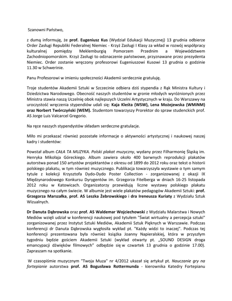 Szanowni Państwo, z dumą informuję, że prof. Eugeniusz Kus (Wydział Edukacji Muzycznej) 13 grudnia odbierze Order Zasługi Republiki Federalnej Niemiec -‐ Krzyż Zasługi I Klasy za wkład w rozwój współpracy kulturalnej pomiędzy Meklemburgią Pomorzem Przednim a Województwem Zachodniopomorskim. Krzyż Zasługi to odznaczenie państwowe, przyznawane przez prezydenta Niemiec. Order zostanie wręczony profesorowi Eugeniuszowi Kusowi 13 grudnia o godzinie 11.30 w Schwerinie. Panu Profesorowi w imieniu społeczności Akademii serdecznie gratuluję. Troje studentów Akademii Sztuki w Szczecinie odbiera dziś stypendia z Rąk Ministra Kultury i Dziedzictwa Narodowego. Obecność naszych studentów w gronie młodych wyróżnionych przez Ministra stawia naszą Uczelnię obok najlepszych Uczelni Artystycznych w kraju. Do Warszawy na uroczystość wręczenia stypendiów udali się: Kaja Kleśta (WSW), Lena Możejewska (WMiNM) oraz Norbert Twórczyński (WEM). Studentom towarzyszy Prorektor do spraw studenckich prof. AS Jorge Luis Valcarcel Gregorio. Na ręce naszych stypendystów składam serdeczne gratulacje. Miło mi przekazać również pozostałe informacje o aktywności artystycznej i naukowej naszej kadry i studentów: Powstał album CAŁA TA MUZYKA. Polski plakat muzyczny, wydany przez Filharmonię Śląską im. Henryka Mikołaja Góreckiego. Album zawiera około 400 barwnych reprodukcji plakatów autorstwa ponad 150 artystów projektantów z okresu od 1899 do 2012 roku oraz tekst o historii polskiego plakatu, w tym również muzycznego. Publikacja towarzyszyła wystawie o tym samym tytule z kolekcji Krzysztofa Dydo-‐Dydo Poster Collection -‐ zorganizowanej z okazji IX Międzynarodowego Konkursu Dyrygentów im. Grzegorza Fitelberga w dniach 16-‐25 listopada 2012 roku w Katowicach. Organizatorzy przewidują liczne wystawy polskiego plakatu muzycznego na całym świecie. W albumie jest wiele plakatów pedagogów Akademii Sztuki: prof. Grzegorza Marszałka, prof. AS Leszka Żebrowskiego i dra Ireneusza Kuriaty z Wydziału Sztuk Wizualnych. Dr Danuta Dąbrowska oraz prof. AS Waldemar Wojciechowski z Wydziału Malarstwa i Nowych Mediów wzięli udział w konferencji naukowej pod tytułem "Świat wirtualny a percepcja sztuki" zorganizowanej przez Instytut Sztuki Mediów, Akademii Sztuk Pięknych w Warszawie. Podczas konferencji dr Danuta Dąbrowska wygłosiła wykład pt. "Każdy widzi to inaczej". Podczas tej konferencji prezentowana była również książka Joanny Napieralskiej, która w przyszłym tygodniu będzie gościem Akademii Sztuki (wykład otwarty pt. „SOUND DESIGN droga emancypacji dźwięków filmowych” odbędzie się w czwartek 13 grudnia o godzinie 17.00). Zapraszam na spotkanie. W czasopiśmie muzycznym "Twoja Muza" nr 4/2012 ukazał się artykuł pt. Nauczanie gry na fortepianie autorstwa prof. AS Bogusława Rottermunda -‐ kierownika Katedry Fortepianu Wydziału Instrumentalnego. To kolejny przyczynek tego autora do rozważań nad problematyką stosowanych metod w nauczaniu gry na fortepianie. Zachęcam do lektury. W programie TVP Kultura zostały zaprezentowane filmy studentów Katedry Nowych Mediów Wydziału Malarstwa i Nowych Mediów Akademii Sztuki w Szczecinie. Projekcje te odbywają się w ramach cyklu VIDEOGALERIE TVP Kultura. 3 grudnia o godzinie 23:05 prezentowane były: Agnieszka Miężał -‐ bardzo lubię kiedy moje włosy dotykają moich pleców Lonia Kaniuk -‐ spalam się Aleksandra Rydzkowska -‐ Dr Jekyl & Mr Hyde Aleksander Kühl – przemówienie Lena Możejewska -‐ spalam się Tina Siuda – hipertekst Agnieszka Soseńska 230V Małgorzata Goliszewska – ubierz mnie Zapraszam do oglądania kolejnych pokazów: 10 grudnia 00:00 Agata Piasecka – hipertekst Mikołaj Tkacz -‐ rysunki, które zrobiłem w manii Magdalena Sakowska-‐Carło -‐ spalam się Lidia Sapińska -‐ królowa o pracy Mikołaj Tkacz -‐ Dr Jekyl Mr Hyde Lonia Kaniuk i Lidia Sapińska – kawka Magdalena Sakowska-‐Carło – MJMH Małgorzata Goliszewska -‐ choose life Tatiana Pancewicz -‐ Dream Gertrud Rafał Żarski -‐ Studium Ciemności 17 grudnia 22:55 Mikołaj Tkacz -‐ użycie mechanizmu pistoletu w życiu form biologicznych Aleksander Kühl – dada Mariusz Samól – 152 Magdalena Sakowska-‐Carło – przemówienie Magdalena Sakowska-‐ Carło – 2012 Lidia Sapińska -‐ królowa o terroryzmie Krzysztof Arciszewski – performance Karolina Mełnicka -‐ webcam love Aleksandra Jasek – praconalizm Mariusz Samól -‐ spalam się W przyszłości w cyklu VIDEOGALERIE TVP Kultura prezentowane będą również filmy wykładowców AS w Szczecinie. Załączam też spis aktualnych wystaw wykładowców Wydziału Malarstwa i Nowych Mediów: Kamil Kuskowski 1ª Bienal de Montevideo, El Gran Sur The Cabilido in Montevideo Biennial 2012 wystawa do 24.12.2012 Montevideo, Urugwaj Artur Malewski Kwiatki bratki i stokrotki wystawa do 23.12.2012 Galeria Wymiany, Łódź Artur Malewski Mieszańce, bastardy, hybrydy, chimery oraz kilka mutantów 15.12.12-‐ 04.02.2013 Muzeum Rzeźby Współczesnej, CRP Orońsko Artur Malewski Przebudzenie -‐ przed końcem świata 08.12.2012, godz. 18:00 Galeria EL, Elbląg Aleksandra Ska Korespondencje. Sztuka nowoczesna i uniwersalizm wernisaż: 14.12.2012, godz. 18:00 wystawa: 14.12.2012 – 30.12.2013 ms2, Łódź Aleksandra Ska Kwiatki bratki i stokrotki wystawa do 23.12.2012 Galeria Wymiany, Łódź