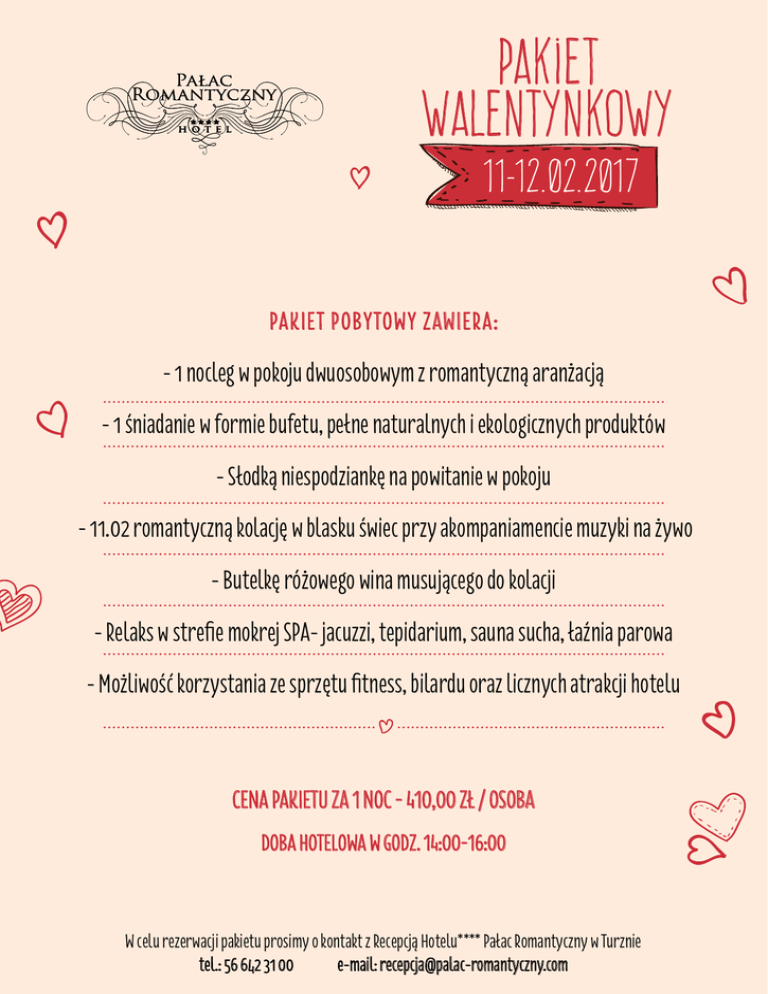 Pakiet Walentynkowy 11-12.02.2017 PAKIET POBYTOWY ZAWIERA: - 1 nocleg w pokoju dwuosobowym z romantyczną aranżacją - 1 śniadanie w formie bufetu, pełne naturalnych i ekologicznych produktów - Słodką niespodziankę na powitanie w pokoju - 11.02 romantyczną kolację w blasku świec przy akompaniamencie muzyki na żywo - Butelkę różowego wina musującego do kolacji - Relaks w strefie mokrej SPA- jacuzzi, tepidarium, sauna sucha, łaźnia parowa - Możliwość korzystania ze sprzętu fitness, bilardu oraz licznych atrakcji hotelu CENA PAKIETU ZA 1 NOC - 410,00 ZŁ / OSOBA DOBA HOTELOWA W GODZ. 14:00-16:00 W celu rezerwacji pakietu prosimy o kontakt z Recepcją Hotelu**** Pałac Romantyczny w Turznie tel.: 56 642 31 00 e-mail: [email protected]