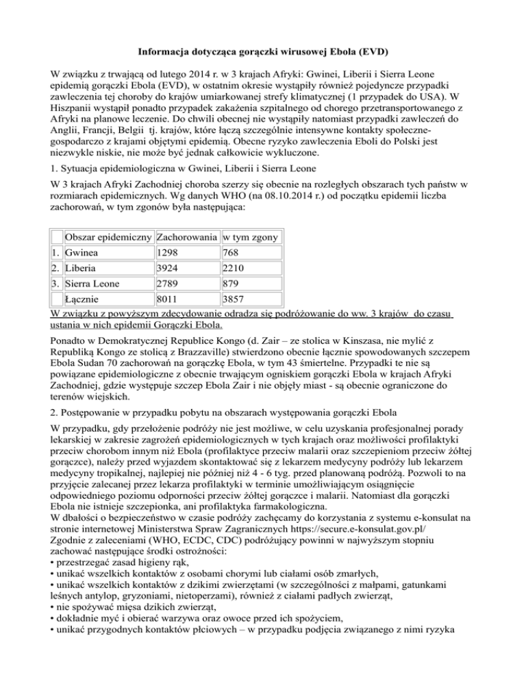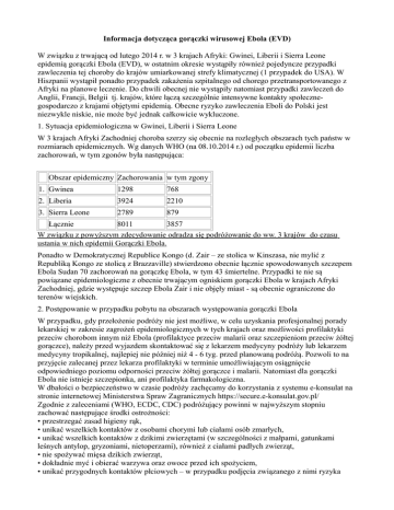 Informacja dotycząca gorączki wirusowej Ebola (EVD) W związku z trwającą od lutego 2014 r. w 3 krajach Afryki: Gwinei, Liberii i Sierra Leone epidemią gorączki Ebola (EVD), w ostatnim okresie wystąpiły również pojedyncze przypadki zawleczenia tej choroby do krajów umiarkowanej strefy klimatycznej (1 przypadek do USA). W Hiszpanii wystąpił ponadto przypadek zakażenia szpitalnego od chorego przetransportowanego z Afryki na planowe leczenie. Do chwili obecnej nie wystąpiły natomiast przypadki zawleczeń do Anglii, Francji, Belgii tj. krajów, które łączą szczególnie intensywne kontakty społecznegospodarczo z krajami objętymi epidemią. Obecne ryzyko zawleczenia Eboli do Polski jest niezwykle niskie, nie może być jednak całkowicie wykluczone. 1. Sytuacja epidemiologiczna w Gwinei, Liberii i Sierra Leone W 3 krajach Afryki Zachodniej choroba szerzy się obecnie na rozległych obszarach tych państw w rozmiarach epidemicznych. Wg danych WHO (na 08.10.2014 r.) od początku epidemii liczba zachorowań, w tym zgonów była następująca: Obszar epidemiczny Zachorowania w tym zgony 1. Gwinea 1298 768 2. Liberia 3924 2210 3. Sierra Leone 2789 879 Łącznie 8011 3857 W związku z powyższym zdecydowanie odradza się podróżowanie do ww. 3 krajów do czasu ustania w nich epidemii Gorączki Ebola. Ponadto w Demokratycznej Republice Kongo (d. Zair – ze stolica w Kinszasa, nie mylić z Republiką Kongo ze stolicą z Brazzaville) stwierdzono obecnie łącznie spowodowanych szczepem Ebola Sudan 70 zachorowań na gorączkę Ebola, w tym 43 śmiertelne. Przypadki te nie są powiązane epidemiologiczne z obecnie trwającym ogniskiem gorączki Ebola w krajach Afryki Zachodniej, gdzie występuje szczep Ebola Zair i nie objęły miast - są obecnie ograniczone do terenów wiejskich. 2. Postępowanie w przypadku pobytu na obszarach występowania gorączki Ebola W przypadku, gdy przełożenie podróży nie jest możliwe, w celu uzyskania profesjonalnej porady lekarskiej w zakresie zagrożeń epidemiologicznych w tych krajach oraz możliwości profilaktyki przeciw chorobom innym niż Ebola (profilaktyce przeciw malarii oraz szczepieniom przeciw żółtej gorączce), należy przed wyjazdem skontaktować się z lekarzem medycyny podróży lub lekarzem medycyny tropikalnej, najlepiej nie później niż 4 - 6 tyg. przed planowaną podróżą. Pozwoli to na przyjęcie zalecanej przez lekarza profilaktyki w terminie umożliwiającym osiągnięcie odpowiedniego poziomu odporności przeciw żółtej gorączce i malarii. Natomiast dla gorączki Ebola nie istnieje szczepionka, ani profilaktyka farmakologiczna. W dbałości o bezpieczeństwo w czasie podróży zachęcamy do korzystania z systemu e-konsulat na stronie internetowej Ministerstwa Spraw Zagranicznych https://secure.e-konsulat.gov.pl/ Zgodnie z zaleceniami (WHO, ECDC, CDC) podróżujący powinni w najwyższym stopniu zachować następujące środki ostrożności: • przestrzegać zasad higieny rąk, • unikać wszelkich kontaktów z osobami chorymi lub ciałami osób zmarłych, • unikać wszelkich kontaktów z dzikimi zwierzętami (w szczególności z małpami, gatunkami leśnych antylop, gryzoniami, nietoperzami), również z ciałami padłych zwierząt, • nie spożywać mięsa dzikich zwierząt, • dokładnie myć i obierać warzywa oraz owoce przed ich spożyciem, • unikać przygodnych kontaktów płciowych – w przypadku podjęcia związanego z nimi ryzyka stosować zabezpieczenia, • zrezygnować z odwiedzania miejsc bytowania nietoperzy (np. jaskiń, kopalni, schronów). W razie zachorowania w trakcie pobytu należy natychmiast poprosić o pomoc lekarską. 3. Postępowanie w przypadku wystąpienia gorączki oraz innych objawów po powrocie z obszarów występowania gorączki Ebola W przypadku wystąpienia po powrocie z Gwinei, Liberii oraz Sierra Leone co najmniej jednego z następujących objawów: • gorączka >38.5°C, nasilony, utrzymujący się ból głowy, bóle mięśni, wymioty, biegunka, ból brzucha, nie mające innych przyczyn krwawienia/wylewy krwi (np. podskórne, w obrębie błon śluzowych, siniaki) należy pozostać w domu i zadzwonić niezwłocznie pod numer 112 lub 999 w celu uzyskania od dyspozytora medycznego informacji o dalszym postępowaniu (patrz: Procedura postępowania dla dyspozytora medycznego Państwowego Ratownictwa Medycznego). 4. Sposób szerzenia się wirusa Przeniesienie wirusa Ebola następuje przez bezpośredni kontakt z krwią, wydzielinami i wydalinami osoby zakażonej. W przypadku bliskiego kontaktu z chorym twarzą w twarz - personel medyczny musi zabezpieczać twarz (błony śluzowe oczy, nosa i ust) przed przeniesieniem wirusa na bliską odległość (do 1 m) w wyniku zachlapania lub aerolizacji wydzielin chorego. Osoba zakażona staje się zakaźna dopiero po wystąpieniu objawów. Natomiast w odróżnieniu do wirusa odry, ospy wietrznej lub grypy wirus Ebola nie szerzy się drogą powietrzną. Transmisja wirusa Ebola możliwa jest również od osoby zmarłej z powodu zakażenia oraz od zakażonych/padłych zwierząt takich jak: małpy czy nietoperze. Maksymalny okres wylęgania choroby (inkubacji) wynosi do 21 dni od chwili kontaktu ze źródłem zakażenia. 5. Sytuacja epidemiologiczna w pozostałych krajach regionu: Ostatni przypadek zachorowania na gorączkę Ebola w Nigerii i Senegalu odnotowany został 31 sierpnia 2014 r. Ze względu, że od ostatniego zachorowania upłynął już czas równy najdłuższemu okresowi wylegania, należy uznać że transmisja wirusa w tych 2 krajach została przerwana. W okresie wcześniejszym w Nigerii wystąpiło łącznie 20 przypadków, w tym 8 śmiertelnych. W Senegalu odnotowano 1 przypadek. Każdorazowo przy wyjeździe należy mieć na uwadze, że obszary Afryki równikowej są terenem stałego występowania niebezpiecznych chorób tropikalnych: wirusowych gorączek krwotocznych takich jak Lassa, żółta gorączka, a także choró