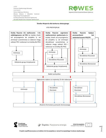 LIDER: Centrum Społecznego Rozwoju PARTNERZY: Gmina Dąbrowa Górnicza Miasto Gliwice / Gliwickie Centrum Organizacji Pozarządowych Fundacja Rozwoju Ekonomii Społecznej Ośrodek Wspierania Inicjatyw Społecznych Ścieżka Wsparcia dla konkursu dotacyjnego KTO PRZYSTĘPUJE Osoby fizyczne nie wykluczone i nie oddelegowane od PES (w każdej chwili od przystąpienia do projektu tj. od animacji/ uczestnictwa w naborze mogą założyć PES i wskoczyć na ścieżkę dla PES) Osoby fizyczne zagrożone wykluczeniem społecznym (w każdej chwili od przystąpienia do projektu tj. od animacji/ doradztwa/ uczestnictwa w naborze mogą założyć PES i wskoczyć na ścieżkę dla PES) Osoby fizyczne będące pracownikami lub wolontariuszami PES/PS Animacja Animacja Animacja Doradztwo Kluczowe Doradztwo Kluczowe Założenie grupy Inicjatywnej Doradztwo Biznesowe Założenie grupy Inicjatywnej Nabór pomysłów Ogłoszenie naboru co najmniej 15 dni roboczych Doradztwo kluczowe Doradztwo kluczowe Doradztwo Biznesowe 1 Złożenie formularzy pomysłu biznesowego Strona Animacja LIDER: Centrum Społecznego Rozwoju PARTNERZY: Gmina Dąbrowa Górnicza Miasto Gliwice / Gliwickie Centrum Organizacji Pozarządowych Fundacja Rozwoju Ekonomii Społecznej Ośrodek Wspierania Inicjatyw Społecznych Ciąg dalszy procedury konkursowej Komisja naborów pomysłów 1 ocena formalna Odstąpienie od oceny formalnej (formularz złożony po terminie) Negatywna Pozytywna Pozwolenie na uzupełnienia w ciągu 5 dni roboczych Brak pozwolenia na uzupełnienia (braki których nie można uzupełnić – np. nie kwalifikujący się podmiot) Druga ocena formalna / pierwsza ocena merytoryczna Braki formalne Uzupełnione poprawnie Ocena merytoryczna Uzupełnione niepoprawnie / brak uzupełnień Ocena negatywna 3 dni robocze na odwołania od oceny merytorycznej Ocena pozytywna Druga ocena merytoryczna Ocena pozytywna Ocena negatywna Strona 2 Ostateczne wyniki naboru LIDER: Centrum Społecznego Rozwoju PARTNERZY: Gmina Dąbrowa Górnicza Miasto Gliwice / Gliwickie Centrum Organizacji Pozarządowych Fundacja Rozwoju Ekonomii Społecznej Ośrodek Wspierania Inicjatyw Społecznych Ścieżka po naborze dla Grupa inicjatywna osób fizycznych oddelegowanych i/lub wykluczonych(w każdej chwili od przystąpienia do projektu tj. od animacji/ doradztwa/ uczestnictwa w naborze mogą założyć PES i wskoczyć na ścieżkę dla PES) Kontakt z animatorem do 7 dni roboczych po wynikach ostatecznych naboru Kontakt z doradcą kluczowym do 7 dni roboczych po wynikach ostatecznych naboru Ścieżka wsparcia zawiera co najmniej: Ścieżka wsparcia zawiera co najmniej: - wsparcie animatora min 10 h - wskazane jest 10 dni szkolenia dla osób które będą zarządzać planowanym PS ok. 50h dla min 2 osób uczestniczących w tworzeniu/rozwoju PS – o szczegółowym zakresie decyduje doradca PES ekonomizujący (w tym PES i PS założonych w ramach ROWES) PS istniejący przed przystąpieniem do ROWES Grupa inicjatywna osób fizycznych nie wykluczonych i nie oddelegowanych od PES (w każdej chwili od przystąpienia do projektu tj. od animacji/ uczestnictwa w naborze mogą założyć PES i wskoczyć na ścieżkę dla PES) - wsparcie doradcy kluczowego – wskazane jest 10 dni szkolenia dla osób które będą zarządzać planowanym PS - ok. 50h dla min 2 osób uczestniczących w tworzeniu/rozwoju PS – o szczegółowym zakresie decyduje doradca - wsparcie doradców specjalistycznych – według potrzeb UWAGA: Nie ma prawa do udzielenia wsparcia pomostowego Ścieżka wsparcia zawiera co najmniej: - wsparcie doradcy kluczowego – min 10 h - wsparcie doradcy biznesowego – min 10 h - dobrowolny udział w szkoleniach dla osób które zarządzają PS ok. 50h - wsparcie doradców specjalistycznych – według potrzeb Strona 3 Drugi etap konkursowy – ogłoszony nabór wniosków na drugi etap trwa co najmniej 15 dni roboczych (przed ogłoszeniem i w trakcie naboru trwa praca nad biznesplanem w ramach opracowanej ścieżki wsparcia) LIDER: Centrum Społecznego Rozwoju PARTNERZY: Gmina Dąbrowa Górnicza Miasto Gliwice / Gliwickie Centrum Organizacji Pozarządowych Fundacja Rozwoju Ekonomii Społecznej Ośrodek Wspierania Inicjatyw Społecznych Drugi etap konkursu dotacyjnego Komisja Oceny Wniosków 1 ocena formalna Odstąpienie od oceny formalnej (wniosek złożony po terminie) Negatywna Pozytywna Pozwolenie na uzupełnienia w ciągu 5 dni roboczych Brak pozwolenia na uzupełnienia Druga ocena formalna / pierwsza ocena merytoryczna Braki formalne Uzupełnione niepoprawnie / brak uzupełnień Uzupełnione poprawnie Ocena merytoryczna Odwołanie od oceny merytorycznej – 3 dni robocze Ocena zaakceptowana przez Wnioskodawcę Druga ocena merytoryczna Ocena pozytywna Ocena negatywna, w tym pozytywna poniżej progu punktowego przyznającego dotację Strona 4 Ostateczne wyniki konkursu LIDER: Centrum Społecznego Rozwoju PARTNERZY: Gmina Dąbrowa Górnicza Miasto Gliwice / Gliwickie Centrum Organizacji Pozarządowych Fundacja Rozwoju Ekonomii Społecznej Ośrodek Wspierania Inicjatyw Społecznych Czynności przed podpisaniem umowy dotacyjnej/ wsparcia pomostowego Do czasu podpisania umowy dotacyjnej PES i PS jest pod opieką doradcy kluczowego. Po podpisaniu umowy przechodzą pod opiekę doradcy biznesowego/opiekuna. Grupa inicjatywna osób fizycznych nie wykluczonych i nie oddelegowanych od PES (w każdej chwili od przystąpienia do projektu tj. od animacji/ uczestnictwa w naborze mogą założyć PES i wskoczyć na ścieżkę dla PES) Grupa inicjatywna osób fizycznych oddelegowanych i/lub wykluczonych(w każdej chwili od przystąpienia do projektu tj. od animacji/ doradztwa/ uczestnictwa w naborze mogą założyć PES i wskoczyć na ścieżkę dla PES) PES ekonomizujący (w tym PES i PS założonych w ramach ROWES) PS istniejący przed przystąpieniem do ROWES UWAGA: Nie ma prawa do udzielenia wsparcia pomostowego W ciągu 20 dni roboczych od ogłoszenia ostatecznych w