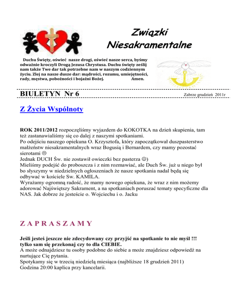 Związki Niesakramentalne Duchu Święty, oświeć nasze drogi, oświeć nasze serca, byśmy odważnie kroczyli Drogą Jezusa Chrystusa. Duchu święty ześlij nam także Twe dar tak potrzebne nam w naszym codziennym życiu. Zlej na nasze dusze dar: mądrości, rozumu, umiejętności, rady, męstwa, pobożności i bojaźni Bożej. Amen. BIULETYN Nr 6 Zabrze grudzień 2011r Z Życia Wspólnoty ROK 2011/2012 rozpoczęliśmy wyjazdem do KOKOTKA na dzień skupienia, tam też zastanawialiśmy się co dalej z naszymi spotkaniami. Po odejściu naszego opiekuna O. Krzysztofa, który zapoczątkował duszpasterstwo małżeństw niesakramentalnych wraz Bogusią i Bernardem, czy mamy pozostać sierotami Jednak DUCH Św. nie zostawił owieczki bez pasterza ☺) Mieliśmy podejść do proboszcza i z nim rozmawiać, ale Duch Św. już u niego był bo słyszymy w niedzielnych ogłoszeniach że nasze spotkania nadal będą się odbywać w kościele Sw. KAMILA. Wyrażamy ogromną radość, że mamy nowego opiekuna, że wraz z nim możemy adorować Najświętszy Sakrament, a na spotkaniach poruszać tematy specyficzne dla NAS. Jak dobrze że jesteście o. Wojciechu i o. Jacku ZAPRASZAMY Jeśli jesteś jeszcze nie zdecydowany czy przyjść na spotkanie to nie myśl !!! tylko sam się przekonaj czy to dla CIEBIE. A może odnajdziesz tu osoby podobne do siebie a może znajdziesz odpowiedź na nurtujące Cię pytania. Spotykamy się w trzecią niedzielą miesiąca (najbliższe 18 grudzień 2011) Godzina 20:00 kaplica przy kancelarii. J 15,9-11 – Trwajcie w miłości Mojej „Trwajcie w miłości Mojej” (J 15,9) Chrystus wzywa nas do zawierzenia Jego miłości. Meinate, czyli trwajcie, można też przetłumaczyć: pozostawajcie, żyjcie. W samym określeniu akcent pada, na życie, na zawierzenie, na nieustanne czerpanie z miłości Chrystusa w każdej chwili. Miłość Chrystusa powinna być dla nas punktem wyjścia, źródłem naszej tożsamości, tak jak dom, rodzina jest źródłem naszej tożsamości w życiu społecznym. Jednak aby je utrzymać, potrzebna jest modlitwa, która stale odnosi się do źródła. - Co to oznacza dla nas, którzy trwamy w związkach niesakramentalnych: Te słowa są nadzieją: - trwać to być przy Chrystusie, który nigdy nie odrzuca człowieka; - trwać to zawierzyć Mu i żyć Komunią Pragnienia; - trwać to obdarzać miłością tych z którymi żyję na co dzień - trwać to pielęgnować swoje życie duchowe (modlitwa, udział we Mszy św., adoracja Najśw. Sakramentu, osobiste nawiedzanie świątyni, udział w nabożeństwach roku liturgicznego) - trwać to czytać i rozważać Pismo Święte – (najlepiej razem w ciągu dnia lub w ramach modlitwy wieczornej) - trwać to powierzać Bogu każdy dzień; Zasadniczo jednak miłość Chrystusa do nas jest radosną nowiną, jest Ewangelią, dającą poczucie pokoju: Jeżeli Bóg z nami, któż przeciwko nam? (Rz 8,31). Niemniej przeciw tej Ewangelii pojawia się pokusa zwątpienia. - jak trwać, kiedy mam poczucie winy, że żyję w związku niesakramentalnym; - jak trwać, kiedy chciałabym przystąpić do sakramentów, a nie mogę; - jak trwać, kiedy mam wyrzuty sumienia i czuję się kimś gorszym, albo niegodnym Boga; - jak trwać, kiedy wszelkie niepowodzenia życiowe traktuję jak karę Bożą za moją niewierność; Jeśli przyjmiemy taką postawę, nasze życie zamiast trwaniem w miłości stanie się udręczeniem. W konsekwencji ciągle będziemy się obwiniać, patrzeć na siebie z pogardą i uważać się za zatwardziałych grzeszników. Nie tędy droga! Posłuchajmy Chrystusa, który daje nam odpowiedź na czym faktycznie polega owo trwanie w miłości. W Ewangelii Jezus, apelując do nas wskazuje na swoje zawierzenie Ojcu: Jak Mnie umiłował Ojciec, tak i Ja was umiłowałem. Mamy trwać w miłości Chrystusa, tak jak On trwa w miłości Ojca. Chrystus mówi o zawierzeniu Bogu na dobre i na złe. A więc nawet jeśli nie mogę przyjąć Chrystusa do serca w Komunii Świętej nie oznacza, że przestałem Go kochać; to, że żyję w związku niesakramentalnym nie czyni mnie większym grzesznikiem od innych; idąc do kościoła na niedzielną Mszę św. nie mogę mieć kompleksów, że ktoś źle o mnie pomyśli, bo choć się modlę, to jednak podczas Komunii Św. siedzę w ławce. Chcieć trwać w miłości to także poddać się próbie wiary. Trzeba ją przejść i doświadczyć. Mam pozytywnie i z nadzieją patrzeć na mój obecny stan. Związek, w którym jestem nie oddziela mnie od Boga, chyba, że ja sam do tego zdążam. Nie przeszkadza mi też w tym, żebym był dobry, wychowywał swoje dzieci po katolicku, pielęgnował tradycje chrześcijańskie, swój własny dom budował na dojrzale pojętej religijności. To jest prawdziwe trwanie w Chrystusie. Bóg mówi do nas: naucz się żyć z tym co masz i nie gardź sobą tylko dlatego, że podjąłeś taką, a nie inną decyzję. To co teraz robisz i związek w którym trwasz obecnie, nie jest Bogu obojętny. Jest ważny w „oczach Bożych”, bo tu również musisz podjąć obowiązki małżeńskie i rodzicielskie i społeczne. Trwać w Chrystusie to zrozumieć, że miłość jest większa od prawa – choć prawo trzeba przestrzegać. Skoro nie możemy według prawa kościelnego usankcjonować naszego związku to tym bardziej pokażmy Bogu, że jest On źródłem naszego życia, inspiracją do naszej miłości, więzią, która nas łączy i wspiera szczególnie w wymiarze ducha. Jezus pokazuje nam ducha, jakim żyje i takiego samego ducha nam zaleca. Mamy wejść w takie samo zawierzenie, jakie było w Nim jako człowieku, w takiego samego ducha. Jest to bardzo konkretne wezwanie. To wam powiedziałem, aby radość moja w was była i aby radość wasza była pełna (J 15,10). Duch daje radość. Trwanie w Chrystusie to radość w Duchu Świętym i niech to doświadczenie stanie się Waszym udziałem. Opracował: o. Wojciech Węglicki OSCam Świadect