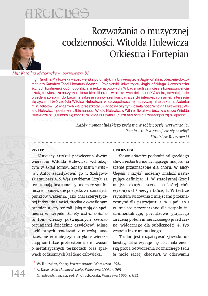 ARTICLES Rozważania o muzycznej codzienności. Witolda Hulewicza Orkiestra i Fortepian Mgr Karolina Mytkowska – doktorantk a UJ mgr Karolina Mytkowska – absolwentka polonistyki na Uniwersytecie Jagiellońskim; obec-nie doktorantka w Katedrze Teorii Literatury Wydziału Polonistyki Uniwersytetu Jagiellońskiego. Uczestniczka licznych konferencji ogólnopolskich i międzynarodowych. W badaniach zajmuje się korespondencją sztuk, a zwłaszcza muzyczno-literackimi filiacjami w pierwszych dekadach XX wieku, odwołując się przede wszystkim do badań z zakresu najnowszej kompa-ratystyki interdyscyplinarnej. Interesuje się życiem i twórczością Witolda Hulewicza, w szczególności jej muzycznymi aspektami. Autorka m.in. tekstów: „Z własnych ciał przeszkody układać na szyny” – działalność Witolda Hulewicza; Witold Hulewicz – poeta w służbie narodu; Witold Hulewicz w Wilnie; Świat wartości w wierszu Witolda Hulewicza pt. „Dziecko się modli”; Witolda Hulewicza „cisza nad ostatnią wszechpauzą sklepiona”. „Każdy moment ludzkiego życia ma w sobie poezję, wytwarza ją. Poezja – to jest prze-jęcie się chwilą” Stanisław Brzozowski Wstęp Niniejszy artykuł poświęcono dwóm wierszom Witolda Hulewicza wchodzącym w skład tomiku Sonety instrumentalne1. Autor zadedykował go T. Szeligowskiemu oraz A. S. Węsławskiemu. Liryki za temat mają instrumenty orkiestry symfonicznej, opisywane poetycko z rozmaitych punktów widzenia; jako charakterystycznej indywidualności, środka o określonym brzmieniu, czy też roli, jaką mają do spełnienia w zespole. Sonety instrumentalne to tom wierszy poświęconych szeroko rozumianej dziedzinie dźwięków2. Mimo ewidentnych powiązań z muzyką, analizowane w niniejszym artykule wiersze stają się także pretekstem do rozważań o metafizycznych tęsknotach oraz sprawach codziennych każdego człowieka. 144 Orkiestra Słowo orkiestra pochodzi od greckiego słowa orchestra oznaczającego miejsce na scenie przeznaczone dla chóru. W Encyklopedii muzyki3 możemy znaleźć następujące definicje: „1. W starożytnej Grecji miejsce okrężna scena, na której chór wykonywał śpiewy i tańce; 2. W teatrze rzymskim widownia z miejscami przeznaczonymi dla patrycjatu; 3. W I poł. XVII w. miejsce przeznaczone dla zespołu instrumentalnego, początkowo grającego za sceną potem umieszczanego przed sceną, widocznego dla publiczności; 4. Typ zespołu instrumentalnego”. Trudno jest rozpatrywać zjawisko orkiestry, która wydaje się bez mała ziemską próbą odtworzenia kosmicznego ładu (a może raczej chaosu?), w oderwaniu 1 W. Hulewicz, Sonety instrumentalne, Warszawa 1928. 2 A. Karaś, Miał zbudować wieżę, Warszawa 2003, s. 269. 3 Encyklopedia muzyki, red. A. Chodkowski, Warszawa 1995, s. 652. ARTYKUŁY od potraktowanej w największym choćby skrócie historii muzyki. A. Homa4 zadaje sobie pytania: „czy jeśli powiem, że jej [muzyki] narodziny były zarazem narodzinami chóru i orkiestry rozumianych jako grupa ludzi zjednoczonych we wspólnym wysiłku dźwiękowym – będę bardzo daleki od prawdy? Czy pierwsze improwizacje wokalne i rytmiczne na cześć: słońca, księżyca, a może udanych łowów, wykonywane wspólnie, bo stanowiące istotny element rodzącego się życia socjalnego, nie były w istocie praprzejawami obu wymienionych formacji?” Nie sposób nie zgodzić się z autorem w tej kwestii. Podobny pogląd prezentuje także Czesław Miłosz. Zaznacza bowiem, że pisząc o muzyce warto byłoby mówić nie tylko o samym dźwięku, ale także o samej czynności. Trzeba spojrzeć na orkiestrę symfoniczną albo kwartet w działaniu zwracając uwagę na to, że każdy członek współtworzący orkiestrę jest inny. Muzycy bowiem: „zebrali się z różnych dzielnic miasta, z różnych układów rodzinnych, różnych mieszkań, domów, widoków ze swego okna i razem wykonują, czy też razem poddają się rozkazowi zapisanych na papierze dźwięków. Inne są u każdego właściwości – ten łysy, tamten znów brodaty, ten chudzielec, tamta w zielonej sukni wyróżniającej się wśród faktów. Wykonują, to znaczy służą czemuś, co ma inne trwanie niż oni i inny rodzaj istnienia. Było zanim się urodzili i będzie. Słuchacze i widzowie uczestniczą w przybyciu jednodniowych istot ciepłokrwistych do krainy matematycznych proporcji, kształtów niepodległej niczemu logiki, czystych idei. Na granicy tej krainy prowadzą po strunach swoje smyczki, przyciskają klawisze fortepianu, dmą we flet i rożek myśliwski. A z tego dla nas ogromna radość, myśl o tym, jak wspaniały, bogaty u różnorodny jest ludzki świat5.” Przywołane słowa stanowią punkt wyjścia do rozważań na temat wiersza Witolda Hulewicza pt. Orkiestra6. Na wstępie podmiot liryczny zwraca się w formie apostrofy do współtowarzysza dyskusji. Być może są to także osobiste refleksje, które analizuje w myślach podczas koncertu. Zadaje następujące pytanie retoryczne: Gdy patrzysz w ciemne oczy obcego człowieka i słyszysz jego słowa, czujesz pulsu bicie, Czy możesz wiedzieć wszystko, co przyszło zdaleka i stworzyło w nim własne, przebogate życie? Muzyka orkiestry staje się tutaj w pewnym sensie hermeneutyką ludzkich doświadczeń. Nagle bowiem uświadamiamy sobie, że cała sala – publiczność i muzycy – są sobie obcy, nic o sobie nie wiedzą. Jednoczą się natomiast na kilka minut, by wspólnie przeżywać emocje, poddawać się stanom ekstazy i zamyślenia. Ciemne oczy mają wskazywać na niepewność wiążącą się z niezbadaną przestrzenią. Zmysł ten jest symbolem straży, troski, czujności. „Oczy duszy” czy „oczy serca” pozwalają na nadprzyrodzone lub wewnętrzne postrzeganie i często rekom- 4 A. Homa, Altowista, Warszawa 2009, s. 145. 5 Cz. Miłosz, Piesek przydrożny, Kraków 1999, s. 263. 6 W. Hulewicz, Orkiestra, [w:] tegoż, Sonety instrumentalne, dz. cyt., s. 9.