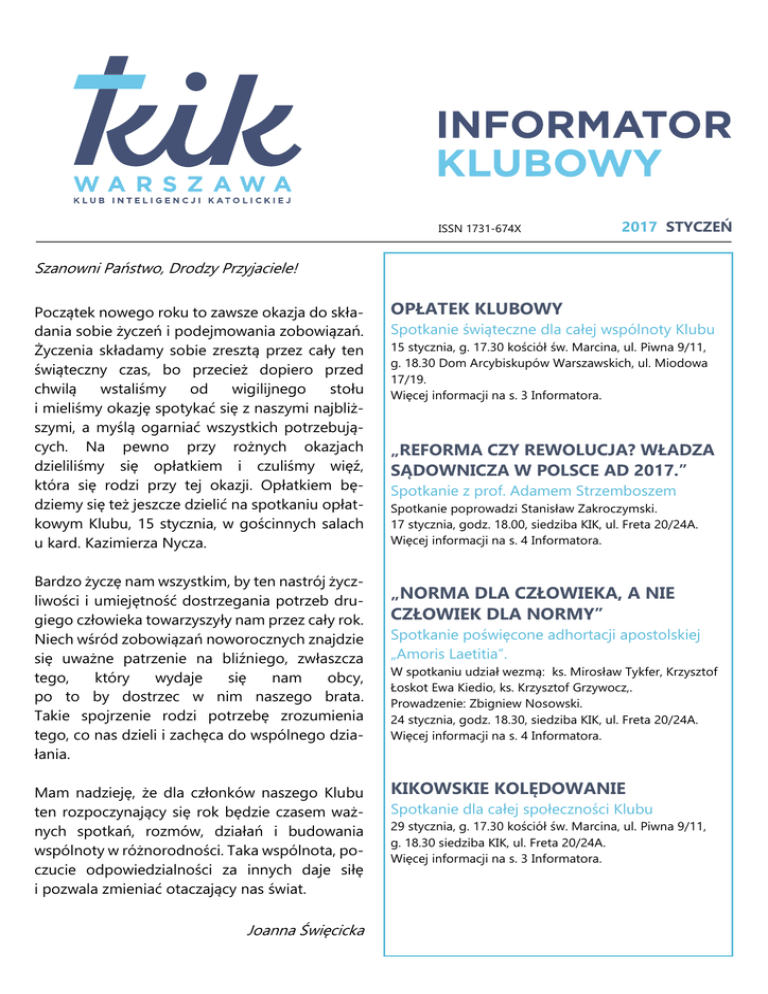 ISSN 1731-674X 2017 STYCZEŃ Szanowni Państwo, Drodzy Przyjaciele! Początek nowego roku to zawsze okazja do składania sobie życzeń i podejmowania zobowiązań. Życzenia składamy sobie zresztą przez cały ten świąteczny czas, bo przecież dopiero przed chwilą wstaliśmy od wigilijnego stołu i mieliśmy okazję spotykać się z naszymi najbliższymi, a myślą ogarniać wszystkich potrzebujących. Na pewno przy rożnych okazjach dzieliliśmy się opłatkiem i czuliśmy więź, która się rodzi przy tej okazji. Opłatkiem będziemy się też jeszcze dzielić na spotkaniu opłatkowym Klubu, 15 stycznia, w gościnnych salach u kard. Kazimierza Nycza. Bardzo życzę nam wszystkim, by ten nastrój życzliwości i umiejętność dostrzegania potrzeb drugiego człowieka towarzyszyły nam przez cały rok. Niech wśród zobowiązań noworocznych znajdzie się uważne patrzenie na bliźniego, zwłaszcza tego, który wydaje się nam obcy, po to by dostrzec w nim naszego brata. Takie spojrzenie rodzi potrzebę zrozumienia tego, co nas dzieli i zachęca do wspólnego działania. Mam nadzieję, że dla członków naszego Klubu ten rozpoczynający się rok będzie czasem ważnych spotkań, rozmów, działań i budowania wspólnoty w różnorodności. Taka wspólnota, poczucie odpowiedzialności za innych daje siłę i pozwala zmieniać otaczający nas świat. Joanna Święcicka OPŁATEK KLUBOWY Spotkanie świąteczne dla całej wspólnoty Klubu 15 stycznia, g. 17.30 kościół św. Marcina, ul. Piwna 9/11, g. 18.30 Dom Arcybiskupów Warszawskich, ul. Miodowa 17/19. Więcej informacji na s. 3 Informatora. „REFORMA CZY REWOLUCJA? WŁADZA SĄDOWNICZA W POLSCE AD 2017.” Spotkanie z prof. Adamem Strzemboszem Spotkanie poprowadzi Stanisław Zakroczymski. 17 stycznia, godz. 18.00, siedziba KIK, ul. Freta 20/24A. Więcej informacji na s. 4 Informatora. „NORMA DLA CZŁOWIEKA, A NIE CZŁOWIEK DLA NORMY” Spotkanie poświęcone adhortacji apostolskiej „Amoris Laetitia”. W spotkaniu udział wezmą: ks. Mirosław Tykfer, Krzysztof Łoskot Ewa Kiedio, ks. Krzysztof Grzywocz,. Prowadzenie: Zbigniew Nosowski. 24 stycznia, godz. 18.30, siedziba KIK, ul. Freta 20/24A. Więcej informacji na s. 4 Informatora. KIKOWSKIE KOLĘDOWANIE Spotkanie dla całej społeczności Klubu 29 stycznia, g. 17.30 kościół św. Marcina, ul. Piwna 9/11, g. 18.30 siedziba KIK, ul. Freta 20/24A. Więcej informacji na s. 3 Informatora. 2 2017 STYCZEŃ DYŻURY NIEKTÓRYCH SEKCJI Karolina Bielecka-Komosa PONIEDZIAŁEK WTOREK – CZWARTEK Krystyna Sieroszewska PONIEDZIAŁEK Sekcja Współpracy z Katolikami na Wschodzie Krystyna Engelking PONIEDZIAŁEK 11.00 – 13.00 Sekcja Wschodnioeuropejska Katarzyna Materkowska ŚRODA 12.00 – 18.00 Sekcja Emaus Spotkania w Nazarecie Alicja Gronau-Osińska DRUGA NIEDZIELA MIESIĄCA e: [email protected] t: 608-291-505 Sekcja Rodzin 16.00 – 20.00 12.30 – 17.30 po wcześniejszym umówieniu POZOSTAŁE SPOTKANIA 02.01. PONIEDZIAŁEK NABOŻEŃSTWO EKUMENICZNE W ŚWIĄTYNI LUTERAŃSKIEJ godzin 18.00 08.01. NIEDZIELA Zaprasza Zwariowany Ekumenista, plac Małachowskiego SPOTKANIE W NAZARECIE godzina 11.45 12.01. CZWARTEK Zaprasza Sekcja Emaus, siedziba KIK SPOTKANIE FORMACYJNE Z O. Z. PERZEM SJ PO MSZY ŚW. O GODZ. 17.00 godzina 17.00 Zaprasza Sekcja Emaus; Sanktuarium oo. Jezuitów przy ul. Rakowieckiej 61 13.01 PIĄTEK SPOTKANIE SEKCJI ESPERANTO godzina 16.00 siedziba KIK 14.01 SOBOTA SPOTKANIE OPŁATOWE KLUBU ŻEGLARSKIEGO „SANTA MARIA” godzina 18.00 siedziba KIK 15.01. NIEDZIELA MSZA ŚWIĘTA KLUBOWA godzina 17.30 26.01. CZWARTEK ul. Piwna 9/11 SPOTKANIE EKUMENICZNE W KOŚCIELE ŚW. MARCINA godzina 18.00 Zaprasza ks. Andrzej Gałka ul. Piwna 9/11 OBSŁUGA PRAWNA KLUBU adw. Zofia Józefowicz-Paszewska KLUB CZYNNY PONIEDZIAŁEK−PIĄTEK 10.00-21.00 WEEKENDY po wcześniejszej rezerwacji SEKRETARIAT PONIEDZIAŁEK−PIĄTEK 10.00-18.00 KSIĘGOWOŚĆ WTOREK 13.00-18.00 PONIEDZIAŁEK, ŚRODA, CZWARTEK 12.00-16.00 NUMER KONTA BANKOWEGO: 15 1560 0013 2000 1706 4454 5708 3 2017 STYCZEŃ LIST KIK DO WŁADZ RP WS. KORYTARZY HUMANITARNYCH DLA UCHODŹCÓW SYRYJSKICH Warszawa, 15 grudnia 2016 r. Szanowny Pan Andrzej Duda Prezydent Rzeczypospolitej Polskiej Szanowna Pani Beata Szydło Prezes Rady Ministrów RP Szanowny Pan Witold Waszczykowski Minister Spraw Zagranicznych RP Szanowny Panie Prezydencie, Szanowna Pani Premier, Szanowny Panie Ministrze, Głęboko poruszeni ostatnimi doniesieniami z Syrii zwracamy się z gorącą prośbą o spowodowanie przez odpowiednie organy naszego kraju natychmiastowego utworzenia tzw. korytarzy humanitarnych. Ta forma pomocy była już proponowana kilka miesięcy temu przez Caritas Polska i została wsparta przez Konferencję Episkopatu Polski, ale z niezrozumiałych powodów nie mogła zostać urzeczywistniona do tej pory. Rozwój sytuacji w Syrii nie pozwala już obecnie na dyskutowanie sprawy, ale wymaga po prostu ratowania ginących ludzi. Pamiętając tragedię Warszawy w 1944 roku, zróbmy wszystko, co w naszej mocy, aby pomóc Syryjczykom. W nadziei na oczekiwane działania Pana Prezydenta, Pani Premier i Pana Ministra pozostajemy z wyrazami szacunku, Zarząd Klubu Inteligencji Katolickiej w Warszawie Do wiadomości: Marek Kuchciński – Marszałek Sejmu VIII kadencji Stanisław Karczewski – Marszałek Senatu IX kadencji Abp Salvatore Pennacchio – Nuncjusz Apostolski w Polsce Abp Wojciech Polak – Prymas Polski Abp Stanisław Gądecki – Przewodniczący Konferencji Episkopatu Polski Kard. Kazimierz Nycz – Arcybiskup Metropolita Warszawski LIST ABP. WOJCIECHA POLAKA – PRYMASA POLSKI Drogi Panie Jakubie*, serdecznie pozdrawiam i bardzo dziękuję za przesłany mi do wiadomości list w sprawie Syrii. W podobny sposób jak wy, także ja ogromnie przeżywam ten dramat zagłady i ludobójstwa i modlę się, szukając światła, aby sprostać temu, co się wydarza. Bardzo dziękuję, że w ten sposób staracie się wesprzeć ciągle jeszcze oczekiwaną