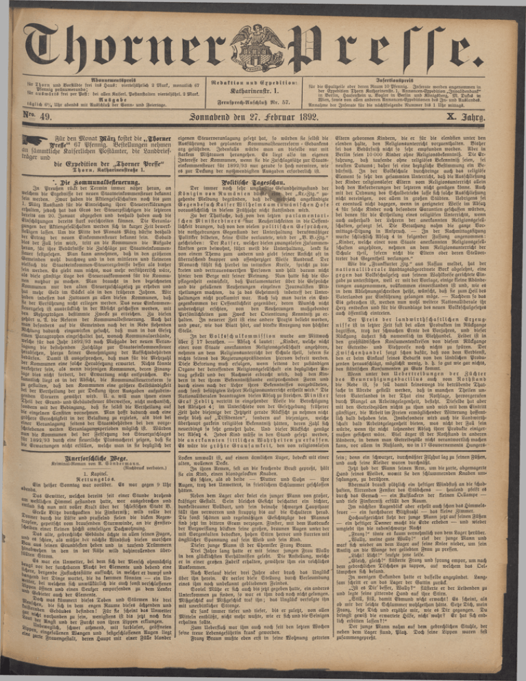 Abonnemeutspreis lür T h o r n und Vorstädte frei ins H a u s : vierteljährlich 2 M a r k , monatlich 67 Pfennig pränum erando; >ur a u s w ä r t s frei per Post: bei allen Kaiser!. Postanstalten vierteljährl. 2 M ark. Ausgabe täg lich 6 '/ , Uhr abends m it Ausschluß der S o n n - und Feiertage. V'L 49. 3nsertionspreis R e d a k t i o n und E x p e d i t i o n : K a th a rin en ftr. 1. Fernsprech-Anschluß N r. 57. für die Spaltzeile oder deren R aum 10 Pfennig. Inserate werden angenommen in der Expedition Thorn Katharinenftr. 1, Annoncen-Expedition „Jnvalidendank" in B erlin , Haasenstein u. Vogler in B e rlin und Königsberg, M . Dukes in W ien, sowie von allen anderen Annoncen-Expeditionen des I n - und AuslandeS. Annahme der Inserate fü r die nächstfolgende Numm er bis 1 U hr mittags. Sonnabend den 27. Februar 1892. F ü r den M o n a t IS ä r z kostet die „ W a r n e r Fresse" 67 P fennig. Bestellungen nehmen an sämmtliche Kaiserlichen Postämter, die Landbrief"ä g e r und die E xpedition d e r,,T h o rn e r Presse" T h o r n , Äatharinenstrafie 1. z>ie Aornmurralvesteuerurrg. eigenen Steuerveranlagung gesetzt hat, so würden sie selbst die A usführung des geplanten Kommunalsteuerreform - Gedankens arg gefährden. Jedenfalls würde man an dieselbe n u r m it starkem M iß tra u e n herangehen. Es liegt also im eigenen Interesse der Kommunen, wenn sie die Zuschlagssätze zur S ta a ts einkommensteuer fü r 1 8 9 2 /9 3 n u r gerade so hoch norm iren, wie j es zur Deckung der nothwendigsten Ausgaben erforderlich ist. Faktische Tagesschau. In Preußen rückt der T e rm in immer näher heran, an welchem die Ergebnisse der neuen Staatseinkommensteuer bekannt sein werden. Z w a r haben die Aktiengesellschaften noch bis zum 1- M ärz Ausstand fü r die Einreichung ihrer Steuererklärungen erhalten, jedoch hat das G ros der Steuerpflichtigen die letzteren bereit» am 20. J a n u a r abgegeben und deshalb haben auch die Einschätzungen bereits stark vorschreiten können. D ie V e ra n la gungen der Aktiengesellschaften werden sich in kurzer Z e it bewerk stelligen lassen. Um die M itte des M o n a ts M ä rz dürfte deshalb der E rtrag der neuen Einkommensteuer bekannt sein. S obald dies der F a ll sein w ird , t r it t an die Kommunen die Aufgabe heran, fü r ihre Bedürfnisse die Zuschläge zur StaatSeinkommensteuer festzusetzen. M a n kann annehmen, daß in den größeren Gemeinden wohl durchweg und in den m ittleren und kleineren vielfach die Staatseinkommen-Steuerergebnisse besser als bisher sein werden. Es giebt nun nichts, was mehr verführerisch wäre, als diese günstige Lage des Steueraufkommens fü r die Kommuuen nutzbar zu machen. M a n braucht in den bezeichneten Kommunen n u r den alten Steuerzuschlagssatz zu erheben und hat mehr Geld im Säckel als in den früheren Jahren. W ir haben indessen das Zutrauen zu allen diesen Kommunen, daß sie der V erführung nicht erliegen werden. D as neue Einkommen steuergesetz ist ausdrücklich in der Absicht geschaffen worden, m it ben M ehrhrträgen bestimmte Zwecke zu erreichen. Z u diesen gehört u. im die Reform der Kommunalbesteuerung. Auch hat wan besonders auf die Gemeinden nach der in Rede stehenden Dichtung dadurch einzuwirken gesucht, daß man in das Gesetz einen Paragraphen eingeschaltet hat, wonach Kommunalverbände, welche fü r das J a h r 1 8 9 2 /9 3 nach Maßgabe der neuen V eran lagung die bestehenden Zuschläge zur StaatSeinkommensteuer herabsetzen, hierzu keiner Genehmigung der Aufsichtsbehörden ^d ü rfe n . D a m it ist ausgesprochen, daß man fü r die Mehrzahl ver Kommunen eine solche Herabsetzung erwartet. Nichts könnte verkehrter sein, als wenn diejenigen Kommunen, deren F inanz lage dies nicht fordert, der E rw a rtu n g nicht entsprächen. B e kanntlich liegt es in der Absicht, die Kommunalsteuerreform so iu gestalten, daß den Kommunen eine größere Selbständigkeit bet der V ertheilung der zur Deckung ihrer Ausgaben aufzubrin genden S teuern gewährt w ird . U. a. w ill man ihnen einen T heil der G rund- und Gebäudesteuer überweisen, nicht mechanisch, sondern m it der Bedingung, daß sie selbst die V ertheilung auf bie einzelnen Cenfiten vornehmen. M a n hofft dadurch auch eine größere Gerechtigkeit in der Belastung zu erzielen, als dies bei einer V eranlagung seitens der Staatsbehörden bei den vorge schriebenen weiten Veranlagungsperioden möglich ist. W ürden "u n die Kommunen bet der Festsetzung des Steuerzuschlages m r 1 8 9 2 /9 3 durch eine steuerliche Plusmacheret zeigen, daß fie bie E rw artungen nicht erfüllen, welche man in fie bezüglich der D e r im m er noch sehr ungünstige Gesundheitszustand der K ö n i g i n v o n R u m ä n i e n d ü W M in e der „K r.-Z tg ." zu gehende M eldung begründen, daß de2 mehrfach angekündigte G e g e n b e s u c h K a is e rW ilh e lm s a m rumänischen Hofe voraussichtlich in diesem F rü h ja h r nicht stattfinden w ird. Z u der Thatsache, daß von den letzten p a r l a m e n t a r i schen M i n i s t e r d i n e r s n u r Aeußerlichkeiten in dieOeffentlichkeit drangen, daß von den vielen p o l i t i s c h e n G e s p r ä c h e n , die nothgedrungen Gegenstand der U nterhaltung berufsmäßiger P o litik e r bildeten, keine S ilb e verlautete, w ird der „ B . B .-Z tg ." geschrieben: D e r K a i s e r , welcher diesen zwangslosen Zusammen künften gern beiwohnt, fü h rt meist die U nterhaltung, lenkt sie von einem Thema zum andern und giebt seiner Ansicht oft in überraschend knapper und offenherziger Weise Ausdruck. D er Monarch fü h lt sich hierbei im intimsten Kreise, spricht zu dis kreten und vertrauenswerthen Personen und hält darum nicht hinter dem Berge m it seiner M einung. N u n hatte sich die Ge pflogenheit entwickelt, daß P a rlam entarier über die Gespräche und die gefallenen Aeußerungen einzelnen Journalisten M i t theilungen machten, da ja das Geheimniß inbetreff der U nter haltungen nicht proklam irt 