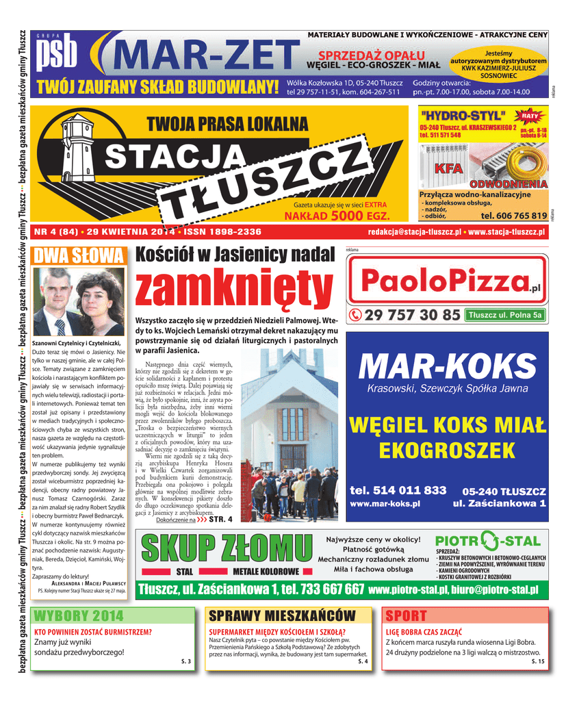 lll lll reklama lll bezpłatnagazetamieszkańcówgminyTłuszcz bezpłatnagazetamieszkańcówgminyTłuszcz bezpłatnagazetamieszkańcówgminyTłuszcz bezpłatnagazetamieszkańcówgminyTłuszcz reklama Gazeta ukazuje się w sieci EXTRA NAkłAd 5000 egz. NR 4 (84) 29 KWIETNIA 2014 ISSN 1898-2336 l [email protected] www.stacja-tluszcz.pl l dwa słowa Kościół w Jasienicy nadal l reklama zamknięty szanowniczytelnicyi czytelniczki, Dużo teraz się mówi o Jasienicy. Nie tylko w naszej gminie, ale w całej Polsce. Tematy związane z zamknięciem kościoła i narastającym konfliktem pojawiały się w serwisach informacyjnych wielu telewizji, radiostacji i portali internetowych. Ponieważ temat ten został już opisany i przedstawiony w mediach tradycyjnych i społecznościowych chyba ze wszystkich stron, nasza gazeta ze względu na częstotliwość ukazywania jedynie sygnalizuje ten problem. W numerze publikujemy też wyniki przedwyborczej sondy. Jej zwycięzcą został wiceburmistrz poprzedniej kadencji, obecny radny powiatowy Janusz Tomasz Czarnogórski. Zaraz za nim znalazł się radny Robert Szydlik i obecny burmistrz Paweł Bednarczyk. W numerze kontynuujemy również cykl dotyczący nazwisk mieszkańców Tłuszcza i okolic. Na str. 9 można poznać pochodzenie nazwisk: Augustyniak, Bereda, Dzięcioł, Kamiński, Wojtyra. Zapraszamy do lektury! A Leks ANd rA i M Ac ieJ P uł AWs cy Wszystkozaczęłosięw przeddzieńNiedzieliPalmowej.Wtedytoks.WojciechLemańskiotrzymałdekretnakazującymu powstrzymanie się od działań liturgicznych i pastoralnych w parafiiJasienica. Następnego dnia część wiernych, którzy nie zgodzili się z dekretem w geście solidarności z kapłanem i protestu opuściło mszę świętą. Dalej pojawiają się już rozbieżności w relacjach. Jedni mówią, że było spokojnie, inni, że asysta policji była niezbędna, żeby inni wierni mogli wejść do kościoła blokowanego przez zwolenników byłego proboszcza. „Troska o bezpieczeństwo wiernych uczestniczących w liturgii” to jeden z oficjalnych powodów, który ma uzasadniać decyzję o zamknięciu świątyni. Wierni nie zgodzili się z taką decyzją arcybiskupa Henryka Hosera i w Wielki Czwartek zorganizowali pod budynkiem kurii demonstrację. Przebiegała ona pokojowo i polegała głównie na wspólnej modlitwie zebranych. W konsekwencji pikiety doszło do długo oczekiwanego spotkania delegacji z Jasienicy z arcybiskupem. Dokończenie na ááá STR. 4 PS. Kolejny numer Stacji Tłuszcz ukaże się 27 maja. wybory 2014 sprawy mieszKańców sport KTO POWINIEN ZOSTAĆ BURMISTRZEM? Znamy już wyniki sondażu przedwyborczego! SUPERMARKET MIĘDZY KOŚCIOŁEM I SZKOŁĄ? LIGĘ BOBRA CZAS ZACZĄĆ Nasz Czytelnik pyta – co powstanie między Kościołem pw. Przemienienia Pańskiego a Szkołą Podstawową? Ze zdobytych przez nas informacji, wynika, że budowany jest tam supermarket. s. 4 Z końcem marca ruszyła runda wiosenna Ligi Bobra. 24 drużyny podzielone na 3 ligi walczą o mistrzostwo. s. 3 s. 15 2 kalejdoskop + + + pLUs )Listy wtorek, 29 kwietnia 2014 lll opiNie czymusidojść do tragedii? kilkadnitemuw Tłuszczumiałymiejscedwapoważnewypadkiz udziałemrowerzystów.Jedenna drodzedo Jasienicy:matkaz dzieckiempotrącona przezjakiśsamochód.zajmowaliście się wiaduktem i wszystko wskazuje na to, że wiadukt będzie, ale na tej drodze na odcinku z Tłuszcza do Jasienicy i w przeciwnym kierunku na kozły potrzeby jest jakiś chodnik, dróżka – coś, co umożliwi bezpieczną drogępieszymi rowerzystom. NOWekOsze NAŚMieci Na terenie miasta pojawiły się nowe koszena śmieci.Przy częściz nichzamontowano kasety z torebkami na psie odchody. Miejmy nadzieję, że właściciele czworonogów przekonają się do sprzątania po swoich pupilach. A także,żeniektórzymieszkańcyuwierząw końcu,żew ramachopłatyza gospodarowanie odpadami naprawdę niemalimituoddawanychśmiecii nie trzeba ich wyrzucać do miejskich koszy!(fot.łukaszFrelek) n co n gdzie n Kiedy n 2 maja, godz. 10.15, Kościół w parafii pw. Przemienienia Pańskiego, Mszą Św. rozpoczną się Obchody Dnia Strażaka. Następnie uroczysty przemarsz na Stadion Miejski, gdzie nastąpi m.in. wręczenie medali i prezentacja sprzętu strażackiego. n 3 maja, godz. 10.15, Kościół w parafii pw. Przemienienia Pańskiego, Mszą Św. rozpoczną się Obchody Narodowego Święta Konstytucji. Dalsza część uroczystości w Centrum Kultury, Sportu i Rekreacji (program artystyczny w wykonaniu młodzieży). n 3 maja, ok. godz. 13, Społeczne Muzeum Ziemi Tłuszczańskiej, otwarcie wystaw pt. „Herby, flagi i pieczęcie jednostek samorządu terytorialnego RP” Roberta Szydlika i „Polska droga do flagi” Roberta Szydlika i Tadeusza Sasina. Wstęp wolny. czekamyna informacjeo wydarzeniach! e-mail:[email protected], tel.694005 675 Temat jest znany ludziom mieszkającym przy tej trasie od lat i od lat każdy ma to gdzieś! Bo się nie da, bo droga powiatowa, bo funduszy brak, bo projektant nie uwzględnił itd. I szkoda, że burmistrz, starosta, radni i cała ta władza nie widziała tego małego, przerażonego dziecka, które płakało widząc zakrwawioną, mdlejącą matkę. Może wtedy ktoś by zrozumiał, że jednak coś z tym zrobić trzeba. A może musi naprawdę spektakularnie zginąć za jednym zamachem jakaś większa grupa, wtedy i TV przyjedzie, i gazety pokażą, i będzie można obiecać, że się tematem zajmie (bo do tej pory się tematu nie znało, nie widziało). Lepiej zapobiegać, a nie leczyć. A o Tłuszczu, lepiej może żeby było głośno w innych pozytywnych sprawach, a nie tragicznych. Pozdrawiam, M ieszk AN iec ktoturządzi? – przemyśleniaprzedwyborcze Wiosnę mamy już w pełni, a to oznacza rychłe nadejście lata, a po lecie, ani się obejrzymy – przywita nas wyborcza jesień. Bardzo dobrze, że „Stacja Tłuszcz” zorganizowała sondaż przedwyborczy, który pozwoli zorientować się. jak mocną pozycję wśród w