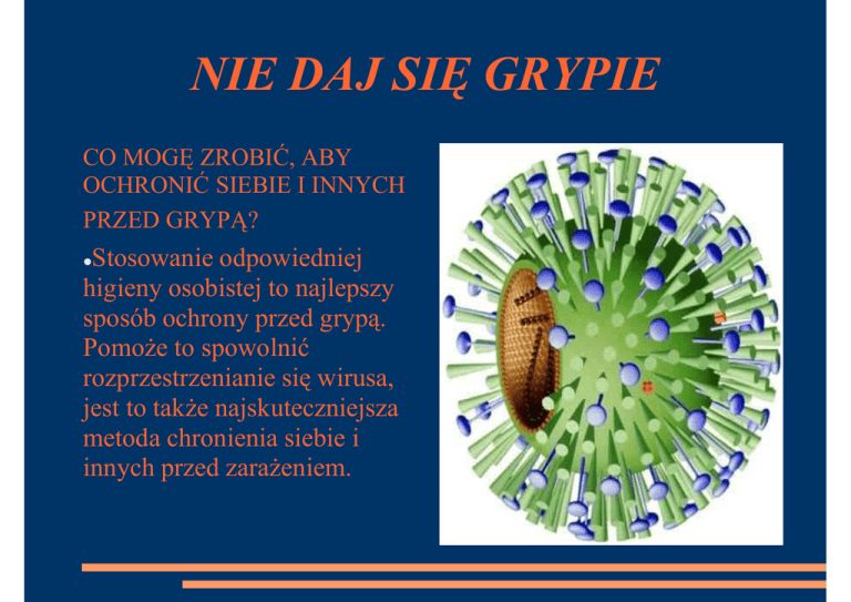 NIE DAJ SIĘ GRYPIE CO MOGĘ ZROBIĆ, ABY OCHRONIĆ SIEBIE I INNYCH PRZED GRYPĄ? Stosowanie odpowiedniej higieny osobistej to najlepszy sposób ochrony przed grypą. PomoŜe to spowolnić rozprzestrzenianie się wirusa, jest to takŜe najskuteczniejsza metoda chronienia siebie i innych przed zaraŜeniem. 12 10 8 Kolumna 1 6 Kolumna 2 Kolumna 3 4 2 0 Wiersz 1 Wiersz 2 Wiersz 3 Wiersz 4 Podstawowe zasady higieny Zakrywaj nos i usta chusteczką higieniczną gdy kichasz i kaszlesz Często myj ręce mydłem i woda Wyrzuć chusteczkę do kosza natychmiast po jej uŜyciu JeŜeli masz objawy przypominające grypę natychmiast zgłoś się do lekarza JeŜeli masz objawy grypy zachowaj przynajmniej 1 metr odległości od innych osób Unikaj przytulania, całowania, uścisków dłoni podczas powitań JeŜeli masz objawy grypy zostań w domu zamiast przebywać w w pracy, w szkole, lub zatłoczonych miejscach Unikaj dotykania oczu, nosa, lub ust nieumytymi dłońmi Gdy kaszlesz i kichasz! Stosowanie zasad higieny osobistej jest szczególnie waŜnie by zapobiec roznoszeniu wirusa Zawsze miej przy sobie chusteczki higieniczne, UŜywaj czystych chusteczek do zasłonięcia ust i nosa, gdy kaszlesz i kichasz. Wyrzucaj chusteczki po jednorazowym uŜyciu, Często myj ręce mydłem i gorącą wodą, albo odkaŜającym Ŝelem. W JAKI SPOSÓB GRYPA SIĘ PRZENOSI? Wirusy grypy mogą utrzymywać się: na powierzchniach gładkich, typu stoły, blaty kuchenne, klamki drzwi, powierzchnie metalowe lub plastikowe nawet do 24 godzin ( średnio 8-14 godzin), na powierzchniach porowatych do 12 godzin ( średnio 4-6 godzin), na ubraniach, chustach i chusteczkach wielokrotnego uŜycia do 15 minut, na ludzkich rękach 5-8 minut. W JAKI SPOSÓB GRYPA SIĘ PRZENOSI? Wirus preferuje niskie temperatury : w temperaturze 4 st. C przeŜywa 48 godzin, w temperaturze 20 st. C jedynie 8 godzin, w lodzie nawet wiele lat. Wirus preferuje równieŜ niŜszą niŜ 50% wilgotność środowiska, w którym Ŝyje. Przenoszenie wirusa Wirusy grypy złoŜone są z maleńkich cząsteczek,które mogą się przenosić w kropelkach pochodzących z twojego nosa i ust, gdy kaszlesz lub kichasz. Jeśli kaszlesz i kichasz bez zakrywania nosa i ust jednorazową chusteczką, kropelki te mogą się rozprzestrzenić, naraŜając inne osoby na ich wdychanie. Jeśli kaszlesz czy kichasz w dłoń, kropelki te wraz z zawartymi w nich wirusami łatwo się przeniosą z twojej ręki na wszystkie dotykane przez ciebie powierzchnie, na których mogą przeŜyć przez dłuŜszy czas. Przenoszenie wirusa cd. Pospolite przedmioty, jak klamki, klawiatury komputerowe telefony komórkowe i zwykłe telefony oraz piloty do telewizorów to powierzchnie, na których zazwyczaj moŜna znaleźć wirusy. Jeśli inne osoby dotkną tych powierzchni, a później dotkną twarzy,wirusy mogą wniknąć do ich organizmu osoby te mogą ulec zaraŜeniu.W ten sposób wszystkie wirusy przeziębienia i grypy, włącznie ze świńską grypą,przenoszą się z osoby na osobę. Złap, Wyrzuć, Zabij! ZŁAP (wirusa w chusteczkę higieniczną jednorazowego uŜytku) WYRZUĆ ( chusteczkę higieniczną do kosza) ZABIJ ( wirusa poprzez umycie rąk pod ciepłą płynącą z kranu wodą przez 20 sekund, po uprzednim dokładnym namydleniu rąk do wysokości nadgarstków, mydłem lub innym środkiem dezynfekującym) Objawy grypy: podwyŜszona temperatura, dreszcze katar z płynną wydzieliną lub zatkanym nosem, ból głowy, bóle mięśniowe i stawowe, bóle gardła, nudności, wymioty i biegunka Podsumowanie Charakterystyczny dla grypy jest jej nagły początek (około 24 – 48 godzin od zakaŜenia) Osoba chora jest źródłem zakaŜenia (zaraźliwa) przez okres maksymalnie 7 dni od pojawienia się objawów (średnio od 2 – 5 dni). MoŜe jednak zaraŜać juŜ 24 godziny wcześniej, przed pojawieniem się pierwszych objawów. Gdy wystąpią u Ciebie objawy grypy koniecznie pozostań w domu i skontaktuj się z lekarzem.