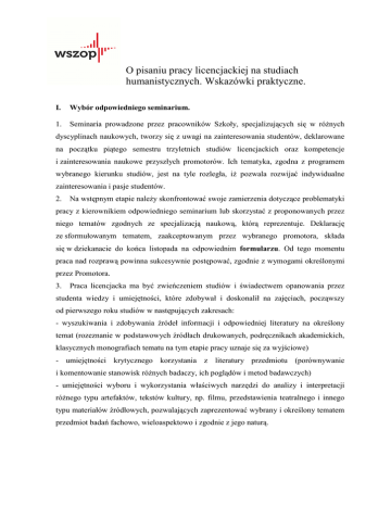O pisaniu pracy licencjackiej na studiach humanistycznych. Wskazówki praktyczne. I. Wybór odpowiedniego seminarium. 1. Seminaria prowadzone przez pracowników Szkoły, specjalizujących się w różnych dyscyplinach naukowych, tworzy się z uwagi na zainteresowania studentów, deklarowane na początku piątego semestru trzyletnich studiów licencjackich oraz kompetencje i zainteresowania naukowe przyszłych promotorów. Ich tematyka, zgodna z programem wybranego kierunku studiów, jest na tyle rozległa, iż pozwala rozwijać indywidualne zainteresowania i pasje studentów. 2. Na wstępnym etapie należy skonfrontować swoje zamierzenia dotyczące problematyki pracy z kierownikiem odpowiedniego seminarium lub skorzystać z proponowanych przez niego tematów zgodnych ze specjalizacją naukową, którą reprezentuje. Deklarację ze sformułowanym tematem, zaakceptowanym przez wybranego promotora, składa się w dziekanacie do końca listopada na odpowiednim formularzu. Od tego momentu praca nad rozprawą powinna sukcesywnie postępować, zgodnie z wymogami określonymi przez Promotora. 3. Praca licencjacka ma być zwieńczeniem studiów i świadectwem opanowania przez studenta wiedzy i umiejętności, które zdobywał i doskonalił na zajęciach, począwszy od pierwszego roku studiów w następujących zakresach: - wyszukiwania i zdobywania źródeł informacji i odpowiedniej literatury na określony temat (rozeznanie w podstawowych źródłach drukowanych, podręcznikach akademickich, klasycznych monografiach tematu na tym etapie pracy uznaje się za wyjściowe) - umiejętności krytycznego korzystania z literatury przedmiotu (porównywanie i komentowanie stanowisk różnych badaczy, ich poglądów i metod badawczych) - umiejętności wyboru i wykorzystania właściwych narzędzi do analizy i interpretacji różnego typu artefaktów, tekstów kultury, np. filmu, przedstawienia teatralnego i innego typu materiałów źródłowych, pozwalających zaprezentować wybrany i określony tematem przedmiot badań fachowo, wieloaspektowo i zgodnie z jego naturą. 2 Ważne jest określenie typu pracy (analityczno-problemowa, sprawozdawcza, opisowoźródłowa, monograficzna) tak, by odpowiadał kompetencjom, możliwościom i zdolnościom badawczym studenta. II. Wymagania, jakie praca licencjacka winna spełniać i kryteria, wedle których jest oceniana przez recenzentów: 1. dobór, selekcję i stopień wykorzystania materiałów źródłowych i opracowań naukowych, 2. właściwy dla przedmiotu badań wybór metody badawczej i stopień jej praktycznego opanowania, 3. stopień rozwiązania postawionego w pracy zadania, 4. poprawność formalną (właściwa konstrukcja pracy, poprawność sporządzania przypisów, bibliografii, aneksów, zasadność i dobór materiału ilustracyjnego oraz odpowiedni styl i poprawny język wypowiedzi). III. Etapy pracy nad rozprawą Podstawową czynnością jest przygotowanie i sukcesywne uzupełnianie literatury przedmiotu, czyli publikacji poświęconych wybranej przez studenta problematyce, bądź z nią korespondujących, a także określenie i zgromadzenie odpowiednich źródeł, które mają zostać poddane przez niego analizie i interpretacji lub wieloaspektowej prezentacji. To pozwala poznać aktualny stan wiedzy na wybrany temat i określić własny punkt widzenia. Należy unikać opracowań popularnych, gdyż pojawia się w nich wiele uogólnień i niesprawdzonych informacji. Trzeba korzystać z naukowej literatury, kompendiów i słowników, a także poszukiwać opracowań szczegółowych, wolnych od uproszczeń, poświęconych zgłębieniu tematu w określonej perspektywie. Uważna lektura wstępnie wybranych pozycji bibliograficznych polega również na studiowaniu przypisów, co pozwala wyśledzić i inne pozycje, które mogą stać się ważne dla poszerzenia własnej, zgromadzonej już bibliografii i własnych badań. Na tym etapie pomocne jest sporządzenie planu pracy w formie konspektu, który po omówieniu z Promotorem, pozwala opracować harmonogram pracy nad ostatecznym kształtem rozprawy. Postępy w tym zakresie odnotowuje się na karcie konsultacyjnej, która wraz z egzemplarzami pracy i innymi dokumentami składana jest w dziekanacie przed obroną. 3 IV. Konstrukcja pracy Konstrukcja pracy wynika z tematu oraz sposobu prezentacji zgromadzonego materiału. Ważne, by spełniała ona trzy podstawowe wymogi: - kompletności prezentowanych tez, - logicznej kompozycji (układ poszczególnych części powinien ujawniać logiczny tok rozumowania, każdy fragment pracy powinien wynikać z poprzedniego i antycypować następny) - „jasności” wykładu i językowej poprawności. Prace licencjackie nie spełniające wymogów poprawności językowej nie będą przyjmowane przez Promotora. Praca licencjacka, podobnie jak prace naukowe, składa się z trzech zasadniczych części: 1. wstępu (wprowadzenia), gdzie Autor wyjaśnia temat i własne jego rozumienie oraz stawia tezę (tezy), która ma być dowodzona w dalszej części pracy, 2. osnowy, którą tworzy kilka rozdziałów, gromadzących argumenty na rzecz wyeksponowanej hipotezy i ( w miarę możliwości) jej krytyczną analizę, 3. zakończenia (podsumowanie), które obejmuje wnioski Autora, wyprowadzone z analizy dotychczasowego stanu badań, badań własnych, przedstawionych w pracy oraz prezentacji odkrytych przez Autora pól badawczych i pomysłów/rozstrzygnięć metodologicznych, które zrodziły się w trakcie pisania pracy. 1. Wstęp powinien zawierać wyjaśnienie tematu pracy, sformułowany wyraźnie cel badawczy oraz zakres badanego materiału (rzeczowy, chronologiczny bądź terytorialny). W wypadku tematów, które były już przedmiotem opracowań naukowych, można syntetycznie przedstawić stan badań, by na tym tle określić własne stanowisko. We wstępie należy również omówić konstrukcję pracy, uzasadniając proponowany podział materiału i informując krótko o zawar