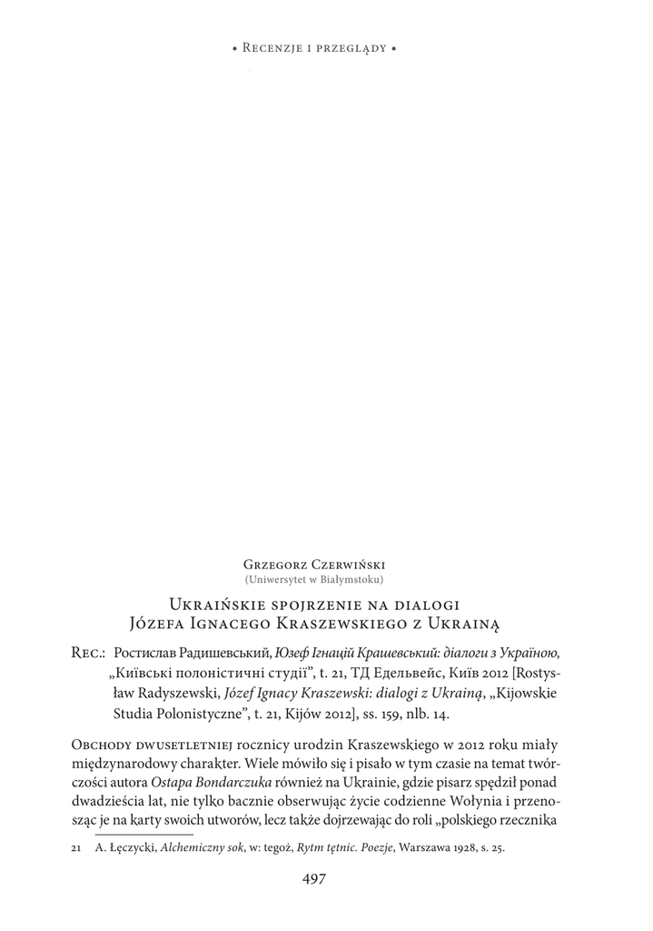 • Recenzje i przeglądy • Ssąco-tłocząca pompa, serce, rozsadza halę, pręty żeber, leniwą krew w arterie wwierca: krwi ciągle nowej tkankom trzeba! Naczyń rozsuwa się wąwozem i pilśń gąbczastą mięśni poi stalową siły pięści grozą – przyszedłem zwycięstwem moich wojen!21 a b s t r ac t The Blood: „The Pulse of the Epoch”. From the History of the One Theme Review of: Marek Kurkiewicz, The Pulse of The Epoch. The Place and Role of the Motif of Blood in the Literature of Young Poland, Bydgoszcz 2013 The paper reviews Marek Kurkiewicz’s The Pulse of the Epoch. The Place and Role of the Motif of Blood in the Literature of the Young Poland (Bydgoszcz 2013). The author points to the monographic character of the study of Kurkiewicz, who analysed all possible constellation of meaning, in which this motif occurs in the Modernist Period. At the same time, he notes that it is possible to further develop the topic concerning the methodology of research on the relationship of blood and sex, or the comparison of one’s blood to the blood of the others. In the conclusion, the author of this paper emphasises that the treatise is a significant scholarly achievement of Kurkiewicz. k e y wo rd s Blood, Modernist Period, Young Poland, motif, symbolism, Marek Kurkiewicz Grzegorz Czerwiński (Uniwersytet w Białymstoku) Ukraińskie spojrzenie na dialogi Józefa Ignacego Kraszewskiego z Ukrainą Rec.: Ростислав Радишевський, Юзеф Ігнацій Крашевський: діалоги з Україною, „Київські полоністичні студії”, t. 21, ТД Едельвейс, Київ 2012 [Rostysław Radyszewski, Józef Ignacy Kraszewski: dialogi z Ukrainą, „Kijowskie Studia Polonistyczne”, t. 21, Kijów 2012], ss. 159, nlb. 14. Obchody dwusetletniej rocznicy urodzin Kraszewskiego w 2012 roku miały międzynarodowy charakter. Wiele mówiło się i pisało w tym czasie na temat twórczości autora Ostapa Bondarczuka również na Ukrainie, gdzie pisarz spędził ponad dwadzieścia lat, nie tylko bacznie obserwując życie codzienne Wołynia i przenosząc je na karty swoich utworów, lecz także dojrzewając do roli „polskiego rzecznika 21 A. Łęczycki, Alchemiczny sok, w: tegoż, Rytm tętnic. Poezje, Warszawa 1928, s. 25. 497 • Recenzje i przeglądy • kultury ukraińskiej”. Wśród wydawnictw jubileuszowych ważne miejsce zajmuje wydana w języku ukraińskim książka kijowskiego polonisty Rostysława Radyszewskiego, zatytułowana Józef Ignacy Kraszewski: dialogi z Ukrainą. Szczególne okoliczności, w jakich ukazała się omawiana pozycja, wpłynęły na jej zawartość i cel wydawniczy. Po pierwsze, praca ma w dużej mierze charakter popularyzatorski, podręcznikowy – jej wydaniu przyświecała idea wyjaśnienia i rozpropagowania najważniejszych aspektów dyskursu ukraińskiego, który podejmował autor Starej baśni. Po drugie, książka adresowana jest do odbiorcy ukraińskojęzycznego, stąd też w nieco inny sposób niż w polskich pracach zostały rozłożone akcenty tematyczne – kontekstem wszelkich rozważań o twórczości i biografii Kraszewskiego uczyniono ukraińskość w znaczeniu geograficznym, etnograficznym i kulturowym, przy czym słowa klucze (takie jak „Ukraina” czy „ukraiński”) rozumiane są przez autora w odmienny sposób, niż odbiera się je zazwyczaj w Polsce (niewypowiedzianym wprost, lecz odczuwanym w trakcie lektury punktem odniesienia jest w pracy Radyszewskiego współczesne państwo ukraińskie, a nie historyczna kultura ziem „ukrainnych”). „Dydaktyczny” charakter recenzowanej książki nie zmienia jednak faktu, iż mamy do czynienia z doskonale przemyślaną i napisaną rozprawą naukową, w której nie tylko podsumowany został kilkudziesięcioletni dorobek ukraińskich studiów nad Kraszewskim, ale również wcześniejsze ustalenia badawcze ukazane zostały w nowym porządku interpretacyjnym. Monografia składa się z siedmiu rozdziałów analitycznych oraz zakończenia i kilkustronicowego streszczenia w języku polskim. Rozdział I, zatytułowany Ukraińskie kraszewskiana, przybliża czytelnikom ukraińską historię badań nad twórczością autora Jermoły. A trzeba zaznaczyć, iż zainteresowanie twórczością Kraszewskiego wśród Ukraińców ma bogatą tradycję. Już Iwan Franko zwrócił uwagę na wielki talent autora Ulany, podkreślając w roku 1887, iż to właśnie Kraszewski pierwszy spośród pisarzy polskich umiał w pełni przeniknąć życie i duszę prostego ludu1. Wśród badaczy literatury za pioniera ukraińskich studiów nad Kraszewskim uznać należy Wołodymyra Jakowycza Hnatiuka (1893–1952), który w 1938 roku obronił w Leningradzie rozprawę doktorską poświęconą ukraińsko-polskiej literaturze romantycznej2. Po drugiej wojnie światowej proza Kraszewskiego była tłumaczona na język ukraiński i wydawana w dużych nakładach w Ukraińskiej Republice Radzieckiej. Ukraińskojęzyczni czytelnicy mogli zapoznać się z takimi książkami pisarza, jak Ulana, Historia Sawki, Ostap Bondarczuk, Historia kołka w płocie, Jaryna, Chata za wsią oraz oczywiście ze wznawianą dwukrotnie Starą baśnią (wyd. 1960 i 1964). Zainteresowaniu ukraińskich czytelników towarzyszyła również refleksja literaturoznawcza, co ukazuje Radyszewski, kreśląc historyczny przegląd literatury naukowej poświęconej polskiemu pisarzowi. Ta cenna wiedza z zakresu ukraińskiej polonistyki może stanowić szczególną wartość 1 2 Zob. I. Франко, Польський селянин в освітленні польської літератури, w: tegoż, Зібрання творів у 50-ти томах, Київ 1955, s. 68. Zob. В. Гнатюк, Українсько-польська правобережна романтична література. Вибрані праці, ред. Р. Радишевський, Київ 2008. 498 • Rece