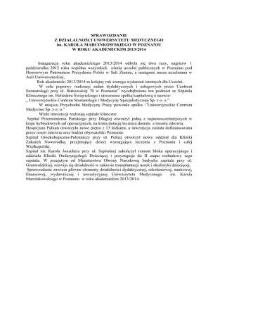 SPRAWOZDANIE Z DZIAŁALNOŚCI UNIWERSYTETU MEDYCZNEGO im. KAROLA MARCINKOWSKIEGO W POZNANIU W ROKU AKADEMICKIM 2013/2014 Inauguracja roku akademickiego 2013/2014 odbyła się dwa razy, najpierw 1 października 2013 roku wspólna wszystkich ośmiu uczelni publicznych w Poznaniu pod Honorowym Patronatem Prezydenta Polski w Sali Ziemia, a następnie nasza uczelniana w Auli Uniwersyteckiej. Rok akademicki 2013/2014 to kolejny rok szeregu wydarzeń istotnych dla Uczelni. W celu poprawy realizacji zadań dydaktycznych i usługowych przez Centrum Stomatologii przy ul. Bukowskiej 70 w Poznaniu” wyodrębniono ten podmiot ze Szpitala Klinicznego im. Heliodora Święcickiego i utworzono spółkę kapitałową o nazwie: „ Uniwersyteckie Centrum Stomatologii i Medycyny Specjalistycznej Sp. z o. o.” W miejscu Przychodni Medycyny Pracy powstała spółka :”Uniwersyteckie Centrum Medyczne Sp. z o. o.” Wiele inwestycji realizują szpitale kliniczne. Szpital Przemienienia Pańskiego przy Długiej otworzył jedną z najnowocześniejszych w kraju hybrydowych sal operacyjnych, na którą dotację lecznica dostała z resortu zdrowia. Hospicjum Palium otworzyło nowe piętro z 13 łóżkami, a inwestycja została dofinansowana przez resort zdrowia oraz budżet obywatelski Poznania. Szpital Ginekologiczno-Położniczy przy ul. Polnej otworzył nowy oddział dla Kliniki Zakażeń Noworodka, przyjmujący dzieci wymagające leczenia z Poznania i całej Wielkopolski. Szpital im. Karola Jonschera przy ul. Szpitalnej zakończył remont bloku operacyjnego i oddziału Kliniki Otolaryngologii Dziecięcej i przystępuje do II etapu rozbudowy tego szpitala. W przejętym od Ministerstwa Obrony Narodowej budynku szpitala przy ul. Grunwaldzkiej, rozwija się działalność w zakresie transplantacji nerek i okulistyki dziecięcej, Sprawozdanie zawiera główne elementy działalności dydaktycznej, szkoleniowej, naukowej, finansowej, wydawniczej i inwestycyjnej Uniwersytetu Medycznego im. Karola Marcinkowskiego w Poznaniu w roku akademickim 2013/2014. KSZTAŁCENIE W roku akademickim 2013/2014 na czterech wydziałach i jedenastu kierunkach studiów stacjonarnych oraz dziewięciu kierunkach studiów niestacjonarnych kształciło się łącznie studentów: 7.050 w tym: - na studiach stacjonarnych 4612 - na studiach niestacjonarnych - 1554 - obcokrajowców 884 ( w tym 847 odbywających studia w j. angielskim) Porównując rok akademicki 2013/2014 z rokiem akademickim 2012/2013 odnotowano spadek liczby studentów o 506, natomiast porównując rok akademicki 2012/2013 a 2011/2012 - spadek liczby studentów wyniósł 421. To znaczy, że w ciągu ostatnich dwóch lat akademickich lat liczba studentów zmalała o 927. Największą różnicę odnotowano w studiach niestacjonarnych – 429 (322) następnie: obcokrajowcy 43 (89) a w roku akademickim 2013/2014 zmalała o 34 liczba studentów na studiach stacjonarnych.. Liczbę studentów na poszczególnych kierunkach przedstawia tabela nr 1. Tabela nr 1 Liczba studiujących na poszczególnych kierunkach ( dane statystyczne z GUS dzień 30.11.2013 r.)) Kierunek studiów Lekarski CNJA Inni obcokrajowcy Lekarsko-Dentystyczny CNJA Inni obcokrajowcy Techniki dentystyczne Studia I stopnia Biotechnologia I stopnia II stopnia Farmacja CNJA Inni obcokrajowcy Analityka medyczna Kosmetologia Studia I stopnia Studia II stopnia Pielęgniarstwo Studia I stopnia Studia II stopnia Studia stacjonarne Studia niestacjonarne 1233 602 21 355 190 9 48 219 30 17 713 31 4 157 - 87 21 80 1 92 13 100 220 151 10 266 Inni obcokrajowcy Położnictwo Studia I stopnia Inni obcokrajowcy Studia II stopnia Zdrowie Publiczne Studia I stopnia Studia II stopnia Fizjoterapia Studia I stopnia Inni obcokrajowcy Studia II stopnia CNJA Dietetyka Studia I stopnia Studia II stopnia Ratownictwo medyczne I stopnia Elektroradiologia Studia I stopnia Studia II stopnia Optometria Studia I stopnia Terapia zajęciowa Studia I stopnia RAZEM 1 216 1 111 107 182 120 19 96 261 1 207 24 120 124 93 - 94 49 58 48 59 67 240 39 43 5496 1554 W roku akademickim 2013/2014 studia ukończyło: 379 lekarzy w tym: - 138 osób studiujących w języku angielskim: w programie 4-letnim - 60 w programie 6-letnim -78 - 4 obcokrajowców 130 lekarzy dentystów w tym: - 40 osób studiujących w języku angielskim w programie 5 letnim - 2 obcokrajowców 139 magistrów farmacji w tym: - 7 osób studiująca w języku angielskim 22 magistrów analityki medycznej Studia stacjonarne I stopnia 36 osób z tytułem licencjata - dietetyka 14 osób z tytułem licencjata - elektroradiologia 78 osób z tytułem licencjata - pielęgniarstwo 68 osób z tytułem licencjata - położnictwo 81 osoby z tytułem licencjata - fizjoterapia 39 osób z tytułem licencjata – zdrowie publiczne 15 osób z tytułem licencjata – ratownictwo medyczne 15 osób z tytułem licencjata – techniki dentystyczne 12 osób z tytułem licencjata – zdrowie publiczne, specj. higiena dentystyczna 24 osoby z tytułem licencjata - kosmetologia Studia niestacjonarne I stopnia 19 osób z tytułem licencjata – elektroradiologia 10 osób z tytułem licencjata – pielęgniarstwo 45 osoby z tytułem licencjata – fizjoterapia 7 osób z tytułem licencjata – zdrowie publiczne 15 osób z tytułem licencjata – ratownictwo medyczne 10 osób z tytułem licencjata – techniki dentystyczne 22 osób z tytułem licencjata - kosmetologia Studia stacjonarne II stopnia 6 magistrów biotechnologii 33 magistrów dietetyki 25 magistrów elektoradiologii 60 magistrów fizjoterapii 45 magistrów zdrowia publicznego 55 magistrów pielęgniarstwa 49 magistrów położnictwa Studia niestacjonarne II stopnia 22 magistrów kosmetologii 126 magistrów pielęgniarstwa 72 magistrów fizjoterapii 29 magistrów zdrowia publicznego 38 magistrów położnictwa 32 magistrów elektroradiologii Łącznie absolwentów – 1.102 Pomoc stypendialna W roku akademickim 2013/2014 przyznano: - stypendia socjalne - stypendia Re