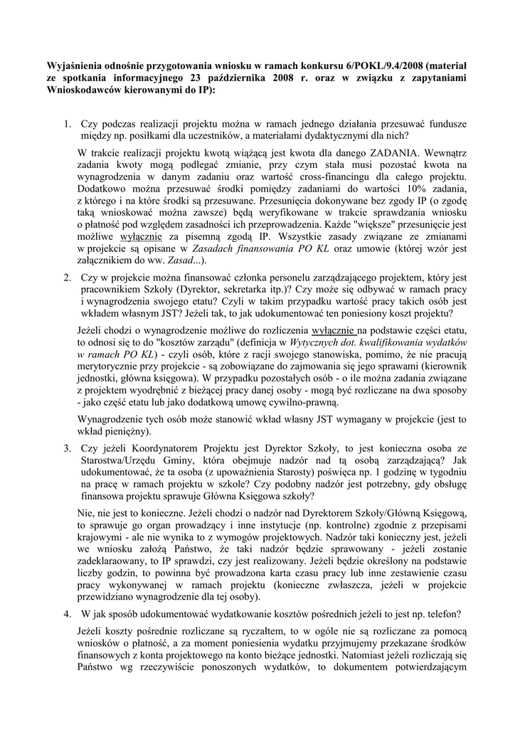 Wyjaśnienia odnośnie przygotowania wniosku w ramach konkursu 6/POKL/9.4/2008 (materiał ze spotkania informacyjnego 23 października 2008 r. oraz w związku z zapytaniami Wnioskodawców kierowanymi do IP): 1. Czy podczas realizacji projektu można w ramach jednego działania przesuwać fundusze między np. posiłkami dla uczestników, a materiałami dydaktycznymi dla nich? W trakcie realizacji projektu kwotą wiążącą jest kwota dla danego ZADANIA. Wewnątrz zadania kwoty mogą podlegać zmianie, przy czym stała musi pozostać kwota na wynagrodzenia w danym zadaniu oraz wartość cross-financingu dla całego projektu. Dodatkowo można przesuwać środki pomiędzy zadaniami do wartości 10% zadania, z którego i na które środki są przesuwane. Przesunięcia dokonywane bez zgody IP (o zgodę taką wnioskować można zawsze) będą weryfikowane w trakcie sprawdzania wniosku o płatność pod względem zasadności ich przeprowadzenia. Każde "większe" przesunięcie jest możliwe wyłącznie za pisemną zgodą IP. Wszystkie zasady związane ze zmianami w projekcie są opisane w Zasadach finansowania PO KL oraz umowie (której wzór jest załącznikiem do ww. Zasad...). 2. Czy w projekcie można finansować członka personelu zarządzającego projektem, który jest pracownikiem Szkoły (Dyrektor, sekretarka itp.)? Czy może się odbywać w ramach pracy i wynagrodzenia swojego etatu? Czyli w takim przypadku wartość pracy takich osób jest wkładem własnym JST? Jeżeli tak, to jak udokumentować ten poniesiony koszt projektu? Jeżeli chodzi o wynagrodzenie możliwe do rozliczenia wyłącznie na podstawie części etatu, to odnosi się to do "kosztów zarządu" (definicja w Wytycznych dot. kwalifikowania wydatków w ramach PO KL) - czyli osób, które z racji swojego stanowiska, pomimo, że nie pracują merytorycznie przy projekcie - są zobowiązane do zajmowania się jego sprawami (kierownik jednostki, główna księgowa). W przypadku pozostałych osób - o ile można zadania związane z projektem wyodrębnić z bieżącej pracy danej osoby - mogą być rozliczane na dwa sposoby - jako część etatu lub jako dodatkową umowę cywilno-prawną. Wynagrodzenie tych osób może stanowić wkład własny JST wymagany w projekcie (jest to wkład pieniężny). 3. Czy jeżeli Koordynatorem Projektu jest Dyrektor Szkoły, to jest konieczna osoba ze Starostwa/Urzędu Gminy, która obejmuje nadzór nad tą osobą zarządzającą? Jak udokumentować, że ta osoba (z upoważnienia Starosty) poświęca np. 1 godzinę w tygodniu na pracę w ramach projektu w szkole? Czy podobny nadzór jest potrzebny, gdy obsługę finansowa projektu sprawuje Główna Księgowa szkoły? Nie, nie jest to konieczne. Jeżeli chodzi o nadzór nad Dyrektorem Szkoły/Główną Księgową, to sprawuje go organ prowadzący i inne instytucje (np. kontrolne) zgodnie z przepisami krajowymi - ale nie wynika to z wymogów projektowych. Nadzór taki konieczny jest, jeżeli we wniosku założą Państwo, że taki nadzór będzie sprawowany - jeżeli zostanie zadeklaraowany, to IP sprawdzi, czy jest realizowany. Jeżeli będzie określony na podstawie liczby godzin, to powinna być prowadzona karta czasu pracy lub inne zestawienie czasu pracy wykonywanej w ramach projektu (konieczne zwłaszcza, jeżeli w projekcie przewidziano wynagrodzenie dla tej osoby). 4. W jak sposób udokumentować wydatkowanie kosztów pośrednich jeżeli to jest np. telefon? Jeżeli koszty pośrednie rozliczane są ryczałtem, to w ogóle nie są rozliczane za pomocą wniosków o płatność, a za moment poniesienia wydatku przyjmujemy przekazane środków finansowych z konta projektowego na konto bieżące jednostki. Natomiast jeżeli rozliczają się Państwo wg rzeczywiście ponoszonych wydatków, to dokumentem potwierdzającym poniesienie wydatku będzie faktura za telefon, odpowiednio opisana: jeżeli telefon jest w całości przeznaczony dla projektu (np. założono osobną linię tel. do biura projektu) - to w całości, jeżeli jest to telefon instytucji, to do faktury powinien być dołączony billing z zaznaczonymi rozmowami dotyczącymi projektu i suma ich wartości jest jednocześnie kwotą kwalifikowalną. 5. Czy amortyzację można uwzględnić w kosztach pośrednich i jako wkład własny? Czy tylko w części dotyczącej kosztów projektu, czy całej szkoły? Każdy wydatek może być ponoszony, jeżeli dotyczy bezpośrednio realizacji projektu. W związku z tym nie ma możliwości zakwalifikowania całości amortyzacji budynku, ale jedynie w takiej części (proporcjonalnie do powierzchni i czasu – powinno być to wskazane już we wniosku), jaka jest używana do projektu. Amortyzacja może być kosztem pośrednim i jednocześnie może być wkładem własnym (nie ma zastrzeżenia, czy wkład własny ma dotyczyć kosztów pośrednich, czy bezpośrednich). 6. Czy wartość sprzętu kupionego (komputer, szafa) do miesiąca przed początkiem realizacji projektu może w całości wejść jako koszt projektu? Czy ten czas liczy się nie wcześniej niż od 20 kwietnia 2009? Wkładem niepieniężnym w projekcie może być sprzęt, który jest wnoszony przez Beneficjenta, a dowodem poniesienia wydatku jest w takim przypadku kopia faktury zakupu dóbr/usług. W przypadku dóbr zakupywanych w ciągu ostatniego miesiąca jest to wystarczające. W przypadku sprzętu zakupywanego wcześniej - konieczne byłoby posiadanie wyceny rzeczoznawcy (lub prościej - kwalifikowalne są odpisy amortyzacyjne tego sprzętu). Wszystkie informacje na temat możliwości wniesienia wkładu niepieniężnego do projektu są opisane w Wytycznych w zakresie kwalifikowania wydatków w ramach PO KL w podrozdziale 4.8. 7. Jakie wydatki można pokryć w ramach opłat za ogrzewanie? Czy jest możliwe finansowanie wynagrodzenia pracownika kotłowni? Koszty ogrzewania (jeżeli na koszty ogrzewania składa się zakup węgla, czy wynagrodzenie pracownika kotłowni - to również) - 