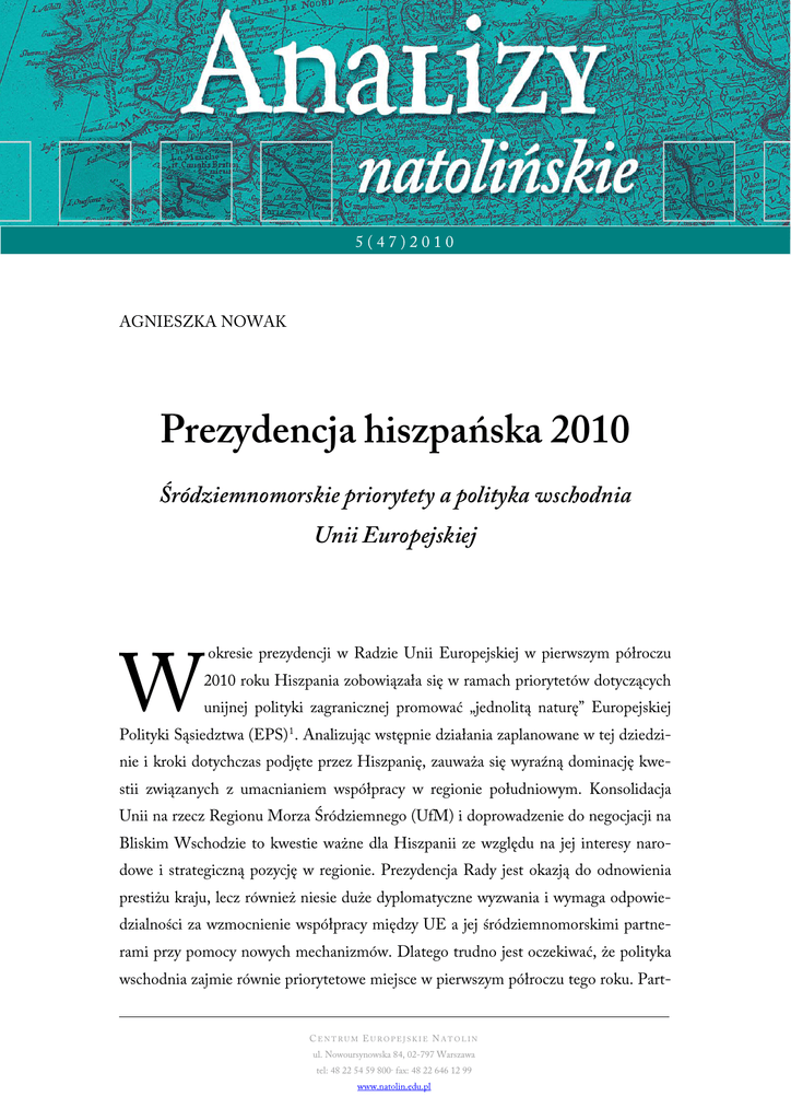1 5(47)2010 AGNIESZKA NOWAK Prezydencja hiszpańska 2010 Śródziemnomorskie priorytety a polityka wschodnia Unii Europejskiej W okresie prezydencji w Radzie Unii Europejskiej w pierwszym półroczu 2010 roku Hiszpania zobowiązała się w ramach priorytetów dotyczących unijnej polityki zagranicznej promować „jednolitą naturę” Europejskiej Polityki Sąsiedztwa (EPS) 1 . Analizując wstępnie działania zaplanowane w tej dziedzinie i kroki dotychczas podjęte przez Hiszpanię, zauważa się wyraźną dominację kwestii związanych z umacnianiem współpracy w regionie południowym. Konsolidacja Unii na rzecz Regionu Morza Śródziemnego (UfM) i doprowadzenie do negocjacji na Bliskim Wschodzie to kwestie ważne dla Hiszpanii ze względu na jej interesy narodowe i strategiczną pozycję w regionie. Prezydencja Rady jest okazją do odnowienia prestiżu kraju, lecz również niesie duże dyplomatyczne wyzwania i wymaga odpowiedzialności za wzmocnienie współpracy między UE a jej śródziemnomorskimi partnerami przy pomocy nowych mechanizmów. Dlatego trudno jest oczekiwać, że polityka wschodnia zajmie równie priorytetowe miejsce w pierwszym półroczu tego roku. Part- CENTRUM EUROPEJSKIE NATOLIN ul. Nowoursynowska 84, 02-797 Warszawa tel: 48 22 54 59 800· fax: 48 22 646 12 99 www.natolin.edu.pl 2 nerstwo Wschodnie (PW) zostało wprawdzie wymienione w programie prezydencji hiszpańskiej, jednakże ze względu na swoje usytuowanie geopolityczne Hiszpania nigdy nie miała znaczących interesów w Europie Wschodniej i fakt ten odbija się w braku wizji tego państwa, jeśli chodzi o umacnianie i dalszy rozwój PW. Nie oznacza to jednak braku dobrej woli ze strony rządu hiszpańskiego. W ramach polityki wschodniej prezydencja hiszpańska wykazała się zarówno zainteresowaniem, jak i pełnym poparciem dla inicjatyw związanych z promocją PW zaproponowanych przez państwa takie, jak Polska czy Czechy. Niezależnie od swoich narodowych interesów Hiszpania, będąc pierwszą prezydencją urzędującą na zasadach ustanowionych w traktacie z Lizbony, stoi przed symbolicznym wyzwaniem solidarnego promowania i jednolitego podejścia do kwestii polityki sąsiedztwa na południu i wschodzie Europy. Poniższa analiza jest refleksją nad tym, w jaki sposób Hiszpania i kolejne prezydencje rotacyjne mogłyby przyczynić się do równomiernego wzmocnienia EPS w obydwu regionach. Miejsce EPS w programie prezydencji hiszpańskiej Harmonijny rozwój EPS jest jednym z wielu priorytetów prezydencji hiszpańskiej i należy go analizować w kontekście całego programu. Biorąc pod uwagę fakt, że wprowadzenie w życie zmian instytucjonalnych przewidzianych przez traktat lizboński i wypracowanie nowych praktyk z nimi związanych jest warunkiem pomyślnej realizacji pozostałych priorytetów, Hiszpania musi poświęcić im dużo uwagi. Natomiast w kwestiach merytorycznych prezydencja hiszpańska przywiązuje pierwszorzędną wagę do kwestii ekonomicznych odziedziczonych po poprzednich prezydencjach. Debata w Parlamencie Europejskim nad programem zaprezentowanym 20 stycznia przez premiera Hiszpanii José Luisa Rodrígueza Zapatero skupiła się głównie na wypracowaniu nowej unijnej strategii rozwoju 2020, regulacji europejskich rynków finansowych, propozycji wspólnego rynku energetycznego oraz na kwestiach innowacyjności i ekologiczności europejskiej gospodarki. Pozostałe priorytety, którym poświęcono mniej uwagi podczas debaty, to zbliżenie instytucji unijnych do obywateli oraz umocnienie roli Unii na scenie międzynarodowej 2 . Bliskie i zrównoważone stosunki z krajami sąsiedzkimi Unii zostały wymienione jako jeden z priorytetów Hiszpanii dotyczących wzmocnienia roli UE na scenie międzynaCENTRUM EUROPEJSKIE NATOLIN ul. Nowoursynowska 84, 02-797 Warszawa tel: 48 22 54 59 800· fax: 48 22 646 12 99 www.natolin.edu.pl 3 rodowej. Oczywistą ambicją Hiszpanii jako inicjatora i promotora Procesu Barcelońskiego jest dalsze umacnianie integracji regionalnej na południu Europy. Hiszpania stoi jednak przed trudnym wyzwaniem odblokowania politycznego impasu między Izraelem i państwami arabskimi, który sparaliżował w ubiegłym roku funkcjonowanie Unii na rzecz Regionu Morza Śródziemnego. W celu ponownego nawiązania współpracy w regionie prezydencja hiszpańska zdecydowała się zaangażować dyplomatycznie na Bliskim Wschodzie. Ponadto wzmocnienie bilateralnych stosunków UE z Marokiem, Tunezją, Izraelem i Jordanią zostało wymienione w programie prezydencji. Natomiast we wschodniej polityce sąsiedztwa Hiszpania zapowiedziała promowanie Partnerstwa Wschodniego i stopniowego zbliżenia krajów partnerskich do UE. Hiszpania zadeklarowała również swoje zaangażowanie w budowanie strategicznych stosunków pomiędzy UE i Rosją. W jaki sposób Hiszpania w ramach prezydencji rotacyjnej może realizować priorytety związane z polityka zagraniczną i sąsiedztwa Unii? Po pierwsze szukając kompromisowych rozwiązań w Radzie UE, po drugie angażując merytorycznie Komisję Europejską i po trzecie współpracując blisko z Catherine Ashton, Wysokim Przedstawicielem Unii do Spraw Zagranicznych i Polityki Bezpieczeństwa/Wiceprzewodniczącą Komisji Europejskiej. Podczas przesłuchania w Parlamencie Europejskim jako członek nowej Komisji Barroso Ashton zapewniła o swoim zaangażowaniu w rozwój EPS. Zadeklarowała, iż „odpowiedzialność Unii za swoje sąsiedztwo jest ważna nie tylko per se, lecz również dlatego, że międzynarodowa wiarygodność Unii w szerszym znaczeniu zależy od tego, jak Unia układa swoje stosunki z sąsiadami” 3 . Wygląda więc, że Hiszpania znalazła w Wysokim Przedstawicielu sprzymierzeńca w promowaniu silnej polityki sąsiedztwa. Niemniej jednak trzeba pamiętać, iż jest to tylko jedno z wielu zadań, z którymi muszą się zmierzyć w tym półroczu zarówno Wysoki Przedstawiciel Unii, jak i urzędująca prezydencja. Agenda hiszpań