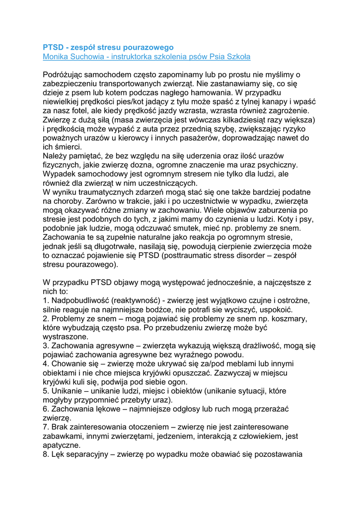 PTSD - zespół stresu pourazowego Monika Suchowia - instruktorka szkolenia psów Psia Szkoła Podróżując samochodem często zapominamy lub po prostu nie myślimy o zabezpieczeniu transportowanych zwierząt. Nie zastanawiamy się, co się dzieje z psem lub kotem podczas nagłego hamowania. W przypadku niewielkiej prędkości pies/kot jadący z tyłu może spaść z tylnej kanapy i wpaść za nasz fotel, ale kiedy prędkość jazdy wzrasta, wzrasta również zagrożenie. Zwierzę z dużą siłą (masa zwierzęcia jest wówczas kilkadziesiąt razy większa) i prędkością może wypaść z auta przez przednią szybę, zwiększając ryzyko poważnych urazów u kierowcy i innych pasażerów, doprowadzając nawet do ich śmierci. Należy pamiętać, że bez względu na siłę uderzenia oraz ilość urazów fizycznych, jakie zwierzę dozna, ogromne znaczenie ma uraz psychiczny. Wypadek samochodowy jest ogromnym stresem nie tylko dla ludzi, ale również dla zwierząt w nim uczestniczących. W wyniku traumatycznych zdarzeń mogą stać się one także bardziej podatne na choroby. Zarówno w trakcie, jaki i po uczestnictwie w wypadku, zwierzęta mogą okazywać różne zmiany w zachowaniu. Wiele objawów zaburzenia po stresie jest podobnych do tych, z jakimi mamy do czynienia u ludzi. Koty i psy, podobnie jak ludzie, mogą odczuwać smutek, mieć np. problemy ze snem. Zachowania te są zupełnie naturalne jako reakcja po ogromnym stresie, jednak jeśli są długotrwałe, nasilają się, powodują cierpienie zwierzęcia może to oznaczać pojawienie się PTSD (posttraumatic stress disorder – zespół stresu pourazowego). W przypadku PTSD objawy mogą występować jednocześnie, a najczęstsze z nich to: 1. Nadpobudliwość (reaktywność) - zwierzę jest wyjątkowo czujne i ostrożne, silnie reaguje na najmniejsze bodźce, nie potrafi sie wyciszyć, uspokoić. 2. Problemy ze snem – mogą pojawiać się problemy ze snem np. koszmary, które wybudzają często psa. Po przebudzeniu zwierzę może być wystraszone. 3. Zachowania agresywne – zwierzęta wykazują większą drażliwość, mogą się pojawiać zachowania agresywne bez wyraźnego powodu. 4. Chowanie się – zwierzę może ukrywać się za/pod meblami lub innymi obiektami i nie chce miejsca kryjówki opuszczać. Zazwyczaj w miejscu kryjówki kuli się, podwija pod siebie ogon. 5. Unikanie – unikanie ludzi, miejsc i obiektów (unikanie sytuacji, które mogłyby przypomnieć przebyty uraz). 6. Zachowania lękowe – najmniejsze odgłosy lub ruch mogą przerażać zwierzę. 7. Brak zainteresowania otoczeniem – zwierzę nie jest zainteresowane zabawkami, innymi zwierzętami, jedzeniem, interakcją z człowiekiem, jest apatyczne. 8. Lęk separacyjny – zwierzę po wypadku może obawiać się pozostawania nawet na chwilę bez opiekuna, na co może reagować np., szczekaniem, piszczeniem, niszczeniem. 9. Inne zachowania – depresja, zachowania kompulsywne. To, czy zwierzę szybko zostanie wyprowadzone z takiego stanu, zależy w dużej mierze od szybkiej reakcji właściciela. Istotna jest konsultacja z lekarzem weterynarii, zoopsychologiem, trenerem szkolenia psów w celu opracowania programu rehabilitacji zwierzęcia. Brak reakcji z naszej strony może jedynie pogorszyć jego stan.
