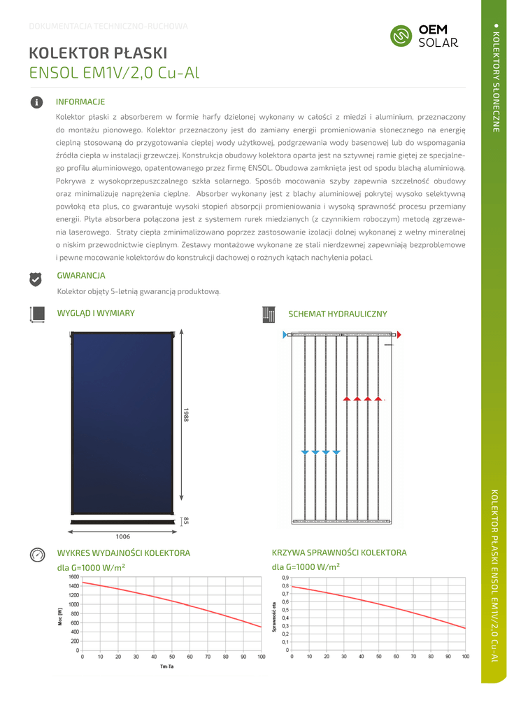 KOLEKTOR PŁASKI ENSOL EM1V/2,0 Cu-Al INFORMACJE Kolektor płaski z absorberem w formie harfy dzielonej wykonany w całości z miedzi i aluminium, przeznaczony do montażu pionowego. Kolektor przeznaczony jest do zamiany energii promieniowania słonecznego na energię KOLEKTORY SŁONECZNE DOKUMENTACJA TECHNICZNO-RUCHOWA cieplną stosowaną do przygotowania ciepłej wody użytkowej, podgrzewania wody basenowej lub do wspomagania źródła ciepła w instalacji grzewczej. Konstrukcja obudowy kolektora oparta jest na sztywnej ramie giętej ze specjalnego profilu aluminiowego, opatentowanego przez firmę ENSOL. Obudowa zamknięta jest od spodu blachą aluminiową. Pokrywa z wysokoprzepuszczalnego szkła solarnego. Sposób mocowania szyby zapewnia szczelność obudowy oraz minimalizuje naprężenia cieplne. Absorber wykonany jest z blachy aluminiowej pokrytej wysoko selektywną powłoką eta plus, co gwarantuje wysoki stopień absorpcji promieniowania i wysoką sprawność procesu przemiany energii. Płyta absorbera połączona jest z systemem rurek miedzianych (z czynnikiem roboczym) metodą zgrzewania laserowego. Straty ciepła zminimalizowano poprzez zastosowanie izolacji dolnej wykonanej z wełny mineralnej o niskim przewodnictwie cieplnym. Zestawy montażowe wykonane ze stali nierdzewnej zapewniają bezproblemowe i pewne mocowanie kolektorów do konstrukcji dachowej o rożnych kątach nachylenia połaci. GWARANCJA Kolektor objęty 5-letnią gwarancją produktową. WYGLĄD I WYMIARY SCHEMAT HYDRAULICZNY 1988 WYKRES WYDAJNOŚCI KOLEKTORA KRZYWA SPRAWNOŚCI KOLEKTORA dla G=1000 W/m² dla G=1000 W/m² KOLEKTOR PŁASKI ENSOL EM1V/2,0 Cu-Al 85 1006 KOLEKTORY SŁONECZNE DANE TECHNICZNE Parametry techniczne KOLEKTOR PŁASKI ENSOL EM1V/2,0 Cu-Al konstrukcja: kolektor płaski do montażu pionowego wymiary: 1988 x 1006 x 85 [mm] powierzchnia: 2,00 [m²] waga: 39 [kg] współczynnik kąta padania: 0,86 sprawność optyczna: 78,8% współczynnik strat ciepła a1: 3,485 [W/( m²K)] współczynnik strat ciepła a2: 0,017 [W/(m²K²)] przyłącza rura Cu: ø22 [mm] obudowa: profil aluminiowy pokrywa: szkło solarne 4,0 mm absorber: blacha aluminiowa o grubości 0,5 mm pokrycie blachy absorbera: warstwa wysokoselektywna technologia wykonania: zgrzewanie laserowe współczynnik absorpcji: 95% współczynnik emisji: 5% wymiary absorbera: 1946 x 964 powierzchnia absorbera/powierzchnia czynna: 1,876 m² zawartość płynu: 1,2 dm³ temperatura równowagi: 208 °C gwarantowany minimalny uzysk cieplny 525 kWh/m²/rok zalecany przepływ: 1-1,5 dm³/min dopuszczalny przepływ: 0,83-3,6 dm³/min izolacja: wełna mineralna współczynnik przewodzenia: 0,035 W/mK grubość warstwy izolacji dolnej: 40 mm grubość warstwy izolacji bocznej: 10 mm Solar Keymak: 011-7S2606 F