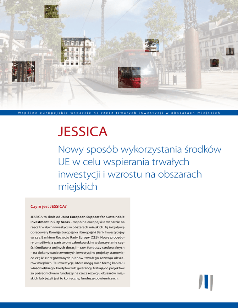 Wspólne europejskie wsparcie na rzecz trwałych inwestycji w obszarach miejskich JESSICA Nowy sposób wykorzystania środków UE w celu wspierania trwałych inwestycji i wzrostu na obszarach miejskich Czym jest JESSICA? JESSICA to skrót od Joint European Support for Sustainable Investment in City Areas – wspólne europejskie wsparcie na rzecz trwałych inwestycji w obszarach miejskich. Tę inicjatywę opracowały Komisja Europejska i Europejski Bank Inwestycyjny wraz z Bankiem Rozwoju Rady Europy (CEB). Nowe procedury umożliwiają państwom członkowskim wykorzystanie części środków z unijnych dotacji – tzw. funduszy strukturalnych – na dokonywanie zwrotnych inwestycji w projekty stanowiące część zintegrowanych planów trwałego rozwoju obszarów miejskich. Te inwestycje, które mogą mieć formę kapitału właścicielskiego, kredytów lub gwarancji, trafiają do projektów za pośrednictwem funduszy na rzecz rozwoju obszarów miejskich lub, jeżeli jest to konieczne, funduszy powierniczych. 8TQØMOF FVSPQFKTLJF XTQBSDJF OB S[FD[ USXBZDI JOXFTUZDKJ X PCT[BSBDI NJFKTLJDI t 8TQØMOF FVSPQFKTLJF XTQBS Co to jest „zintegrowany plan trwałego rozwoju obszarów miejskich?” Zintegrowany plan trwałego rozwoju obszarów miej- Kiedy ta inicjatywa wchodzi w życie? skich obejmuje system wzajemnie powiązanych działań, mający na celu trwałe usprawnienia gospodarczych, fizycznych, społecznych i środowiskowych Pakiet legislacyjny funduszy strukturalnych UE warunków miasta lub obszaru w obrębie miasta. Klu- na okres programowania 2007-2013 określa ramy czową rolę w tym procesie odgrywa „integracja”, co operacyjne JESSIKI . Procedury operacyjne są oznacza, że wszystkie polityki, projekty i propozycje obecnie opracowywane i wejdą w życie po formal- są rozpatrywane we wzajemnej relacji między sobą. nym uzgodnieniu programów operacyjnych z Ko- Należy dążyć do takich synergii pomiędzy składnikami misją Europejską. planu, żeby wpływ wywierany przez plan jako całość 1 2 był większy niż suma jego indywidualnych składników Państwa członkowskie, aby zakwalifikować się do realizowanych oddzielnie. finansowania w ramach JESSIKI, muszą załączyć do swoich programów operacyjnych program rozwo- W wielu państwach członkowskich lokalne i dzielnico- ju miast; jeżeli to możliwe, powinny również załą- we plany rozwoju, które zostały opracowane i przyjęte czyć oświadczenie o potencjalnym wykorzystaniu zgodnie z istniejącymi protokołami planowania, mają JESSIKI w realizacji tego programu. Państwa człon- szansę spełnienia tej definicji. Plany niestatutowe i kowskie muszą również zadecydować, jaką część inne dokumenty polityki, które zostały zatwierdzone funduszy strukturalnych pragną wykorzystać przy w następstwie konsultacji publicznych i właściwych pomocy JESSIKI. ocen wpływu na wspólnotę, również mogą stanowić odpowiednią podstawę do zintegrowanego rozwoju JESSICA nie jest nowym źródłem finansowania dla obszarów miejskich. państw członkowskich, ale raczej nowym sposobem wykorzystywania obecnych dotacji z funduszy strukturalnych na wsparcie dla projektów roz- EBI, który w ciągu ubiegłych pięciu lat udzielił kredytów na woju obszarów miejskich. kwotę około 30 mld EUR na projekty transportu miejskiego i odnowy miejskiej, ma duże doświadczenie w przygotowywaniu i finansowaniu projektów rozwoju obszarów miejskich w Europie. Bank, w następstwie zgody Rady Unii Europejskiej 3 na zaliczenie odnowy miejskiej do jednej z głównej polityk wspól- 1 Są to następujące rozporządzenia: rozporządzenie Rady (WE) nr 1083/2006, art. 36, 44 i 78, rozporządzenie (WE) nr 1080/2006 Parlamentu Europejskiego i Rady, art. 7 i 8; oraz rozporządzenie Komisji (WE) nr 1828/2006, art. 43, 44, 45 i 46. 2 Programy operacyjne to szczegółowe strategie uzgadnianie pomiędzy państwami członkowskimi i Komisją Europejską. Dotyczą wykorzystania unijnych funduszy strukturalnych i wkładu w ramach finansowania uzupełniającego w okresie programowania 2007-2013. 2 notowych, zwiększy swoje zaangażowanie w tym sektorze. Na wniosek promotora projektu rozważy także możliwość przeznaczenia środków własnych na projekty odnowy miejskiej wspierane przez JESSIKĘ. 3 Nieformalne ministerialne spotkanie w Lipsku 24-25 maja 2007 roku. SDJF OB S[FD[ USXBZDI JOXFTUZDKJ X PCT[BSBDI NJFKTLJDI t 8TQØMOF FVSPQFKTLJF XTQBSDJF OB S[FD[ USXBZDI JOXFTUZ W jaki sposób są przekazywane fundusze JESSIKI? KOMISJA EUROPEJSKA Dotacje w ramach funduszy strukturalnych INNI INWESTORZY PAŃSTWO CZŁONKOWSKIE lub REGION (publiczni i prywatni) za pośrednictwem wyznaczonej władzy zarządzającej MIASTA Fundusz powierniczy FUNDUSZ NA RZECZ ROZWOJU OBSZARÓW MIEJSKICH Inwestycje (kapitał właścicielski, kredyty lub gwarancje) Kredyty Wkład również w postaci ziemi i budynków Międzynarodowe instytucje finansowe/ banki Projekty stanowiące część zintegrowanego planu trwałego rozwoju obszarów miejskich Czym są fundusze na rzecz rozwoju obszarów miejskich? Fundusze na rzecz rozwoju obszarów miejskich są to fundusze inwestujące w partnerstwa publiczno-prywatne i inne projekty zawarte w zintegrowanym planie trwałego rozwoju obszarów miejskich. Te fundusze, aby kwalifikować się do finansowania w ramach JESSIKI, muszą wykazać się, między innymi, odpowiednimi kompetencjami i niezależnością zarządzania; posiadać całościowy plan biznesowy i budżet na realizację kwalifikowanych projektów oraz solidną bazę finansową. Fundusze na rzecz rozwoju obszarów miejskich, chociaż nie mają konkretnej formy prawnej, mogą być odrębnym podmiotem prawa lub zostać powołane jako „wydzielona jednostka finansowa” w ramach istniejącej instytucji finansowej. W takich wypadkach środki JESSIKI muszą być księgowane oddzielnie i wyraźnie wyodrębnione z innych aktywów danej instytucji finansowej. Fundusze na rzecz rozw
