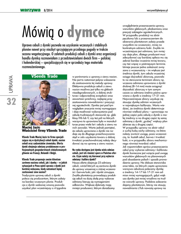 warzywa 8/2014 [email protected] Mówią o dymce VSeeds Trade 32 Maciej Jazic Właściciel firmy VSeeds Trade VSeeds Trade Maciej Jazic to firma specjalizująca się w dystrybucji cebuli dymki, nasion cebuli oraz sadzeniaków ziemniaka. Oferta dymki obejmuje odmiany produkowane w profesjonalnych gospodarstwach zlokalizowanych głównie we Francji, Holandii i Belgii. VSeeds Trade proponuje swoim klientom zarówno nasiona cebuli, jak i dymkę – w jakich sytuacjach w Pana opinii uprawa z dymki jest bardziej wskazana, kiedy natomiast lepiej zastosować siew nasion? Tradycyjnie uprawę cebuli z dymki poleca się producentom, którym zależy na bardzo wczesnym plonie. Produkcja z dymki sadzonej wiosną pozwala uzyskać plon wcześniejszy o 4 tygodnie Zdjęcia: A. Czerwińska-Nowak, firmowe UPRAWA Uprawa cebuli z dymki pozwala na uzyskanie wczesnych i stabilnych plonów nawet przy niezbyt sprzyjającym przebiegu pogody w trakcie sezonu wegetacyjnego. O zaletach produkcji cebuli z dymki oraz organizacji handlu dymką rozmawiałam z przedstawicielami dwóch firm – polskiej i holenderskiej – specjalizujących się w sprzedaży tego materiału rozmnożeniowego. w porównaniu z uprawą z siewu nasion. Nie jest to natomiast jedyne wskazanie do zastosowania tej metody uprawy. Efektywna produkcja cebuli z siewu nasion możliwa jest tylko na glebach niezdegradowanych, o dobrej strukturze i odpowiedniej zwięzłości oraz zawartości próchnicy, najlepiej przy zastosowaniu nawadniania i precyzyjnej agrotechniki. Dymka jest pod tym względem znacznie mniej wymagająca i daje możliwość wykorzystania pod cebulę trudniejszych stanowisk np. gleb klasy IVb lub V, czy też pól na których warzywo to uprawiane było w monokulturze przez wiele lat i cebula z siewu na nich zawodzi. Warto jednak pamiętać, że cebula uprawiana z dymki nie nadaje się do długiego przechowywania stąd w celu uzyskania towaru o dobrej trwałości przechowalniczej należy decydować się na uprawę z siewu nasion. Na rynku dostępna jest dymka wielu odmian cebuli, jest ich również sporo w Państwa ofercie. Czym należy się kierować przy wyborze odmiany i kalibru dymki? Nasza oferta obejmuje 23 odmiany cebuli, wśród których są zarówno dymki do uprawy wiosennej o różnej wczesności i barwie łuski, jak i dymki zimujące. Zwykle plantatorzy prowadzący produkcję cebuli na dużą skalę przy wyborze odmiany kierują się wymaganiami odbiorców. Większe dylematy mają mniejsi producenci, którym doradzamy uwzględnienie przeznaczenia uprawy, warunków glebowych, płodozmianu oraz precyzji zabiegów agrotechnicznych. W przypadku produkcji na zbiór pęczkowy lub z przeznaczeniem do obierania plantatorom zależy przede wszystkim na wczesności, mniej na konkretnym odcieniu łuski. Zwykle im wcześniejsza jest odmiana, tym mniejszy daje plon, dlatego producent musi zdecydować czy bardziej opłaca mu się zebrać bardzo wcześnie mniej towaru, czy też więcej w późniejszym terminie. Istnieje jeszcze jedna zależność związana z wczesnością – im większa jest średnica dymki, tym cebula wcześniej osiąga dojrzałość zbiorczą, pozwala to na sterowanie terminem zbioru np. wczesna odmiana uprawiana z dymki drobnej (8–14 mm) może osiągnąć dojrzałość zbiorczą w tym samym czasie co odmiana średnio późna uprawiana z dymki o średnicy 17–21 mm. Najwcześniejsze zbiory uzyskuje się stosując dymkę odmian wczesnych w największym kalibrażu. Warto wiedzieć, że średnica dymki determinuje również wielkość plonu – uprawiając na jednej części pola cebulę z dymki o małej średnicy a na drugiej części tę samą odmianę z dymki „grubej” większy plon zbierze się z drugiej części. W przypadku uprawy na zbiór cebul z suchą łuską cechy odmiany, na które należy zwrócić uwagę, poza wczesnością, to: kształt cebul, barwa i trwałość łuski, a w przypadku zbioru mechanicznego również twardość cebul. Jak wspomniałem oprócz przeznaczenia cebul przy wyborze odmiany i kalibrażu dymki konieczne jest wzięcie pod uwagę warunków glebowych na planowanych pod obsadzenie polach i sposób prowadzenia uprawy. Na słabsze stanowiska oraz takie, na których często uprawiano warzywa cebulowe polecamy dymkę o średnicy 14–17 lub 17–21 mm odmian mniej wymagających, gdyż większa dymka jest mniej wrażliwa na trudne warunki uprawy. Podobne zalecenia dajemy plantatorom, którzy nie stosują nawadniania i/lub nawożą uprawy na podstawie ogólnych wytycznych bez uprzedniego badania zasobności gleby w składniki pokarmowe. W przypadku gleb utrzymanych w dobrej kulturze, przepuszczalnych i próchniczych można zaryzykować sadzenie dymki o najmniejszym kalibrażu i co się z tym wiąże najtańszej – jednak zazwyczaj doradzamy odbiorcom, aby kupili dymkę w dwóch kalibrażach – wówczas cebula z większych wysadków będzie się nadawała do zbioru kilka dni wcześniej, niż ta z wysadków mniejszych, pozwoli to rozłożyć zbiór w czasie. Informacje o cechach i wymaganiach wszystkich odmian, które mamy w swojej ofercie zdobywamy przede wszystkim na podstawie doświadczeń porównawczych prowadzonych corocznie w naszym gospodarstwie. Pozwalają nam one określić wczesność i plonowanie odmian w polskich warunkach klimatyczno-glebowych i dostarczać swoim odbiorcom, w pakiecie z dymką, fachowe doradztwo. Jakie są różnice w uprawie ozimej z dymki oraz tej z wiosennego sadzenia? Wybór odmian dymki przeznaczonych do uprawy ozimej jest znacznie mniejszy niż tych do uprawy wiosennej. Wspólną cechą odmian zimujących jest nieco większa skłonność do wybijania w pędy kwiatostanowe, jednak ich zbiory przypadają o ponad 2 tygodnie wcześniej niż najwcześniejszych odmian z wiosennego sadzenia. Istnieją pewne różnice w uprawie ozimej i wiosennej – w pierwszym przypadku dymkę należy sadzić o ok. 0,5 cm głębiej (warstwa gleby przykrywającej cebulki powinna wy