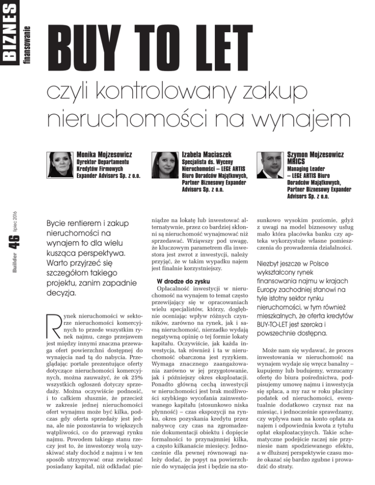 finansowanie BIZNES BUY TO LET czyli kontrolowany zakup nieruchomości na wynajem Monika Mojzesowicz Builder 46 lipiec 2016 Dyrektor Departamentu Kredytów Firmowych Expander Advisors Sp. z o.o. Bycie rentierem i zakup nieruchomości na wynajem to dla wielu kusząca perspektywa. Warto przyjrzeć się szczegółom takiego projektu, zanim zapadnie decyzja. R ynek nieruchomości w sektorze nieruchomości komercyjnych to przede wszystkim rynek najmu, czego przejawem jest między innymi znaczna przewaga ofert powierzchni dostępnej do wynajęcia nad tą do nabycia. Przeglądając portale prezentujące oferty dotyczące nieruchomości komercyjnych, można zauważyć, że ok 25% wszystkich ogłoszeń dotyczy sprzedaży. Można oczywiście podnosić, i to całkiem słusznie, że przecież w zakresie jednej nieruchomości ofert wynajmu może być kilka, podczas gdy oferta sprzedaży jest jedna, ale nie pozostawia to większych wątpliwości, co do przewagi rynku najmu. Powodem takiego stanu rzeczy jest to, że inwestorzy wolą uzyskiwać stały dochód z najmu i w ten sposób utrzymywać oraz zwiększać posiadany kapitał, niż odkładać pie- Izabela Maciaszek Specjalista ds. Wyceny Nieruchomości – LEGE ARTIS Biuro Doradców Majątkowych, Partner Biznesowy Expander Advisors Sp. z o.o. niądze na lokatę lub inwestować alternatywnie, przez co bardziej skłonni są nieruchomość wynajmować niż sprzedawać. Wziąwszy pod uwagę, że kluczowym parametrem dla inwestora jest zwrot z inwestycji, należy przyjąć, że w takim wypadku najem jest finalnie korzystniejszy. W drodze do zysku Opłacalność inwestycji w nieruchomość na wynajem to temat często przewijający się w opracowaniach wielu specjalistów, którzy, dogłębnie oceniając wpływ różnych czynników, zarówno na rynek, jak i samą nieruchomość, nierzadko wydają negatywną opinię o tej formie lokaty kapitału. Oczywiście, jak każda inwestycja, tak również i ta w nieruchomość obarczona jest ryzykiem. Wymaga znacznego zaangażowania zarówno w jej przygotowanie, jak i późniejszy okres eksploatacji. Ponadto główną cechą inwestycji w nieruchomości jest brak możliwości szybkiego wycofania zainwestowanego kapitału (stosunkowo niska płynność) – czas ekspozycji na rynku, okres pozyskania kredytu przez nabywcę czy czas na zgromadzenie dokumentacji obiektu i dopięcie formalności to przynajmniej kilka, a często kilkanaście miesięcy. Jednocześnie dla pewnej równowagi należy dodać, że popyt na powierzchnie do wynajęcia jest i będzie na sto- Szymon Mojzesowicz MRICS Managing Leader – LEGE ARTIS Biuro Doradców Majątkowych, Partner Biznesowy Expander Advisors Sp. z o.o. sunkowo wysokim poziomie, gdyż z uwagi na model biznesowy usług mało która placówka banku czy apteka wykorzystuje własne pomieszczenia do prowadzenia działalności. Niezbyt jeszcze w Polsce wykształcony rynek finansowania najmu w krajach Europy zachodniej stanowi na tyle istotny sektor rynku nieruchomości, w tym również mieszkalnych, że oferta kredytów BUY-TO-LET jest szeroka i powszechnie dostępna. Może nam się wydawać, że proces inwestowania w nieruchomość na wynajem wydaje się wręcz banalny – kupujemy lub budujemy, wrzucamy ofertę do biura pośrednictwa, podpisujemy umowę najmu i inwestycja się spłaca, a my raz w roku płacimy podatek od nieruchomości, ewentualnie dodatkowo czynsz raz na miesiąc, i jednocześnie sprawdzamy, czy wpływa nam na konto opłata za najem i odpowiednia kwota z tytułu opłat eksploatacyjnych. Takie schematyczne podejście raczej nie przyniesie nam spodziewanego efektu, a w dłuższej perspektywie czasu może okazać się bardzo zgubne i prowadzić do straty. Za najbardziej atrakcyjne na wynajem należy uznać obiekty, które są możliwie uniwersalne pod względem wykorzystania, oraz takie, które są najczęściej poszukiwane na rynku (biura/ usługi/handel czy też takie, których sposób użytkowania można zmienić bez konieczności ponoszenia znacznych nakładów. Wziąwszy pod uwagę, że inwestowanie w nieruchomości to proces wieloletni, za najbardziej atrakcyjne należy uznać obiekty, które są możliwie uniwersalne pod względem wykorzystania, oraz takie, które są najczęściej poszukiwane na rynku (biura/usługi/handel), czy też takie, których sposób użytkowania można zmienić bez konieczności ponoszenia znacznych nakładów. Struktura obiektu, która nie jest mocno skonkretyzowana, powoduje bowiem, że naszą ofertą może być zainteresowana większa liczba potencjalnych najemców. Nie można zapominać o tym, że nie jesteśmy w stanie do końca przewidzieć, na jakie powierzchnie będzie popyt w przyszłości, a inwestycja jest przecież wieloletnia i zależy nam, aby była konkurencyjna w długim okresie eksploatacji. BUY-TO-LET (pol. kupić, aby wynająć) jest to typ kredytu charakteryzujący się tym, że podstawą do liczenia zdolności kredytowej jest czynsz uzyskiwany z najmu nieruchomości, jaką chcemy zakupić. Ryzyko finansowania takiej inwestycji polega na tym, że rynkowo kwoty najmu mogą być różne, co stanowi ryzyko dla banku pod względem odpowiedniego określenia stawki czynszu, a w przypadku okresów, kiedy lokal/mieszkanie nie ma najemcy, ryzykiem jest brak dochodu z najmu. Dla zmniejszenia ryzyka inwestorzy decydujący się na taki rodzaj inwestycji powinni posiadać tzw. rezerwy na czas braku ewentualnego najmu. Kredyty buy to let przyznawane są na zakup nieruchomości niekomercyjnych. A co w przypadku komercji? W bankach dominuje prosta zasada: wskaźnik udziału kredytu w łącznych kosztach projektu (LTC), stosunku kwoty kredytu do wartości rynkowej nieruchomości (LTV) oraz pokrycia długu (DSCR) nie powinny przekraczać odpowiednio: 70% (LTC oraz LTV) i 120% (DSCR). Co potocznie oznacza, że klient powinien mieć 30% wkładu własnego liczonego od kwoty netto zakupu; rata kredytu nie powinna przekraczać 70% wartości c