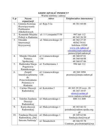 L.p 1. 2. 3. 4. 5. 6. 7. 8. 9. 10. GDZIE SZUKAĆ POMOCY? Ważne telefony i adresy Adres Telefon/adres internetowy Nazwa organizacji Gminna Komisja ul: Reja 5/2a Rozwiązywania Problemów Alkoholowych Komenda Miejska ul: 11 Listopada37/59 Policji w Radomiu Ośrodek ul: Malczewskiego 22 Interwencji Kryzysowej 48 381 04 00 ul: Tochtermana 1 997 lub 112 48 345 26 20 48 362 27 45 48362 54 61 Infolinia 19288 www.oik.radom.pl oś[email protected] [email protected] 48 360 87 01 48 360 84 88 48 360 87 06 996 lub 112 ul: Limanowskiego 134 48 360 1094 [email protected] Miejski Ośrodek Pomocy Społecznej Radomska Stacja Pogotowia Ratunkowego Zespół Interdyscyplinarny ds. Przeciwdziałania Przemocy w Rodzinie Caritas Diecezji Radomskiej ul :Limanowskiego 134 Telefon Zaufania Diecezji Radomskiej Kuria diecezji Radomskiej ul: Malczewskiego 1 ul: Kościelna 5 ul: Malczewskiego 1 Fundacja Diecezji ul: Malczewskiego 1 Radomskiej „Dać Sercom Nadzieję” ul: Śniadeckich 48 365 29 29 wew. 28 48 365 10 87 [email protected] www.radom.caritas.pl 800 311 800 48 383 66 52 [email protected]. pl 48 349 62 06 [email protected] 48 366 93 78 Centrum_psychoterapii@wp ul: Śniadeckich 1/24 11. Stowarzyszenie Animatorów i Pedagogów Społecznych 12. Stowarzyszenie „Monar” ul: Struga57 A 13. Caritas Diecezji Radomskiej ul: Kościelna 5 14. Katolicki Ruch Antynarkotyczny KARAN ul: Reja5/1 15. Polski Związek głuchych ul: 25 Czerwca 68 16. Polskie Centrum Mediacji ul: Rynek 9 lok. 4 17. Stowarzyszenie „BEZPIECZNE MIASTO” ul: Moniuszki 9 p.16 18. Towarzystwo Przyjaciół Dzieci ul: Malczewskiego 20 b 19. Poradnia ul: Kolejowa 22 Psychologiczna nr 1 20. Poradnia ul: Toruńska 9 PsychologicznoPedagogiczna nr 2 .pl 513 559 829 514 398 697 [email protected] www.pedagogulicy.blogspot. com 48 364 76 00 [email protected] www.monar.org 48 365 29 29 wew. 24 48 365 10 87 [email protected] www.radom.caritas.pl 48 362 20 46 800 120 289 48 360 46 05 [email protected] [email protected] www.karan.pl 48 36 306 12 48 36 305 97 606 393 532 [email protected] www.pzgradom.webpark.pl 603 887165 608 383 234 [email protected] www.pcm.mediator.org 48 362 08 84 48 362 06 95 [email protected] www.radom.pl/bezpieczne 48 362 27 45 48 362 54 61 oś[email protected] www.tpd.radom.pl 48 360 20 97 48 360 20 97 48 331 24 98 21. Poradnia PsychologicznoPedagogiczna nr 3 22. Komenda Miejska Policji (Policyjna Izba Zatrzymań) 23. Policyjna Izba Dziecka 24. Zespół Pracy Socjalnej nr 10 ul: Główna 3 48 331 45 10 ul: 11 Listopada 37/59 997 lub 112 48 345 26 20 ul: 11 Listopada 37/59 48 345 24 25 ul: Krasickiego 1 48 360 85 40