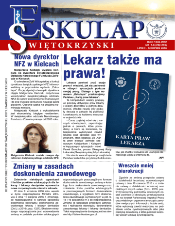 SKULAP WIĘTOKRZYSKI BEZPŁATNY BIULETYN INFORMACYJNY ŚWIĘTOKRZYSKIEJ IZBY LEKARSKIEJ W KIELCACH Nowa dyrektor NFZ w Kielcach Małgorzata Kiebzak wygrała konkurs na dyrektora Świętokrzyskiego Oddziału Narodowego Funduszu Zdrowia w Kielcach. O odwołaniu Zofii Wilczyńskiej z funkcji dyrektora świętokrzyskiego NFZ informowaliśmy w poprzednim wydaniu „Eskulapa”. Po jej dymisji obowiązki dyrektora objęła Małgorzata Kiebzak, dotychczas wicedyrektor świętokrzyskiego oddziału NFZ do spraw ekonomiczno-finansowych i to ona wygrała konkurs na nowego szefa placówki. Obecnie czeka na oficjalną nominację ministra. Małgorzata Kiebzak z wykształcenia jest ekonomistą, biegłym rewidentem. W świętokrzyskim oddziale Narodowego Funduszu Zdrowia pracuje od 2005 roku. Małgorzata Kiebzak została nowym dyrektorem świętokrzyskiego oddziału NFZ. Lekarz także ma prawa! Lekarze powinni znać swoje prawa i wiedzieć, jak się zachować w różnych sytuacjach podczas swojej pracy. Dlatego z tym numerem „Eskulapa” przekazujemy Państwu „Kartę praw lekarza”. To kompendium wiedzy grupujące przepisy dotyczące praw lekarzy i lekarzy dentystów w jednym dokumencie. Władze naszej Izby podjęły decyzję o zakupie tej publikacji i przekazaniu jej każdemu lekarzowi w województwie. - Coraz częściej mówi się o naszych obowiązkach, zapominając jednak o prawach, które posiadamy, a które są konieczne, by bezpiecznie wykonywać zawód lekarza oraz sprostać jego wyzwaniom. Mam nadzieję, że „Karta praw lekarza” pomoże szanownym Koleżankom i Kolegom w kryzysowych sytuacjach - mówi Paweł Barucha, prezes Okręgowej Rady Lekarskiej Świętokrzyskiej Izby Lekarskiej. Na stronie www.sil.apsnet.pl znajdziecie Państwo także kilka przydatnych dokumen- Zmiany w zasadach doskonalenia zawodowego Zniesienie niektórych ograniczeń i limitów punktów edukacyjnych dla lekarzy i lekarzy dentystów wprowadza nowe rozporządzenie ministra zdrowia. W dniu 8 września 2016 roku weszło w życie rozporządzenie Ministra Zdrowia z dnia 11 sierpnia 2016 r. zmieniające rozporządzenie w sprawie sposobów dopełnienia obowiązku doskonalenia zawodowego lekarzy i lekarzy dentystów (Dz.U. z 2016 r. poz. 1327). Skutkiem niniejszego rozporządzenia jest wprowadzenie zmiany w podziale punktów edukacyjnych ISSN 1233-3972 NR 7-8 (292-293) LIPIEC - SIERPIEŃ 2016 odpowiadających poszczególnym formom doskonalenia zawodowego, zmiany w katalogu form doskonalenia zawodowego oraz zniesienie limitu punktów edukacyjnych w poszczególnych formach doskonalenia zawodowego, z wyjątkiem form doskonalenia zawodowego wymienionych w pkt. 6, 18 i 19 załącznika nr 3 do rozporządzenia. Zmiana ta upraszcza procedurę uznawania i rozliczania obowiązku doskonalenia zawodowego lekarzy i lekarzy dentystów. Tekst rozporządzenia dostępny jest na stronie http://dziennikustaw.gov.pl. tów, jak choćby wezwanie do usunięcia obraźliwego wpisu z internetu itp. /AP/ Wreszcie mniej biurokracji Zgodnie ze zmianą przepisów ustawy o działalności leczniczej wprowadzonymi ustawą z dnia 10 czerwca 2016 r. o zmianie ustawy o działalności leczniczej oraz niektórych innych ustaw (Dz.U. 2016, poz. 916) kierownicy podmiotów leczniczych zostali zwolnieni z obowiązku przekazywania raz na kwartał Państwowej Inspekcji Pracy oraz właściwym organom samorządu zawodów medycznych informacji o liczbie osób, które wykonują zawód medyczny na podstawie umów cywilnoprawnych albo jako praktykę zawodową, z którą podmiot leczniczy zawarł umowę cywilnoprawną. INFORMACJA PREZESA ORL W NUMERZE Wygasają umowy upoważniające do wystawiania recept na leki refundowane 1 stycznia 2017 r. wygasną umowy upoważniające do wystawiania recept na leki refundowane. NFZ będzie przydzielał indywidualne numery recept. Lekarzy i lekarzy dentystów będą obowiązywać nowe zasady pobierania numerów recept na leki refundowane. Jeżeli będą chcieli korzystać z tego uprawnienia, będą musieli uzyskać indywidualne numery recept przydzielane przez Narodowy Fundusz Zdrowia. Czytaj na stronie 4 Pytania z egzaminów medycznych wciąż tajne Dyrektor Centrum Egzaminów Medycznych odmówił udostępnienia Naczelnej Izbie Lekarskiej pytań z egzaminów LEK, LDEK i PES, mimo że Trybunał Konstytucyjny uznał, iż nie ma podstaw, by utajniać te pytania. Jakie jest uzasadnienie decyzji dyrektora CEM. Czytaj na stronie 6 Leki 75+. Kto może je ordynować i o czym trzeba pamiętać wystawiając receptę Od września osobom, które ukończyły 75 lat przysługują bezpłatne leki. Taki najczęściej przekaz dociera do pacjentów. Prawda jednak jest taka, że nie wszystkie leki są bezpłatne, nie każdy lekarz może je ordynować, a wypisanie recepty dla seniora wymaga szczególnej uwagi. Czytaj na stronie 8 Ministerstwo Zdrowia zaprezentowało założenia reformy ochrony zdrowia. Można dyskutować nad rodzajem i ilością tych nowości. Zastanowić się należy, kto ma wdrażać te reformy. Czy nowe można oprzeć na starym (NFZ ze zmienionym szyldem). Trzeba poddać dyskusji sieć szpitali - czy Świętokrzyskie musi znowu być w „ogonie”. Jednak cała dyskusja skończy się na najważniejszym wniosku – za mało pieniędzy z budżetu państwa przeznacza się na zdrowie. Nie da się zachować medycyny na obecnym poziomie, a co dopiero ją rozwinąć bądź zmienić za 4% PKB. Tylko Turcja wydaje podobne pieniądze na zdrowie swoich obywateli. Mówienie o 6% w roku 2025 pokazuje niestety, że zdrowie nie należy do priorytetów rządu. Za 9 lat, żeby zabezpieczyć starzejące się społeczeństwo, będzie trzeba wydać 10% PKB. I znowu braknie. Szkoda, że aby zainteresować polityków problemami ochrony zdrowia trzeba wykrzyczeć je na ulicy. Najwyższa pora zrozumieć tych, którzy leczą i tych, którzy są leczeni. To nie kwestia ustępstw, to sprawa bezpieczeństwa narodowego. W tym roku powinna rozpocząć się budow