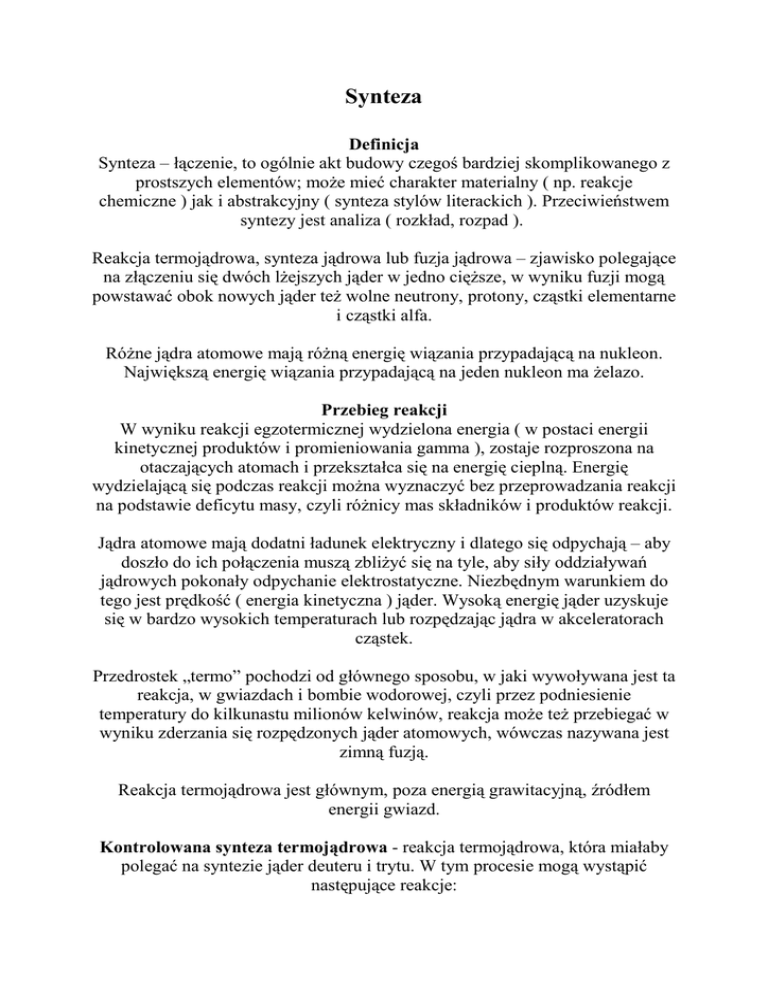 Synteza Definicja Synteza – łączenie, to ogólnie akt budowy czegoś bardziej skomplikowanego z prostszych elementów; może mieć charakter materialny ( np. reakcje chemiczne ) jak i abstrakcyjny ( synteza stylów literackich ). Przeciwieństwem syntezy jest analiza ( rozkład, rozpad ). Reakcja termojądrowa, synteza jądrowa lub fuzja jądrowa – zjawisko polegające na złączeniu się dwóch lżejszych jąder w jedno cięższe, w wyniku fuzji mogą powstawać obok nowych jąder też wolne neutrony, protony, cząstki elementarne i cząstki alfa. Różne jądra atomowe mają różną energię wiązania przypadającą na nukleon. Największą energię wiązania przypadającą na jeden nukleon ma żelazo. Przebieg reakcji W wyniku reakcji egzotermicznej wydzielona energia ( w postaci energii kinetycznej produktów i promieniowania gamma ), zostaje rozproszona na otaczających atomach i przekształca się na energię cieplną. Energię wydzielającą się podczas reakcji można wyznaczyć bez przeprowadzania reakcji na podstawie deficytu masy, czyli różnicy mas składników i produktów reakcji. Jądra atomowe mają dodatni ładunek elektryczny i dlatego się odpychają – aby doszło do ich połączenia muszą zbliżyć się na tyle, aby siły oddziaływań jądrowych pokonały odpychanie elektrostatyczne. Niezbędnym warunkiem do tego jest prędkość ( energia kinetyczna ) jąder. Wysoką energię jąder uzyskuje się w bardzo wysokich temperaturach lub rozpędzając jądra w akceleratorach cząstek. Przedrostek „termo” pochodzi od głównego sposobu, w jaki wywoływana jest ta reakcja, w gwiazdach i bombie wodorowej, czyli przez podniesienie temperatury do kilkunastu milionów kelwinów, reakcja może też przebiegać w wyniku zderzania się rozpędzonych jąder atomowych, wówczas nazywana jest zimną fuzją. Reakcja termojądrowa jest głównym, poza energią grawitacyjną, źródłem energii gwiazd. Kontrolowana synteza termojądrowa - reakcja termojądrowa, która miałaby polegać na syntezie jąder deuteru i trytu. W tym procesie mogą wystąpić następujące reakcje: 2H + 2H → 3H + p + 4,03 MeV 2H + 2H → 3He + n + 3,27 MeV 2H + 3H → 4He + n + 17,59 MeV W przypadku powodzenia ludzkość uzyskałaby niewyczerpujące się źródło energii, mimo że w zwykłej wodzie jest tylko 0,015% D2O. Energia uzyskana z syntezy deuteru zawartego w 1 dm^3 wody byłaby równa energii uwolnionej w procesie spalania 500 kg węgla kamiennego. Niestety przeprowadzenie kontrolowanej syntezy termojądrowej nie jest tak łatwe jak konstrukcja reaktora jądrowego. Podstawową trudnością jest utrzymanie deuteru w temperaturze 108 K przez dostatecznie długi czas, żeby bilans energetyczny był dodatni. W takiej temperaturze gaz znajduje się w stanie plazmy, czyli zjonizowanego gazu będącego mieszaniną jonów dodatnich i elektronów. Bomba termojądrowa, zwana też bombą wodorową (ang. H-bomb) jest bombą, w której głównym źródłem energii wybuchu jest reakcja termojądrowa zachodząca podczas jej wybuchu. Bomby wodorowe mają największą z dotychczas skonstruowanych bomb oraz siłę wybuchu równoważną wybuchowi milionów ton (megaton) trotylu. 1 listopada 1952 amerykańscy fizycy pod kierunkiem Edwarda Tellera doprowadzili na atolu Eniwetok do pierwszego wybuchu bomby termojądrowej "Mike". Bomba wykorzystywała deuter i tryt jako paliwo termojądrowe. Siłę wybuchu oszacowano na 10,4 megaton (MT) czyli około 700 bomb jądrowych zrzuconych na Hiroszimę. W 8 miesięcy później, 20 sierpnia 1953 na terytorium radzieckim miała miejsce eksplozja bomby wodorowej (bomba H), którą wykryły zachodnie sejsmografy. Reakcja termojądrowa, to synteza jąder lekkich pierwiastków, w wyniku której powstają jądra cięższe o większej energii wiązania w przeliczeniu na jeden nukleon. Warunkami umożliwiającymi reakcję syntezy jest silne rozpędzenie jąder atomowych (wysoka temperatura) oraz duża koncentracja odpowiednich jąder. Warunki takie uzyskuje się przez wybuch bomby jądrowej, w centrum której umieszczono materiał do syntezy termojądrowej. Ze względu na to, że wybuch bardzo szybko rozrzuca reagujące materiały należy zastosować w bombie materiały umożliwiające przeprowadzenie reakcji termojądrowej w jak najniższej temperaturze. Pierwsze bomby zawierały deuter i tryt, ale tryt nie jest zbyt trwały (ma względnie krótki okres półtrwania – 12,26 lat) i tak skonstruowanej bomby nie można zbyt długo przechowywać. Rozwiązaniem jest generowanie trytu w trakcie wybuchu bomby. Tryt otrzymywany jest z litu poprzez bombardowanie jego jąder neutronami pochodzącymi głównie z rozszczepienia jąder ładunku inicjującego, którym jest zazwyczaj uranowa lub plutonowa bomba jądrowa o stosunkowo niewielkiej mocy. Zastosowanie związków deuteru i trytu z litem znacznie upraszcza konstrukcję bomby, umożliwiając przechowywanie tych substancji w stanie stałym, bez instalacji chłodzących. Najpotężniejszą eksplozją, która kiedykolwiek wstrząsnęła światem była detonacja radzieckiej bomby cara. Bomba została zdetonowania 30 października 1961 na wysokości 4 km na Nowej Ziemi. Siłę jej wybuchu oszacowano na 58 megaton (prawie 4000 bomb zrzuconych na Hiroszimę) i dano miano "Zabójcy Miast". Wybuch wzniecił w górę takie ilości pyłów, że zasłoniły niebo na Nowej Ziemi na długi czas. Przyczyną takiej siły wybuchu były duże ilości materiałów nagromadzonych w bombie. Konstrukcja bomby umożliwiała wybuch z mocą 150 MT, jednakże siłę eksplozji ograniczono z obawy przed trudnymi do przewidzenia skutkami wybuchu.