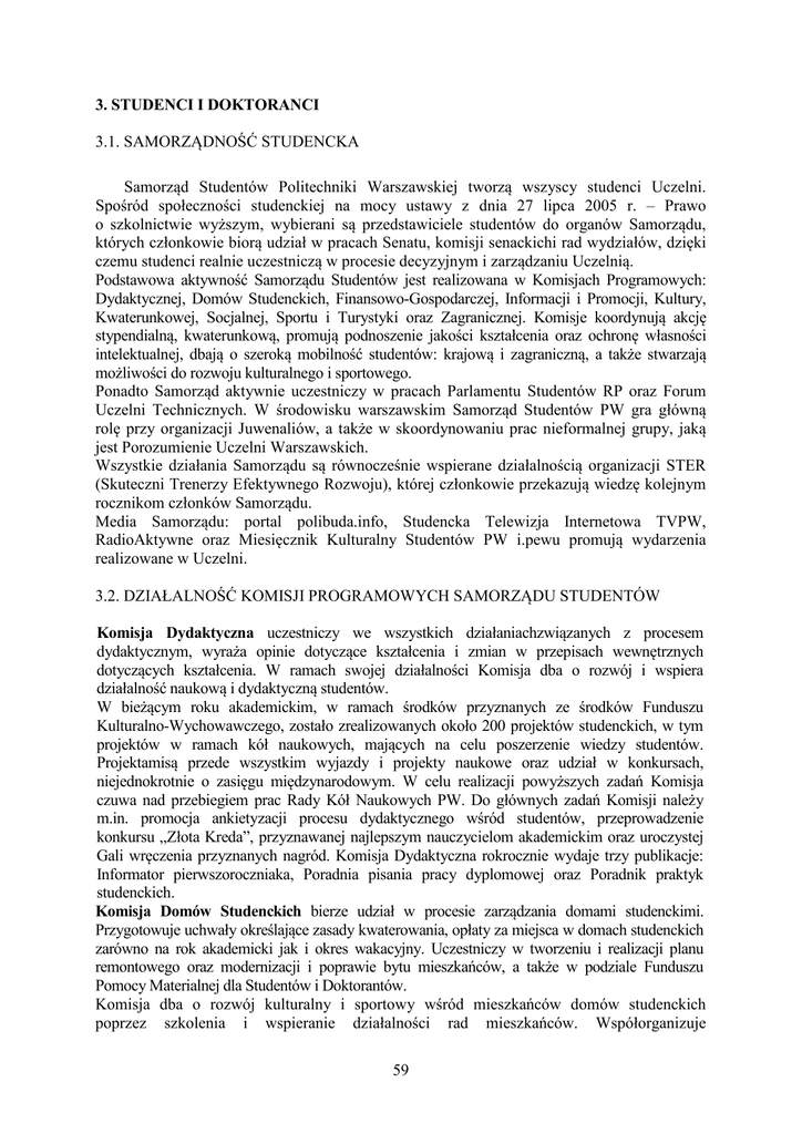 3. STUDENCI I DOKTORANCI 3.1. SAMORZĄDNOŚĆ STUDENCKA Samorząd Studentów Politechniki Warszawskiej tworzą wszyscy studenci Uczelni. Spośród społeczności studenckiej na mocy ustawy z dnia 27 lipca 2005 r. – Prawo o szkolnictwie wyższym, wybierani są przedstawiciele studentów do organów Samorządu, których członkowie biorą udział w pracach Senatu, komisji senackichi rad wydziałów, dzięki czemu studenci realnie uczestniczą w procesie decyzyjnym i zarządzaniu Uczelnią. Podstawowa aktywność Samorządu Studentów jest realizowana w Komisjach Programowych: Dydaktycznej, Domów Studenckich, Finansowo-Gospodarczej, Informacji i Promocji, Kultury, Kwaterunkowej, Socjalnej, Sportu i Turystyki oraz Zagranicznej. Komisje koordynują akcję stypendialną, kwaterunkową, promują podnoszenie jakości kształcenia oraz ochronę własności intelektualnej, dbają o szeroką mobilność studentów: krajową i zagraniczną, a także stwarzają możliwości do rozwoju kulturalnego i sportowego. Ponadto Samorząd aktywnie uczestniczy w pracach Parlamentu Studentów RP oraz Forum Uczelni Technicznych. W środowisku warszawskim Samorząd Studentów PW gra główną rolę przy organizacji Juwenaliów, a także w skoordynowaniu prac nieformalnej grupy, jaką jest Porozumienie Uczelni Warszawskich. Wszystkie działania Samorządu są równocześnie wspierane działalnością organizacji STER (Skuteczni Trenerzy Efektywnego Rozwoju), której członkowie przekazują wiedzę kolejnym rocznikom członków Samorządu. Media Samorządu: portal polibuda.info, Studencka Telewizja Internetowa TVPW, RadioAktywne oraz Miesięcznik Kulturalny Studentów PW i.pewu promują wydarzenia realizowane w Uczelni. 3.2. DZIAŁALNOŚĆ KOMISJI PROGRAMOWYCH SAMORZĄDU STUDENTÓW Komisja Dydaktyczna uczestniczy we wszystkich działaniachzwiązanych z procesem dydaktycznym, wyraża opinie dotyczące kształcenia i zmian w przepisach wewnętrznych dotyczących kształcenia. W ramach swojej działalności Komisja dba o rozwój i wspiera działalność naukową i dydaktyczną studentów. W bieżącym roku akademickim, w ramach środków przyznanych ze środków Funduszu Kulturalno-Wychowawczego, zostało zrealizowanych około 200 projektów studenckich, w tym projektów w ramach kół naukowych, mających na celu poszerzenie wiedzy studentów. Projektamisą przede wszystkim wyjazdy i projekty naukowe oraz udział w konkursach, niejednokrotnie o zasięgu międzynarodowym. W celu realizacji powyższych zadań Komisja czuwa nad przebiegiem prac Rady Kół Naukowych PW. Do głównych zadań Komisji należy m.in. promocja ankietyzacji procesu dydaktycznego wśród studentów, przeprowadzenie konkursu „Złota Kreda”, przyznawanej najlepszym nauczycielom akademickim oraz uroczystej Gali wręczenia przyznanych nagród. Komisja Dydaktyczna rokrocznie wydaje trzy publikacje: Informator pierwszoroczniaka, Poradnia pisania pracy dyplomowej oraz Poradnik praktyk studenckich. Komisja Domów Studenckich bierze udział w procesie zarządzania domami studenckimi. Przygotowuje uchwały określające zasady kwaterowania, opłaty za miejsca w domach studenckich zarówno na rok akademicki jak i okres wakacyjny. Uczestniczy w tworzeniu i realizacji planu remontowego oraz modernizacji i poprawie bytu mieszkańców, a także w podziale Funduszu Pomocy Materialnej dla Studentów i Doktorantów. Komisja dba o rozwój kulturalny i sportowy wśród mieszkańców domów studenckich poprzez szkolenia i wspieranie działalności rad mieszkańców. Współorganizuje 59 „Akademikalia” oraz współpracuje ze Strażą Akademicką by zwiększyć bezpieczeństwo na terenie domów studenckich. Dodatkowo Komisja wspiera działania mające na celu poprawę transferu sieci internetowej w domach studenckich oraz poprawę ich sytuacji finansowej. Komisja Finansowo-Gospodarcza jako główny cel swojego działania stawia stwarzanie jak najlepszych warunków do funkcjonowania jednostek Samorządu Studentów PW, kół naukowych oraz organizacji studenckich. Poprzez przedstawienie Parlamentowi Studentów PW podziału budżetu pomiędzy odpowiednie jednostki Samorządu oraz inne jednostki współpracujące z Samorządem umożliwia realizację projektów cyklicznych oraz nowych inicjatyw środowiska studenckiego. Do podstawowych działań Komisji należy m.in. sprawowanie nadzoru nad wydatkowaniem budżetu oraz wspieranie rozwoju zintegrowanego systemu rozliczeń i obiegu dokumentów e-Wniosek. Komisja w obecnej kadencji kontynuuje działania szkoleniowe w zakresie zamówień publicznych. Skorzystało z nich wielu studentów czynnie działających w strukturach samorządowych, a wiedza zdobyta pozwoliła na realizację trudnych do rozliczenia dużych projektów. Komisja Informacji i Promocji w swoich założeniach zajmie się wizerunkiem Samorządu Studentów we wszelkiego rodzaju kanałach informacyjnych, zaczynając od Internetu, przez media studenckie po zewnętrzne patronaty medialne. W kręgu jej zainteresowań jest także pozyskiwanie środków zewnętrznych, wprowadzanie w realia Samorządu nowych działaczy oraz kontakty z jednostkami Politechniki Warszawskiej odpowiedzialnymi za szeroko rozumianą informację i promocję. Komisja Kultury szerzy kulturę wśród studentów Politechniki Warszawskiej. W ramach akcji „Student w Teatrze” dofinansowywane są grupowe wyjścia do teatrów, opery, filharmonii, muzeum, na wystawy. Za pośrednictwem Portalu Kulturalnego Studentów Politechniki Warszawskiej - Teatrowo – współpracuje z teatrami i kinami warszawskimi negocjując specjalne zniżki oraz darmowe bilety dla naszych studentów. Komisja współorganizuje również cykl koncertów muzyki klasycznej Wielka Muzyka w Małej Auli. Komisja wspiera integrację oraz rozrywkę studentów dofinansowując koncerty, pikniki wydziałowe, otrzęsiny studentów I roku, bale połowinkowe, bale dyplomowe, imprezy integracyjne, wystawy fotografii itp. W porozu