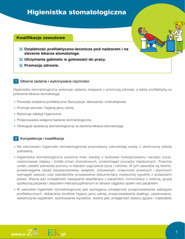 Higienistka stomatologiczna Kwalifikacje zawodowe Działalność profilaktyczno-lecznicza pod nadzorem i na zlecenie lekarza stomatologa. Utrzymanie gabinetu w gotowości do pracy. Promocja zdrowia. 1 Główne zadania i wykonywane czynności Higienistka stomatologiczna wykonuje zadania związane z promocją zdrowia, a także profilaktyką na polecenie lekarza stomatologa. Prowadzi działania profilaktyczne (fluoryzacje, lakowanie) i instruktażowe. Promuje zdrowie i higienę jamy ustnej. Wykonuje zabiegi higieniczne. Przeprowadza wstępne badanie stomatologiczne. Obsługuje aparaturę stomatologiczną na zlecenia lekarza stomatologa. 2 Kompetencje i kwalifikacje Na stanowisko higienistki stomatologicznej pracodawcy zatrudniają osoby z ukończoną szkołą policealną. Higienistka stomatologiczna powinna mieć wiedzę o budowiei funkcjonowaniu narządu żucia, rozpoznawać objawy i źródła zmian chorobowych, przestrzegać procedur medycznych. Powinna umieć udzielić pierwszej pomocy w stanach zagrożenia życia i zdrowia. W tym zawodzie są istotne: przestrzeganie zasad bezpieczeństwa, aseptyki, antyseptyki, znajomość prawnych i etycznych wymagań zawodu oraz standardów prowadzenia dokumentacji medycznej zgodnie z przepisami prawa. Ważna jest umiejętność nawiązania współpracy z pacjentem, komunikacji z rodziną, grupą społeczną pacjenta i zespołem interdyscyplinarnym w ramach ciągłości opieki nad pacjentem. W zawodzie higienistki stomatologicznej jest wymagana umiejętność przeprowadzania zabiegów profilaktycznych, dobierania środków higieny jamy ustnej, przeprowadzania skalingu, piaskowania, wykańczania wypełnień, wykonywania wycisków. Istotna jest umiejętność doboru języka i materiałów 1 dydaktycznych do działań profilaktycznych adekwatnie do odbiorców. Nieodzowna jest również wiedza i umiejętność posługiwania się aparaturą stomatologiczną, znajomość zasad jej zastosowania, doboru oraz przygotowania do użycia i konserwacji. W związku z możliwością pracy w środowisku szkolnym higienistka stomatologiczna powinna wykazywać predyspozycje pedagogiczne i zdolności organizacyjne. Na tym stanowisku są istotne: umiejętność koncentracji, podzielność uwagi, odpowiedzialność i precyzja, komunikatywność i umiejętność dzielenia się wiedzą. Praca w gabinecie stomatologicznym wymaga również zdolności manualnych. 3 Środowisko i charakter pracy Praca w tym zawodzie może być realizowana indywidualnie lub przy współpracy lekarza stomatologa. Higienistka stomatologiczna najczęściej pracuje w pozycji stojącej, w pomieszczeniach zamkniętych, przy świetle naturalnym, ale także sztucznym. Może być narażona na wdychanie oparów środków dezynfekujących. Zagrożeniem jest ekspozycja na choroby zakaźne, materiały skażone i skaleczenia. W zależności od placówki (gabinetu stomatologicznego) praca może być wykonywana w systemie jednolub dwuzmianowym. Praca wymaga ścisłej współpracy z lekarzem stomatologiem i gotowości do wykonywania poleceń. W tym zawodzie może występować konieczność aktualizowania wiedzy o stosowanych metodach profilaktyki chorób jamy ustnej, lekach i narzędziach. 2
