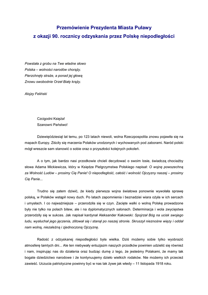 Przemówienie Prezydenta Miasta Puławy z okazji 90. rocznicy odzyskania przez Polskę niepodległości Powstała z grobu na Twe władne słowo Polska – wolności narodów chorąŜy. Pierzchnęły straŜe, a ponad jej głową Znowu swobodnie Orzeł Biały krąŜy. Alojzy Feliński Czcigodni KsięŜa! Szanowni Państwo! Dziewięćdziesiąt lat temu, po 123 latach niewoli, wolna Rzeczpospolita znowu pojawiła się na mapach Europy. Ziściły się marzenia Polaków urodzonych i wychowanych pod zaborami. Naród polski mógł wreszcie sam stanowić o sobie oraz o przyszłości kolejnych pokoleń. A o tym, jak bardzo nasi przodkowie chcieli decydować o swoim losie, świadczą chociaŜby słowa Adama Mickiewicza, który w Księdze Pielgrzymstwa Polskiego napisał: O wojnę powszechną za Wolność Ludów – prosimy Cię Panie! O niepodległość, całość i wolność Ojczyzny naszej – prosimy Cię Panie... Trudno się zatem dziwić, Ŝe kiedy pierwsza wojna światowa ponownie wywołała sprawę polską, w Polaków wstąpił nowy duch. Po latach zapomnienia i beznadziei wiara oŜyła w ich sercach i umysłach. I co najwaŜniejsze – przerodziła się w czyn. Zacięte walki o wolną Polskę prowadzone były nie tylko na polach bitew, ale i na dyplomatycznych salonach. Determinacja i wola zwycięstwa przerodziły się w sukces. Jak napisał kardynał Aleksander Kakowski: Spojrzał Bóg na ucisk swojego ludu, wysłuchał jego jęczenia, zlitował się i stanął po naszej stronie. Skruszył nieznośne więzy i oddał nam wolną, niezaleŜną i zjednoczoną Ojczyznę. Radość z odzyskanej niepodległości była wielka. Dziś moŜemy sobie tylko wyobrazić atmosferę tamtych dni... Ale ten niebywały entuzjazm naszych przodków powinien udzielić się równieŜ i nam, inspirując nas do działania oraz budząc dumę z tego, Ŝe jesteśmy Polakami, Ŝe mamy tak bogate dziedzictwo narodowe i Ŝe kontynuujemy dzieło wielkich rodaków. Nie moŜemy ich przecieŜ zawieść. Uczucia patriotyczne powinny być w nas tak Ŝywe jak wtedy – 11 listopada 1918 roku. W tym szczególnym dniu rodzi się refleksja. Czy potrafimy dobrze wykorzystać wolność wywalczoną przez poprzednie pokolenia? Czy umiemy się z niej cieszyć? Czy pielęgnujemy ją naleŜycie? Dziś Ŝyjemy w wolnej Polsce, w zjednoczonej Europie. KaŜdy z nas moŜe swobodnie wyraŜać swoje poglądy. Mamy moŜliwość decydowania o sobie – o tym gdzie i jak chcemy Ŝyć. Nasz kraj się rozwija – mimo przejściowych kryzysów, których przecieŜ nie sposób uniknąć. Wiemy, Ŝe nikomu nie wolno nic narzucać, warto jednak docierać do świadomości ludzi. A w sprawach najwaŜniejszych, związanych z bytem narodu i z prawidłowym funkcjonowaniem państwa oraz naszej Małej Ojczyzny, niezaleŜnie od róŜnic politycznych, które są przecieŜ rzeczą normalną, powinniśmy umieć się porozumieć. Nie wolno nam zapominać o tradycji i dobrych wzorach. Wielkie znaczenie ma teŜ wychowanie młodzieŜy w duchu patriotyzmu. Ponadto przy kaŜdej okazji powinniśmy podkreślać dumę z tego, Ŝe jesteśmy Polakami. Do tego nas zobowiązuje nasza przeszłość naznaczona krwią i ofiarami... Dzisiejszy świat nie jest wolny od niepokojów. Słysząc o konfliktach zbrojnych czy zamachach terrorystycznych często myślimy, Ŝe nas to nie dotyczy. Tymczasem, obserwując sytuację na arenie międzynarodowej, powinniśmy zdać sobie sprawę z tego, Ŝe wojna w kaŜdej chwili moŜe stać się naszym problemem. I czy wówczas duch narodowy będzie w nas wystarczająco silny? Czy potrafimy zjednoczyć się i powiedzieć agresorowi stanowcze: „Nie”. Szanowni Puławianie! Zróbmy wszystko, aby 11 listopada był dniem radosnym i wyjątkowym dla kaŜdego Polaka. Jest to przecieŜ dzień ponownych narodzin naszej ojczyzny. Celebrujmy go, by stał się prawdziwym świętem, a motywem przewodnim uroczystości niech będzie porozumienie – ponad wszelkimi podziałami i w imię dobra narodu. Manifestujmy swój patriotyzm. Nie wstydźmy się naszych uczuć do Polski. Uczmy nasze dzieci miłości do ojczyzny. Wierzę, Ŝe dzięki temu będziemy państwem silnym – takim, z którym będą się liczyć inne narody. A składając dziś hołd naszym przodkom za najcenniejszy dar, jakim jest wolność, pamiętajmy, Ŝe powinnością nas wszystkich jest zachowanie jej dla pomyślności obecnych i przyszłych pokoleń.