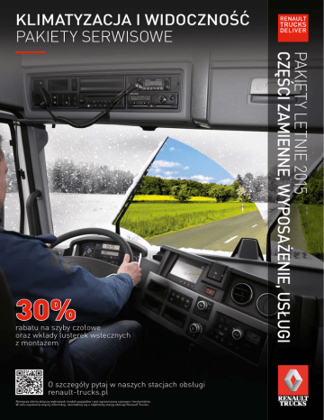 KLIMATYZACJA I WIDOCZNOŚĆ PAKIETY SERWISOWE rabatu na szyby czołowe oraz wkłady lusterek wstecznych z montażem O szczegóły pytaj w naszych stacjach obsługi renault-trucks.pl Niniejsza oferta dotyczy wybranych modeli pojazdów i jest ograniczona czasowo i terytorialnie. W celu uzyskania więcej informacji, skontaktuj się z najbliższą stacją obsługi Renault Trucks. PAKIETY LETNIE 2015 CZĘŚCI ZAMIENNE, WYPOSAŻENIE, USŁUGI 30% PAKIETY LETNIE 2015 Skontaktuj się z Twoim autoryzowanym serwisem Renault Trucks Klimatyzacja PRZEGLĄD UKŁADU KLIMATYZACJI: Wypompowanie czynnika chłodniczego Wytworzenie próżni w celu osuszenia układu Test szczelności Napełnienie układu czynnikiem chłodniczym 189 PLN netto OCZYSZCZENIE UKŁADU KLIMATYZACJI: 99 PLN Sprawdzenie, czyszczenie i odkażenie układu klimatyzacji Część wraz z wymianą Filtr kabinowy Filtr kabinowy Osuszacz klimatyzacji Osuszacz klimatyzacji Skraplacz klimatyzacji Opornik dmuchawy Opornik dmuchawy Opornik dmuchawy Elektrozawór nagrzewnicy Wentylator dmuchawy Wentylator dmuchawy Sprężarka klimatyzacji netto Cena netto* 69 PLN 159 PLN 529 PLN 739 PLN 2009 PLN 239 PLN 259 PLN 389 PLN 1399 PLN 969 PLN 1179 PLN 1989 PLN Model PREMIUM DXI; MIDLUM DXI MAGNUM E-TECH, DXI PREMIUM DXI; MIDLUM DXI MAGNUM DXI PREMIUM DXI; MAGNUM DXI MAGNUM E-TECH, DXI MAGNUM DXI PREMIUM DCI, DXI; MIDLUM DCI, DXI MAGNUM E-TECH, DXI PREMIUM DCI, DXI; MIDLUM DCI, DXI MAGNUM DXI PREMIUM DXI; MAGNUM DXI KLIMATYZACJA POSTOJOWA WAECO COOLAIR RT880 wraz z montażem Dla Renault C,K oraz T (wersje bez lub z deflektorem dachowym 7484505412, oferta nie obejmuje modelu Renault T High) 4 979 PLN netto PAKIETY SERWISOWE: OSZCZĘDNOŚĆ PIENIĘDZY I WZROST RENTOWNOŚCI Widoczność Część wraz z wymianą Komplet piór wycieraczek Komplet piór wycieraczek Cena netto 109 PLN 99 PLN Model GAMA T, MAGNUM DXI PREMIUM DCI, DXI; KERAX DXI, DCI; MASCOTT Bogata oferta wyposażenia dodatkowego CB Radio President Johnny III ASC w zestawie z anteną President Florida EXP Odkurzacz Waeco Ekspres do kawy 1 filiżanka Wskaźniki odkręcania śrub 475 5 PLN 215 5 PLN 69 9 PLN od 2,03 PLN/szt. N/szt. Promocja trwa od 1 maja do 31 sierpnia 2015 r. Niniejsza oferta jest ograniczona czasowo i terytorialnie. W celu uzyskania więcej informacji skontaktuj się z najbliższą autoryzowaną stacją obsługi Renault Trucks. Przedstawione ceny są cenami netto i dotyczą wybranych modeli Renault Trucks. *Cena uzależniona od specyfikacji technicznej pojazdu 30 % RABATU NA SZYBY CZOŁOWE ORAZ WKŁADY LUSTEREK WSTECZNYCH Z MONTAŻEM