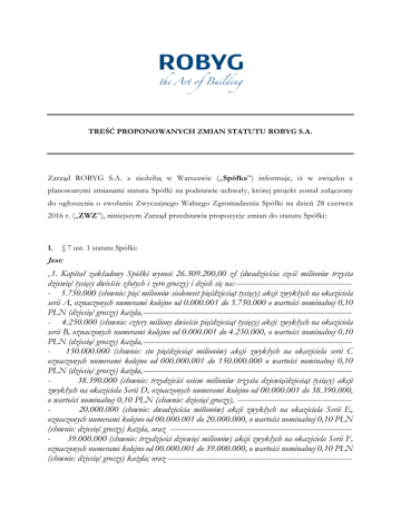 TREŚĆ PROPONOWANYCH ZMIAN STATUTU ROBYG S.A. Zarząd ROBYG S.A. z siedzibą w Warszawie („Spółka”) informuje, iż w związku z planowanymi zmianami statutu Spółki na podstawie uchwały, której projekt został załączony do ogłoszenia o zwołaniu Zwyczajnego Walnego Zgromadzenia Spółki na dzień 28 czerwca 2016 r. („ZWZ”), niniejszym Zarząd przedstawia propozycje zmian do statutu Spółki: 1. § 7 ust. 1 statutu Spółki: Jest: „1. Kapitał zakładowy Spółki wynosi 26.309.200,00 zł (dwadzieścia sześć milionów trzysta dziewięć tysięcy dwieście złotych i zero groszy) i dzieli się na: ------------------------------------------------ 5.750.000 (słownie: pięć milionów siedemset pięćdziesiąt tysięcy) akcji zwykłych na okaziciela serii A, oznaczonych numerami kolejno od 0.000.001 do 5.750.000 o wartości nominalnej 0,10 PLN (dziesięć groszy) każda, -------------------------------------------------------------------------------------- 4.250.000 (słownie: cztery miliony dwieście pięćdziesiąt tysięcy) akcji zwykłych na okaziciela serii B, oznaczonych numerami kolejno od 0.000.001 do 4.250.000, o wartości nominalnej 0,10 PLN (dziesięć groszy) każda, -------------------------------------------------------------------------------------150.000.000 (słownie: sto pięćdziesiąt milionów) akcji zwykłych na okaziciela serii C oznaczonych numerami kolejno od 000.000.001 do 150.000.000 o wartości nominalnej 0,10 PLN (dziesięć groszy) każda, -------------------------------------------------------------------------------------38.390.000 (słownie: trzydzieści osiem milionów trzysta dziewięćdziesiąt tysięcy) akcji zwykłych na okaziciela Serii D, oznaczonych numerami kolejno od 00.000.001 do 38.390.000, o wartości nominalnej 0,10 PLN (słownie: dziesięć groszy), ----------------------------------------------20.000.000 (słownie: dwadzieścia milionów) akcji zwykłych na okaziciela Serii E, oznaczonych numerami kolejno od 00.000.001 do 20.000.000, o wartości nominalnej 0,10 PLN (słownie: dziesięć groszy) każda, oraz --------------------------------------------------------------------------39.000.000 (słownie: trzydzieści dziewięć milionów) akcji zwykłych na okaziciela Serii F, oznaczonych numerami kolejno od 00.000.001 do 39.000.000, o wartości nominalnej 0,10 PLN (słownie: dziesięć groszy) każda; oraz ---------------------------------------------------------------------------- 5.702.000 (pięć milionów siedemset dwa tysiące) akcji zwykłych na okaziciela Serii G, oznaczonych numerami kolejno od 00.000.001 do 5.702.000, o wartości nominalnej 0,10 zł (dziesięć groszy) każda.” Proponowana zmiana: „1. Kapitał zakładowy Spółki wynosi nie więcej niż 28.940.119,90 zł (słownie: dwadzieścia osiem milionów dziewięćset czterdzieści tysięcy sto dziewiętnaście złotych i dziewięćdziesiąt groszy) i dzieli się na: - 5.750.000 (słownie: pięć milionów siedemset pięćdziesiąt tysięcy) akcji zwykłych na okaziciela serii A, oznaczonych numerami kolejno od 0.000.001 do 5.750.000 o wartości nominalnej 0,10 PLN (dziesięć groszy) każda, - 4.250.000 (słownie: cztery miliony dwieście pięćdziesiąt tysięcy) akcji zwykłych na okaziciela serii B, oznaczonych numerami kolejno od 0.000.001 do 4.250.000, o wartości nominalnej 0,10 PLN (dziesięć groszy) każda, - 150.000.000 (słownie: sto pięćdziesiąt milionów) akcji zwykłych na okaziciela serii C oznaczonych numerami kolejno od 000.000.001 do 150.000.000 o wartości nominalnej 0,10 PLN (dziesięć groszy) każda, - 38.390.000 (słownie: trzydzieści osiem milionów trzysta dziewięćdziesiąt tysięcy) akcji zwykłych na okaziciela Serii D, oznaczonych numerami kolejno od 00.000.001 do 38.390.000, o wartości nominalnej 0,10 PLN (słownie: dziesięć groszy), - 20.000.000 (słownie: dwadzieścia milionów) akcji zwykłych na okaziciela Serii E, oznaczonych numerami kolejno od 00.000.001 do 20.000.000, o wartości nominalnej 0,10 PLN (słownie: dziesięć groszy) każda, - 39.000.000 (słownie: trzydzieści dziewięć milionów) akcji zwykłych na okaziciela Serii F, oznaczonych numerami kolejno od 00.000.001 do 39.000.000, o wartości nominalnej 0,10 PLN (słownie: dziesięć groszy) każda; - 5.702.000 (pięć milionów siedemset dwa tysiące) akcji zwykłych na okaziciela Serii G, oznaczonych numerami kolejno od 00.000.001 do 5.702.000, o wartości nominalnej 0,10 zł (dziesięć groszy) każda; oraz - nie mniej niż 1 (jedną) oraz nie więcej niż 26.309.199 (dwadzieścia sześć milionów trzysta dziewięć tysięcy sto dziewięćdziesiąt dziewięć) akcji zwykłych na okaziciela Serii H, o wartości nominalnej 0,10 zł (dziesięć groszy) każda.” Zarząd informuje, że ostateczną treść § 7 ust. 1 Statutu Spółki oraz ostateczną wysokość kapitału zakładowego objętego w granicach § 7 ust. 1 powyżej, określi Zarząd na podstawie art. 310 w zw. z art. 431 § 7 Kodeksu spółek handlowych. Ponadto, Zarząd informuje, iż projekt jednolitego tekstu statutu został przedstawiony w projektach uchwał na ZWZ. Podpisy osób zarządzających: Zbigniew Wojciech Okoński – Prezes Zarządu ROBYG S.A. Artur Ceglarz – Wiceprezes Zarządu ROBYG S.A.