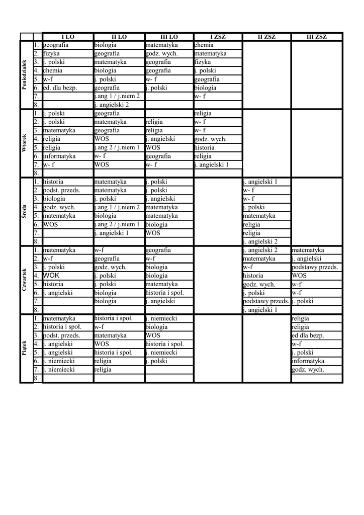 Piątek Czwartek Środa Wtorek Poniedziałek I LO 1. 2. 3. 4. 5. 6. 7. 8. 1. 2. 3. 4. 5. 6. 7. 8. 1. 2. 3. 4. 5. 6. 7. 8. 1. 2. 3. 4. 5. 6. 7. 8. 1. 2. 3. 4. 5. 6. 7. 8. III LO I ZSZ biologia geografia matematyka biologia j. polski geografia j.ang 1 / j.niem 2 j. angielski 2 geografia matematyka geografia WOS j.ang 2 / j.niem 1 w- f WOS matematyka godz. wych. geografia geografia w- f j. polski chemia matematyka fizyka j. polski geografia biologia w- f historia podst. przeds. biologia godz. wych. matematyka WOS matematyka matematyka j. polski j.ang 1 / j.niem 2 biologia j.ang 2 / j.niem 1 j. angielski 1 j. polski j. polski j. angielski matematyka matematyka biologia WOS matematyka w-f j. polski WOK historia j. angielski w-f geografia godz. wych. j. polski j. polski biologia biologia geografia w-f biologia biologia matematyka historia i społ. j. angielski matematyka historia i społ. podst. przeds. j. angielski j. angielski j. niemiecki j. niemiecki historia i społ. w-f matematyka WOS historia i społ. religia religia j. niemiecki biologia WOS historia i społ. j. niemiecki j. polski geografia fizyka j. polski chemia w-f ed. dla bezp. j. polski j. polski matematyka religia religia informatyka w- f II LO religia religia j. angielski WOS geografia w- f II ZSZ III ZSZ religia w- f w- f godz. wych. historia religia j. angielski 1 j. angielski 1 w- f w- f j. polski matematyka religia religia j. angielski 2 j. angielski 2 matematyka w-f historia godz. wych. j. polski podstawy przeds. j. angielski 1 matematyka j. angielski podstawy przeds. WOS w-f w-f j. polski religia religia ed dla bezp. w-f j. polski informatyka godz. wych.