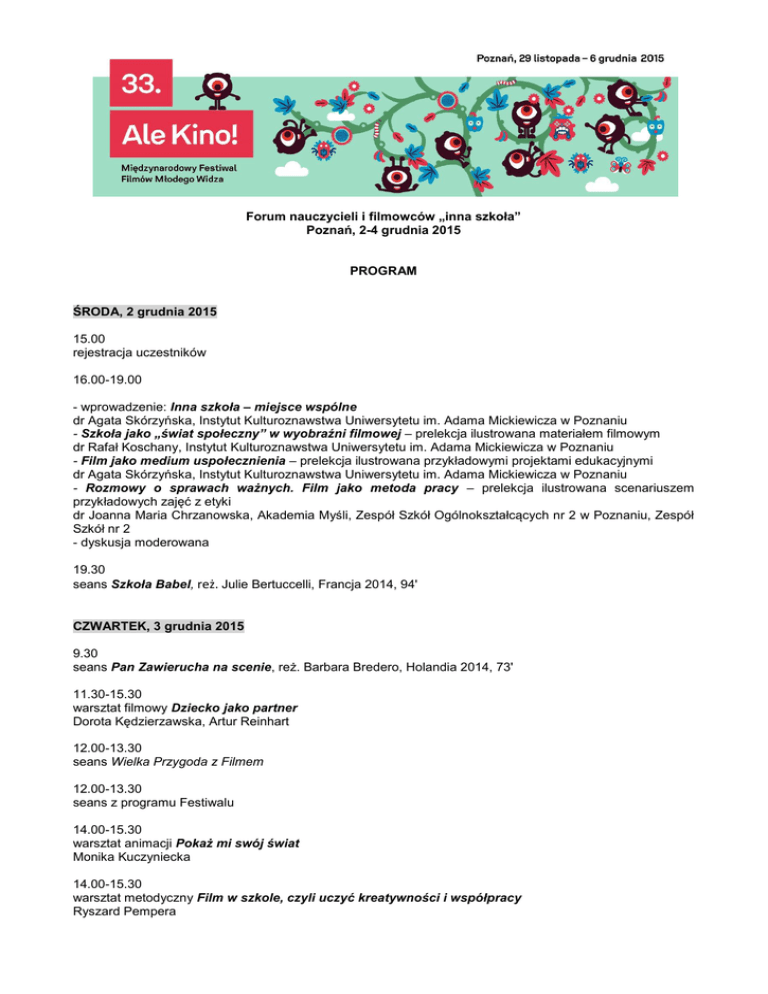 Forum nauczycieli i filmowców „inna szkoła” Poznań, 2-4 grudnia 2015 PROGRAM ŚRODA, 2 grudnia 2015 15.00 rejestracja uczestników 16.00-19.00 - wprowadzenie: Inna szkoła – miejsce wspólne dr Agata Skórzyńska, Instytut Kulturoznawstwa Uniwersytetu im. Adama Mickiewicza w Poznaniu - Szkoła jako „świat społeczny” w wyobraźni filmowej – prelekcja ilustrowana materiałem filmowym dr Rafał Koschany, Instytut Kulturoznawstwa Uniwersytetu im. Adama Mickiewicza w Poznaniu - Film jako medium uspołecznienia – prelekcja ilustrowana przykładowymi projektami edukacyjnymi dr Agata Skórzyńska, Instytut Kulturoznawstwa Uniwersytetu im. Adama Mickiewicza w Poznaniu - Rozmowy o sprawach ważnych. Film jako metoda pracy – prelekcja ilustrowana scenariuszem przykładowych zajęć z etyki dr Joanna Maria Chrzanowska, Akademia Myśli, Zespół Szkół Ogólnokształcących nr 2 w Poznaniu, Zespół Szkół nr 2 - dyskusja moderowana 19.30 seans Szkoła Babel, reż. Julie Bertuccelli, Francja 2014, 94' CZWARTEK, 3 grudnia 2015 9.30 seans Pan Zawierucha na scenie, reż. Barbara Bredero, Holandia 2014, 73' 11.30-15.30 warsztat filmowy Dziecko jako partner Dorota Kędzierzawska, Artur Reinhart 12.00-13.30 seans Wielka Przygoda z Filmem 12.00-13.30 seans z programu Festiwalu 14.00-15.30 warsztat animacji Pokaż mi swój świat Monika Kuczyniecka 14.00-15.30 warsztat metodyczny Film w szkole, czyli uczyć kreatywności i współpracy Ryszard Pempera 15.30-17.00 przerwa 17.00-19.00 prezentacje projektów edukacji filmowej realizowanych w szkołach i instytucjach kultury: - Różni-równi – zajęcia integracyjne z zakresu sztuk wizualnych (animacja, film, fotografia) dla dzieci i młodzieży Elżbieta Omelan, Edyta Kaszyca, Juliusz Baranowski, Pałac Młodzieży w Katowicach - Otwieram oczy i mówię TAK. Tak dla filmu, tak dla siebie, tak wobec życia – kilka słów refleksji o realizacji projektu Wielka Przygoda z Filmem Elżbieta Olszak, Ośrodek Szkolno-Wychowawczy dla Dzieci i Młodzieży Niepełnosprawnej w Poznaniu Marian Suchanecki, Centrum Sztuki Dziecka w Poznaniu Mikołaj Haremski, reżyser - Film i biblioteka Karola Agnieszka Glasner, Gimnazjum nr 7 w Koninie Agnieszka Pogorzelska, Publiczna Biblioteka Pedagogiczna w Koninie - Moja – nasza przestrzeń (film jako medium uspołeczniające) Magdalena Rudnicka, Zespół Szkół w Olsztynku prezentacja propozycji edukacyjnych dostępnych na stronie www.edukacjafilmowa.pl: - Elementarz młodego kinomana - Mój pierwszy film dr Jadwiga Mostowska, filmoznawczyni 19.30 seans z programu Festiwalu PIĄTEK, 4 grudnia 2015 9.30 seans Lekcje Marzeń, reż. Sebastian Grobler, Niemcy 2011, 113' 11.30-15.30 warsztat filmowy Dziecko jako partner Dorota Kędzierzawska, Artur Reinhart 12.00-13.30 seans z programu Festiwalu 14.00-15.30 warsztat animacji Pokaż mi swój świat Monika Kuczyniecka 14.00-15.30 warsztat metodyczny Film w szkole, czyli uczyć kreatywności i współpracy Ryszard Pempera 15.30-17.00 przerwa 17.00-19.00 - Filmy o szkole w zwierciadle historii filmu dr hab. Jacek Nowakowski, Instytutu Filologii Polskiej Uniwersytetu im. Adama Mickiewicza w Poznaniu - omówienie filmów: „Szkoła Babel”, „Pan Zawierucha na scenie”, „Lekcje marzeń” ilustrujących temat „inna szkoła” Adam Domalewski, Marcin Pigulak, Agnieszka Powierska – doktoranci w Katedrze Filmu, Telewizji i Nowych Mediów Uniwersytetu im. Adama Mickiewicza w Poznaniu 19.30 specjalny pokaz filmów Paula Driessena (jurora i laureata Platynowych Koziołków) i spotkanie z reżyserem