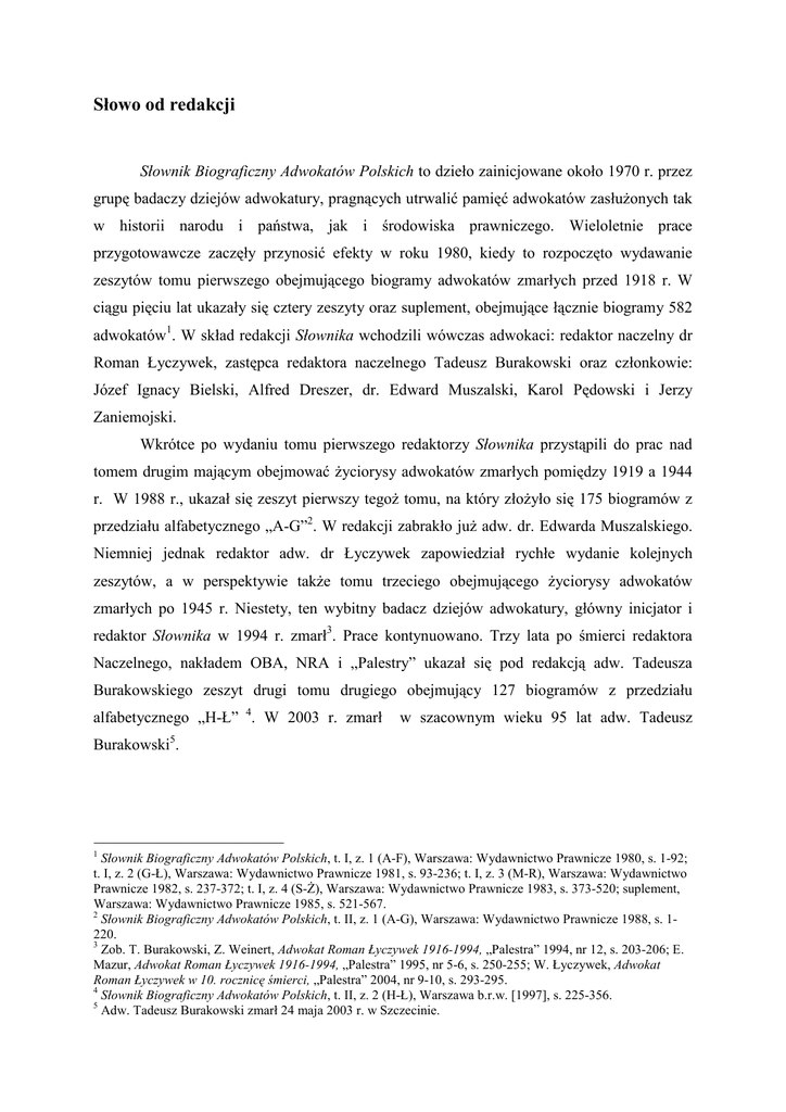 Słowo od redakcji Słownik Biograficzny Adwokatów Polskich to dzieło zainicjowane około 1970 r. przez grupę badaczy dziejów adwokatury, pragnących utrwalić pamięć adwokatów zasłuŜonych tak w historii narodu i państwa, jak i środowiska prawniczego. Wieloletnie prace przygotowawcze zaczęły przynosić efekty w roku 1980, kiedy to rozpoczęto wydawanie zeszytów tomu pierwszego obejmującego biogramy adwokatów zmarłych przed 1918 r. W ciągu pięciu lat ukazały się cztery zeszyty oraz suplement, obejmujące łącznie biogramy 582 adwokatów1. W skład redakcji Słownika wchodzili wówczas adwokaci: redaktor naczelny dr Roman Łyczywek, zastępca redaktora naczelnego Tadeusz Burakowski oraz członkowie: Józef Ignacy Bielski, Alfred Dreszer, dr. Edward Muszalski, Karol Pędowski i Jerzy Zaniemojski. Wkrótce po wydaniu tomu pierwszego redaktorzy Słownika przystąpili do prac nad tomem drugim mającym obejmować Ŝyciorysy adwokatów zmarłych pomiędzy 1919 a 1944 r. W 1988 r., ukazał się zeszyt pierwszy tegoŜ tomu, na który złoŜyło się 175 biogramów z przedziału alfabetycznego „A-G”2. W redakcji zabrakło juŜ adw. dr. Edwarda Muszalskiego. Niemniej jednak redaktor adw. dr Łyczywek zapowiedział rychłe wydanie kolejnych zeszytów, a w perspektywie takŜe tomu trzeciego obejmującego Ŝyciorysy adwokatów zmarłych po 1945 r. Niestety, ten wybitny badacz dziejów adwokatury, główny inicjator i redaktor Słownika w 1994 r. zmarł3. Prace kontynuowano. Trzy lata po śmierci redaktora Naczelnego, nakładem OBA, NRA i „Palestry” ukazał się pod redakcją adw. Tadeusza Burakowskiego zeszyt drugi tomu drugiego obejmujący 127 biogramów z przedziału alfabetycznego „H-Ł” 4. W 2003 r. zmarł w szacownym wieku 95 lat adw. Tadeusz Burakowski5. 1 Słownik Biograficzny Adwokatów Polskich, t. I, z. 1 (A-F), Warszawa: Wydawnictwo Prawnicze 1980, s. 1-92; t. I, z. 2 (G-Ł), Warszawa: Wydawnictwo Prawnicze 1981, s. 93-236; t. I, z. 3 (M-R), Warszawa: Wydawnictwo Prawnicze 1982, s. 237-372; t. I, z. 4 (S-ś), Warszawa: Wydawnictwo Prawnicze 1983, s. 373-520; suplement, Warszawa: Wydawnictwo Prawnicze 1985, s. 521-567. 2 Słownik Biograficzny Adwokatów Polskich, t. II, z. 1 (A-G), Warszawa: Wydawnictwo Prawnicze 1988, s. 1220. 3 Zob. T. Burakowski, Z. Weinert, Adwokat Roman Łyczywek 1916-1994, „Palestra” 1994, nr 12, s. 203-206; E. Mazur, Adwokat Roman Łyczywek 1916-1994, „Palestra” 1995, nr 5-6, s. 250-255; W. Łyczywek, Adwokat Roman Łyczywek w 10. rocznicę śmierci, „Palestra” 2004, nr 9-10, s. 293-295. 4 Słownik Biograficzny Adwokatów Polskich, t. II, z. 2 (H-Ł), Warszawa b.r.w. [1997], s. 225-356. 5 Adw. Tadeusz Burakowski zmarł 24 maja 2003 r. w Szczecinie. Wysiłkiem pierwszego składu redakcji Słownika opublikowanych zostało siedem zeszytów (pięć zeszytów I tomu i dwa II tomu), zawierających łącznie Ŝyciorysy 884 adwokatów. Po śmierci redaktorów prace nad Słownikiem podjął Ośrodek Badawczy Adwokatury im. adw. Witolda Bayera (dalej: OBA) kierowany przez adw. Andrzeja Michałowskiego, a następnie adw. Dariusza Wojnara. W 2004 r. powierzono opracowanie dalszej części Słownika dr. Leszkowi Kani przekazując mu szczątkowe materiały6, w tym niektóre biogramy autorstwa członków pierwszej redakcji Słownika, adwokatów Romana Łyczywka7, Edwarda Muszalskiego i Tadeusza Burakowskiego. Po opracowaniu i uzupełnieniu materiału, latem 2006 r., dr Leszek Kania przekazał zeszyt 3-4 tomu drugiego Słownika obejmujący 157 biogramów redakcji „Palestry”. Z inicjatywy redaktora naczelnego adw. Stanisława Mikke przeprowadzono wówczas konsultacje z grupą adwokatów w tym m.in. z wybitnym badaczem dziejów adwokatury adw. dr. Zdzisławem Krzemińskim. Słownik został teŜ zrecenzowany przez prof. dr hab. Bogusława Pylaka i dr hab. Dorotę Malec. Uwzględniając uwagi recenzentów, pod kierunkiem dr. Adama Redzika we współpracy z redaktorem zeszytu dr. Leszkiem Kanią oraz dr. Markiem Gałęzowskim uzupełniono zeszyt ponad osiemdziesięcioma biogramami. Ostatecznie opracowanie obejmuje 243 biogramy. W trakcie prac nad niniejszym zeszytem wprowadzono odstępstwo od zasady wyznaczonej przez twórców Słownika, Ŝe w tomie drugim znajdować się będą wyłącznie biogramy osób zmarłych w okresie 1919-1944. Zwrócono uwagę na fakt, Ŝe tom pierwszy Słownika oraz zeszyt pierwszy tomu drugiego powstawały jeszcze w PRL. Trudno więc było zamieścić w nim biogramy adwokatów niewygodnych politycznie czy teŜ zamordowanych na Wschodzie. Po licznych konsultacjach postanowiono włączyć do Słownika Ŝyciorysy tych, których aktywność polityczna i zawodowa przebiegała w czasie zaborów, w II RP i podczas II wojny światowej, ale zmarli, często dyskryminowani i w zapomnieniu, po 1944 r. (np. A. Mogilnicki, L. Supiński), a w Polsce Ludowej do zawodu nie wrócili (np. E. S. Rappaport, K. Przybyłowski) lub teŜ pozostali na Zachodzie (np. H. Vogelfänger, A. Nowak-Przygodzki). Adwokat dr Roman Łyczywek we wstępie do pierwszego zeszytu Słownika napisał: „prace badawcze nad historią adwokatury powinni wykonać przede wszystkim sami adwokaci”. Podkreślał jednocześnie, Ŝe „brak im zapewne z reguły wysokich kwalifikacji naukowych w zakresie historii, ale znają za to ducha adwokatury i nikt tak jak oni nie jest 6 Niestety część biogramów przygotowanych jeszcze przez członków pierwszej redakcji Słownika zaginęło. Roman Łyczywek opracowania swojego autorstwa podpisywał teŜ pseudonimami, m.in. „Jerzy Saski” i „Jerzy Grodzki”. 7 powołany do tego, by wśród licznych danych i przekazów historycznych i bibliograficznych uchwycić i uwydatnić to, co specyficznie adwokacki charakter i co szczególnie zasługuje na pamięć wśród adwokatów”. Doceniając zdanie Twórcy Słownika w niniejszym opracowaniu znacząca część opracowań jest dziełem adwokatów, ale pewną liczbę biogr
