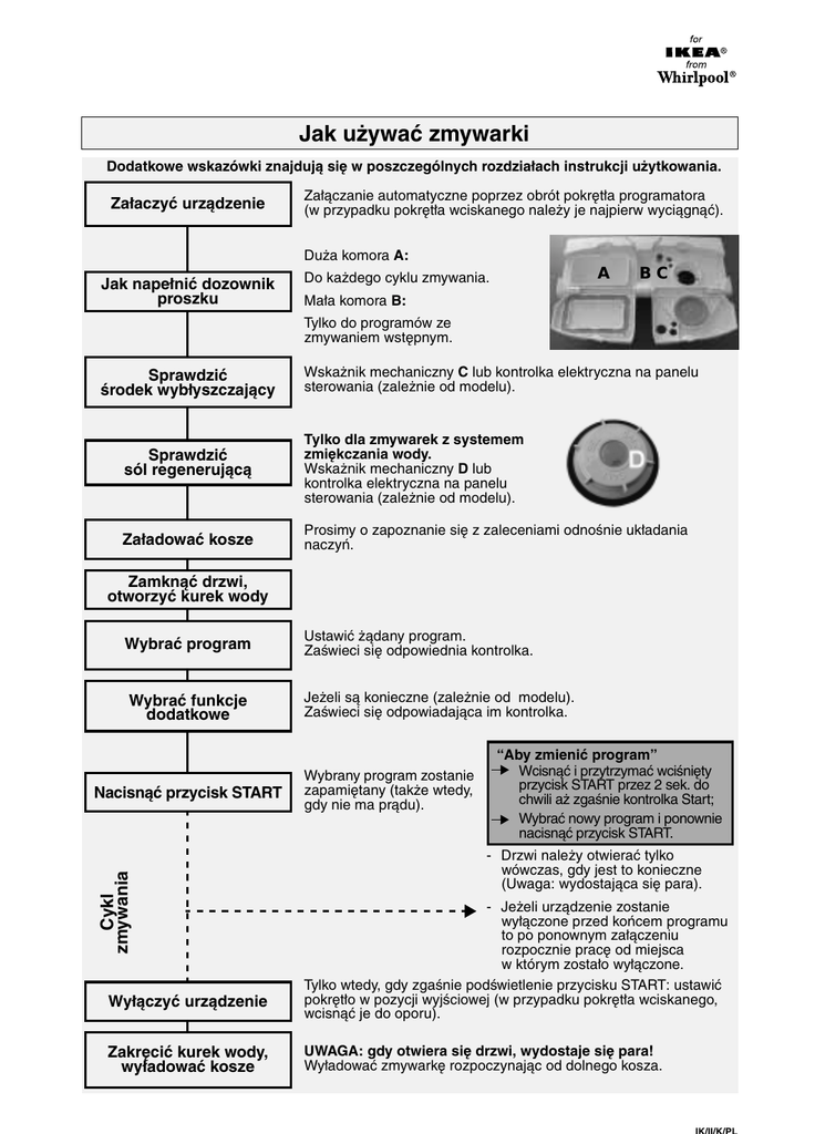 Jak używać zmywarki Dodatkowe wskazówki znajdują się w poszczególnych rozdziałach instrukcji użytkowania. Załaczyć urządzenie Załączanie automatyczne poprzez obrót pokrętła programatora (w przypadku pokrętła wciskanego należy je najpierw wyciągnąć). Duża komora A: Jak napełnić dozownik proszku A Do każdego cyklu zmywania. BC Mała komora B: Tylko do programów ze zmywaniem wstępnym. Sprawdzić środek wybłyszczający Wskażnik mechaniczny C lub kontrolka elektryczna na panelu sterowania (zależnie od modelu). Sprawdzić sól regenerującą Tylko dla zmywarek z systemem zmiękczania wody. Wskażnik mechaniczny D lub kontrolka elektryczna na panelu sterowania (zależnie od modelu). Załadować kosze Prosimy o zapoznanie się z zaleceniami odnośnie układania naczyń. Zamknąć drzwi, otworzyć kurek wody Wybrać program Wybrać funkcje dodatkowe Cykl zmywania Nacisnąć przycisk START Wyłączyć urządzenie Zakręcić kurek wody, wyładować kosze Ustawić żądany program. Zaświeci się odpowiednia kontrolka. Jeżeli są konieczne (zależnie od modelu). Zaświeci się odpowiadająca im kontrolka. Wybrany program zostanie zapamiętany (także wtedy, gdy nie ma prądu). “Aby zmienić program” Wcisnąć i przytrzymać wciśnięty przycisk START przez 2 sek. do chwili aż zgaśnie kontrolka Start; Wybrać nowy program i ponownie nacisnąć przycisk START. - Drzwi należy otwierać tylko wówczas, gdy jest to konieczne (Uwaga: wydostająca się para). - Jeżeli urządzenie zostanie wyłączone przed końcem programu to po ponownym załączeniu rozpocznie pracę od miejsca w którym zostało wyłączone. Tylko wtedy, gdy zgaśnie podświetlenie przycisku START: ustawić pokrętło w pozycji wyjściowej (w przypadku pokrętła wciskanego, wcisnąć je do oporu). UWAGA: gdy otwiera się drzwi, wydostaje się para! Wyładować zmywarkę rozpoczynając od dolnego kosza. Wskazówki dotyczące ładowania zmywarki i wyposażenia koszy Kosz górny: Regulowany wspornik na szklanki (A): Zależnie od położenia stosowany do np. małych szklanek lub kieliszków. Wsporniki naczyń (B): Zależnie od położenia stosowany do np. talerzy, filiżanek i kieliszków. Długie przybory kuchenne (na przykład widelce do mięsa, noże) należy wkładać ostrzem skierowanym w stronę wnętrza maszyny. Kosz dolny: Wsporniki do talerzy (C). Koszyk na sztućce (D): Koszyk na sztućce można wyjąć, aby zyskać wolne miejsce. Przybory kuchenne, którymi można się zranić, należy umieszczać w koszyku ostrzem skierowanym w dół. Należy używać jedynie naczynia nadające się do mycia w zmywarkach. Nie należy myć w zmywarce przedmiotów nie nadających się do tego, na przykład wykonanych z drewna, aluminium, z tworzyw, cyny, nakryć dekorowanych (nie emaliowanych), nakryć ze srebra. Co zrobić, gdy... Jeżeli wystąpią usterki w działaniu zmywarki, prosimy o sprawdzenie poniższych punktów, zanim zwrócicie się Państwo do Serwisu (* prosimy także o zapoznanie się z odpowiednim rozdziałem w instrukcji obsługi). Problem Przyczyna Urządzenie nie działa • Nie ma dopływu wody. Rozwiązanie • • Zmywarka pobiera zbyt mało wody. • • • Czy nie ma przerwy w dopływie • • prądu. • • • Uruchomienie programu nastawionego uprzednio. Jeśli naczynia nie są dobrze wysuszone • Zbyt mało środka wybłyszczającego. • Zwiększyć dozowanie *. • Resztki wody w zagłębieniach. Jeśli naczynia nie są dokładnie umyte • Ustawiać naczynia pochylone. • Strumień wody nie dochodzi do powierzchni naczyń. • • • • • Pozostałości w postaci piasku lub granulek Otworzyć kurek wody. Wyczyścić filtr od strony kurka wody. Sprawdzić czy wąż dopływowy nie jest zagięty. Włożyć wtyczkę do gniazdka. Nacisnąć przycisk START. Zamknąć drzwi. Sprawdzić bezpieczniki elektrycznej instalacji domowej. • Ustawić ewentualnie opóźnienie na “0”. • Umieścić naczynia tak, aby się nie stykały. Zagłębione części naczyń winny być odwrócone w dół. Zbyt mało proszku. • Dawkować proszek zgodnie ze wskazaniami producenta. Ustawiony został nieodpowiedni • Wybrać program zmywania o większej program. intensywności. Zablokowane ramiona rozpryskowe. • Ramiona rozpryskowe muszą się obracać swobodnie. Zatkane dysze ramion • Usunąć zanieczyszczenia blokujące dopływ rozpryskowych. wody *. Proszek nieodpowiedni/ zbyt stary. • Stosować markowy proszek, dobrej jakości. • Zatkane filtry. • Filtry nie są założone właściwie. Odbarwienie części z • Sok pomidorowy/z marchwi,... tworzywa • Regularnie sprawdzać filtry/ ewentualnie wyczyścić *. • Włożyć filtr prawidłowo i dokręcić *. • Zależnie od rodzaju materiału, należy w miarę potrzeby użyć proszku o większej sile wybielania. Osad na naczyniach • dający się usunąć • Prążki na naczyniach/szklankach. • Prążki/rysy na szklankach. • Warstwa soli na naczyniach/ szklankach. • Niedostateczne zmiękczenie wody, plamy z wapienia (kamień). • Zwiększyć dawkę środka wybłyszczającego *. • Zmniejszyć dawkę środka wybłyszczającego *. • Zakręcić prawidłowo pokrywę zbiornika soli *. Szklanki matowe/ nie błyszczące • Nie nadają się do mycia w zmywarce. • Myć szklanki nadające się do mycia w zmywarkach. Rdza na sztućcach • Nie są ze stali nierdzewnej. • Myć sztućce nadające się do mycia w zmywarkach. Identyfikacja błędów w pracy urządzenia • Kontrolka START miga. • nie dające się usunąć • Zmienić ustawienie przełącznika twardości wody, jeśli to konieczne, dodać soli*. • Sprawdzić, czy układ filtów nie jest zatkany i czy dopływ wody nie został przerwany (w razie konieczności wyczyścić filtry *). Ponownie uruchomić program. Wcisnąć i przytrzymać przycisk START przez około 2 sekundy, do momentu zgaśnięcia kontrolki START. Ponownie wybrać program i nacisnąć przyci
