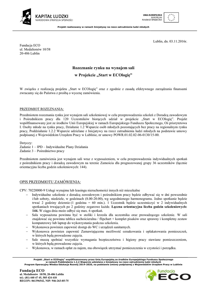 Projekt realizowany w ramach Inicjatywy na rzecz zatrudnienia ludzi młodych Lublin, dn. 03.11.2016r. Fundacja ECO ul. Medalionów 10/58 20-486 Lublin Rozeznanie rynku na wynajem sali w Projekcie „Start w ECOlogię” W związku z realizacją projektu „Start w ECOlogię” oraz z zgodnie z zasadą efektywnego zarządzania finansami zwracamy się do Państwa z prośbą o wycenę zamówienia. PRZEDMIOT ROZEZNANIA: Przedmiotem rozeznania rynku jest wynajem sali szkoleniowej w celu przeprowadzenia szkoleń z Doradcą zawodowym i Pośrednikiem pracy dla 120 Uczestników biorących udział w projekcie „Start w ECOlogię”. Projekt współfinansowany jest ze środków Unii Europejskiej w ramach Europejskiego Funduszu Społecznego, Oś priorytetowa I. Osoby młode na rynku pracy, Działanie 1.2 Wsparcie osób młodych pozostających bez pracy na regionalnym rynku pracy, Poddziałanie 1.2.2 Wsparcie udzielane z Inicjatywy na rzecz zatrudnienia ludzi młodych na podstawie umowy podpisanej z Wojewódzkim Urzędem Pracy w Lublinie, nr umowy POWR.01.02.02-06-0130/15-00. Dotyczy: Zadanie 1 – IPD – Indywidualne Plany Działania Zadanie 3 – Pośrednictwo pracy Przedmiotem zamówienia jest wynajem sali wraz z wyposażeniem, w celu przeprowadzenia indywidualnych spotkań z pośrednikiem pracy i doradcą zawodowym na terenie Zamościa dla prognozowanej grupy 36 uczestników (łącznie orientacyjna liczba godzin szkoleniowych: 144). OPIS PRZEDMIOTU ZAMÓWIENIA: CPV: 70220000-9 Usługi wynajmu lub leasingu nieruchomości innych niż mieszkalne Indywidualne szkolenie z doradcą zawodowym i pośrednikiem pracy będzie odbywać się w dni powszednie i/lub soboty, niedziele, w godzinach (8.00-20.00), wg uzgodnionego harmonogramu. Jedno spotkanie będzie trwać 2 godziny dziennie (1 godzina = 60 min.). 1 Uczestnik będzie uczestniczyć w 2 indywidualnych spotkaniach trwających po 2 godziny zegarowe każde. Łączna orientacyjna liczba godzin szkoleniowych: 144. W ciągu dnia może odbyć się max. 6 spotkań. Sala wyposażona powinna być w stoliki i krzesła dla uczestnika oraz prowadzącego szkolenie. W sali znajdować się powinna tablica suchościeralna / flipchart + komplet pisaków oraz sprawny i kompletny zestaw komputerowy lub laptop do wykorzystania podczas szkolenia. Wykonawca powinien zapewnić dostęp do WC i urządzeń sanitarnych. Wykonawca powinien zapewnić Zamawiającemu możliwość oznakowania i oplakatowania pomieszczeń, w których będą prowadzone zajęcia. Sale muszą spełniać wszystkie wymagania bezpieczeństwa i higieny pracy stawiane pomieszczeniom, w których będą prowadzone zajęcia. Wykonawca, w ramach opłat za najem, ma obowiązek utrzymać pomieszczenia w czystości i porządku. Projekt „Start w ECOlogię” współfinansowany przez Unię Europejską ze środków Europejskiego Funduszu Społecznego w ramach Poddziałania 1.2.2 Wsparcie udzielane z Inicjatywy na rzecz zatrudnienia ludzi młodych Program Operacyjny Wiedza Edukacja Rozwój 2014-2020, na podstawie umowy podpisanej z Wojewódzkim Urzędem Pracy w Lublinie Fundacja ECO ul. Medalionów 10/58, 20-486 Lublin tel.: (81) 440 47 45, 505 424 418 REGON: 061396542, NIP: 946-263-85-75 Projekt realizowany w ramach Inicjatywy na rzecz zatrudnienia ludzi młodych Wykonawca zapewnia oświetlenie naturalne i sztuczne, odpowiednią temperaturę w zależności od pory roku, wymianę powietrza, zabezpieczenie przed wilgocią, niekorzystnymi warunkami cieplnymi i nasłonecznieniem. Sale powinny znajdować się w budynku zlokalizowanym w miejscu łatwo dostępnym dla osób dojeżdżających na szkolenie środkami komunikacji publicznej. Miejsce realizacji: Zamość Termin realizacji: listopad 2016 – czerwiec 2017 Dokładne terminy i miejsca realizacji szkoleń zostaną wskazane przez Zamawiającego przed rozpoczęciem realizacji usługi. Wszystkie kwestie szczegółowe i zasady współpracy pomiędzy Zamawiającym i Wykonawcą precyzować będzie umowa cywilno-prawna. WARUNKI UDZIAŁU W ROZEZNANIU RYNKU: Wykonawca ubiegający się o zamówienie musi dysponować salą na terenie Miasta Zamość spełniającą wszystkie określone warunki. Informujemy, że powyższa informacja nie jest ogłoszeniem w rozumieniu ustawy z dnia 29 stycznia 2004 r. – Prawo zamówień publicznych (Dz. U. z 2007 r., Nr 223, poz. 1655 ze zm.) i nie stanowi oferty w rozumieniu art. 66 Kodeksu Cywilnego. Informacja ma na celu wyłącznie rozeznanie rynku w celu wynajmu sali szkoleniowej i uzyskanie wiedzy na temat kosztów usługi. OPIS SPOSOBU PRZEDSTAWIENIA OFERTY: Wykonawca powinien przedstawić ofertę na formularzu załączonym do niniejszego rozeznania rynku. Podpisaną ofertę należy do dnia 10.11.2016r. do godz. 23.59 dostarczyć osobiście, scan na adres mailowy lub przesłać pocztą na adres: Fundacja ”ECO” ul. Medalionów 10/58 20-486 Lublin Dodatkowych informacji udziela: Sylwia Czarnecka e-mail: [email protected] Załączniki: 1. Formularz Projekt „Start w ECOlogię” współfinansowany przez Unię Europejską ze środków Europejskiego Funduszu Społecznego w ramach Poddziałania 1.2.2 Wsparcie udzielane z Inicjatywy na rzecz zatrudnienia ludzi młodych Program Operacyjny Wiedza Edukacja Rozwój 2014-2020, na podstawie umowy podpisanej z Wojewódzkim Urzędem Pracy w Lublinie Fundacja ECO ul. Medalionów 10/58, 20-486 Lublin tel.: (81) 440 47 45, 505 424 418 REGON: 061396542, NIP: 946-263-85-75 Projekt realizowany w ramach Inicjatywy na rzecz zatrudnienia ludzi młodych Załącznik 1 FORMULARZ Imię i Nazwisko Wykonawcy ................................................................................ Numer telefonu ................................................................................ Adres e-mail …………………………………………………… Fundacja ECO ul. Medalionów 10/58 24-486 Lublin W odpowiedzi na rozeznanie rynku - wynajem sali w celu przeprowadzenia szkoleń z Doradcą zawodowym i Pośr