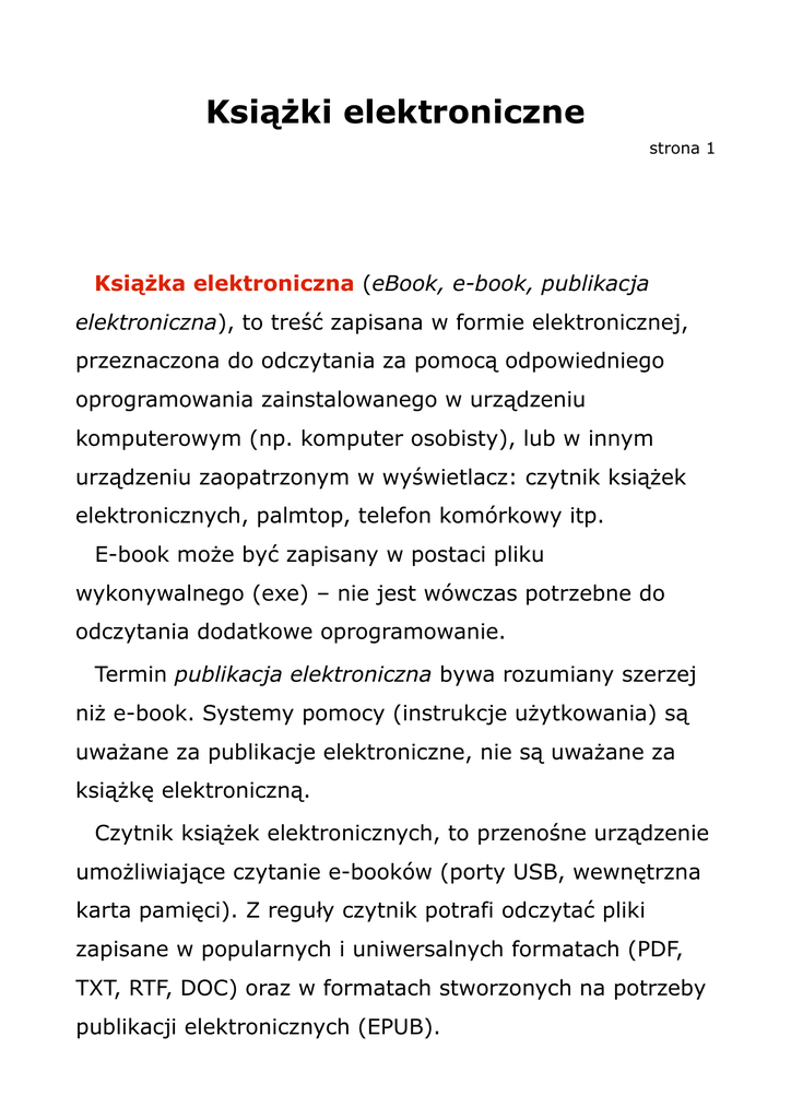 Książki elektroniczne strona 1 Książka elektroniczna (eBook, e-book, publikacja elektroniczna), to treść zapisana w formie elektronicznej, przeznaczona do odczytania za pomocą odpowiedniego oprogramowania zainstalowanego w urządzeniu komputerowym (np. komputer osobisty), lub w innym urządzeniu zaopatrzonym w wyświetlacz: czytnik książek elektronicznych, palmtop, telefon komórkowy itp. E-book może być zapisany w postaci pliku wykonywalnego (exe) – nie jest wówczas potrzebne do odczytania dodatkowe oprogramowanie. Termin publikacja elektroniczna bywa rozumiany szerzej niż e-book. Systemy pomocy (instrukcje użytkowania) są uważane za publikacje elektroniczne, nie są uważane za książkę elektroniczną. Czytnik książek elektronicznych, to przenośne urządzenie umożliwiające czytanie e-booków (porty USB, wewnętrzna karta pamięci). Z reguły czytnik potrafi odczytać pliki zapisane w popularnych i uniwersalnych formatach (PDF, TXT, RTF, DOC) oraz w formatach stworzonych na potrzeby publikacji elektronicznych (EPUB). Książki elektroniczne strona 2 Popularne czytniki: • Amazon Kindle, • Sony Reader, • eClicto (polska firma Kolporter), • iLiad(Philips). Coraz częściej stosuje się w nich tzw. elektroniczny papier (wyświetlacz), o elastyczności i gabarytach zbliżonych do tradycyjnego papieru. Można na nim również pisać (elektryczny „ołówek”). Cechy, jakie powinna mieć książka elektroniczna: • Wygodny system nawigacyjny i wyszukiwawczy w oprogramowaniu służącym do odczytywania książki, pozwalający nie tylko przewijać strony publikacji, ale i powiększać tekst na ekranie, tworzyć elektroniczne zakładki, wykorzystywać hipertekst i wyszukiwać informacje według dowolnych kryteriów, z użyciem warunków logicznych. • Bardzo dobra czytelność, zakładająca zaawansowane techniki generowania czcionek ekranowych i odpowiednią rozdzielczość ekranu. Obecnie długie czytanie e-booka jest męczące. Książki elektroniczne strona 3 • Techniki ułatwiające odbiór informacji osobom o rozmaitych dysfunkcjach, np. dźwiękowe odtwarzanie treści (synteza dźwięku), szczególnie istotne dla osób niewidomych i niedowidzących. • Dostęp do Internetu (także bezprzewodowy), dzięki któremu użytkownik urządzenia komputerowego może aktualizować już posiadane materiały i pobierać nowe. • Efektywnie działający, międzynarodowy system wyszukiwania i pozyskiwania materiałów z rozmaitych źródeł, np. biblioteki publiczne i naukowe, archiwa, wydawnictwa, codzienna prasa i periodyki. • Skuteczny (i wygodny) system płatności za pośrednictwem Internetu. Zalety książek elektronicznych. • Aktualność informacji, którą zawdzięczamy przede wszystkim Internetowi. • Niższy koszt pozyskiwania informacji (gazet, książek, podręczników szkolnych, prac naukowych itd.). Oczywiście, jeśli nie liczymy jednorazowych kosztów sprzętu. • Nieograniczona praktycznie objętość materiałów Książki elektroniczne strona 4 elektronicznych. • Łączenie najrozmaitszych typów mediów w jednolitej postaci elektronicznej, niemożliwe do uzyskania w książce tradycyjnej. • Ułatwienie dostępu do informacji dla osób niepełnosprawnych. • Łatwa archiwizacja, brak problemów z przechowywaniem i dostępem do dużej ilości książek. Wady książek elektronicznych. • Większe wymagania urządzeń elektronicznych, ich używanie wiąże się z określonym poziomem kultury technicznej. • Niedostateczna jakość wyświetlaczy, powodująca szybsze zmęczenie czytającego i wolniejsze czytanie (wg testów - o około 25%). • Koszt nabycia urządzenia (specjalistycznego odtwarzacza lub komputera). • Ograniczona przenośność (nie dotyczy to w zasadzie notebooka czy czytnika książek elektronicznych). • Powolność łączy i wysoki koszt korzystania z Internetu. Książki elektroniczne strona 5 • Uboga oferta. • Ograniczenia ekonomicznej infrastruktury (zwłaszcza systemu rozliczeń), zniechęcające wydawców do znacznie intensywniejszego wykorzystywania nowych możliwości. • Niezbyt skuteczne techniki chronienia praw autorskich. Nie jest jasny wpływ e-booków na ochronę środowiska. Oszczędzamy papier (lasy), zużywamy więcej energii elektrycznej (wada lub zaleta). Popularne formaty książek elektronicznych. • PDF (Portable Document Format - przenośny format dokumentu). Najpopularniejszy czytnik tych plików w systemie Windows, to program Adobe Reader. Lekki i szybki czytnik, to program Foxit Reader. Pliki PDF są właściwie plikami graficznymi. Powoduje to, że standardowa (dla systemu operacyjnego) funkcja szukania nie potrafi znaleźć w nich tekstu. • LIT (literature), książki w formacie LIT czytamy programem Microsoft Reader, a przygotowujemy programem Reader Works Standard. Nie można ich Książki elektroniczne strona 6 drukować. Program Microsoft Reader 2.1.1 można pobrać stąd: http://www.microsoft.com/reader/downloads/pc.aspx Przykładowa książka: Damaszek.lit • PRC (Product Representation Compact). Pliki PRC odczytujemy w przeglądarce Mobipocket Reader. Nie można ich drukować. Program Mobipocket Reader można pobrać stąd: http://download.chip.eu/pl/Mobipocket-ReaderPro_149679.html • EXE Pliki w formacie EXE (programy wykonywalne) można przygotowywać korzystając z różnych programów, np. NATATA eBook Compiler Free, Easy Ebook Creator, eBooksWriter.