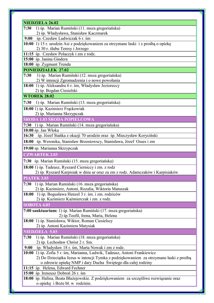 NIEDZIELA 26.02 7:30 1) śp. Marian Rumiński (11. msza gregoriańska) 2) śp. Władysława, Stanisław Kaczmarek 9:00 śp. Czesław Ludwiczak 6 r. śm 10:00 1) 15 r. urodzin Asi z podziękowaniem za otrzymane łaski i z prośbą o opiekę 2) 30 r. ślubu Teresy i Jerzego 11:15 śp. Czesław Polaczyk i zm z rodz. 15:00 śp. Janina Gindera 18:00 śp. Zygmunt Trenda PONIEDZIAŁEK 27.02 7:30 1) śp. Marian Rumiński (12. msza gregoriańska) 2) W intencji Zgromadzenia i o nowe powołania 18:00 1) śp. Aleksandra 6 r. śm, Władysław Jezioreccy 2) śp. Bogdan Ciesielski WTOREK 28.02 7:30 1) śp. Marian Rumiński (13. msza gregoriańska) 18:00 1) śp. Kazimierz Frąckowiak 2) śp. Marianna Skrzypczak ŚRODA 1.03 ŚRODA POPIELCOWA 7:30 1) śp. Marian Rumiński (14. msza gregoriańska) 10:00 śp. Jan Włoka 16:30 śp. Józef Stańka z okazji 70 urodzin oraz śp. Mieczysław Koryciński 18:00 śp. Weronika, Stanisław Brzostowscy, Stanisława, Józef Osses i zm 19:00 sp. Marianna Skrzypczak CZWARTEK 2.03 7:30 śp. Marian Rumiński (15. msza gregoriańska) 18:00 1) śp. Tadeusz, Ryszard Cierniccy i zm. z rodz 2) śp. Ryszard Karpisiak w dniu ur oraz za zm z rodz. Adamczaków i Karpisiaków PIĄTEK 3.03 7:30 1) śp. Marian Rumiński (16. msza gregoriańska) 2) śp. Kazimierz, Antoni, Rozalia, Wiktoria Matuszak 18:00 1) śp. Bogusława Henzel 3 r. śm. i zm. rodziców 2) śp. Kazimierz Kaźmierczak i zm. z rodz. SOBOTA 4.03 7:00 sanktuarium: 1) śp. Marian Rumiński (17. msza gregoriańska) 2) śp.Teofil, Irena, Maria, Helena 18:00 1) śp. Stanisława, Wiktor, Roman Ciesielscy 2) śp. Antoni Kazimiera Matysiak NIEDZIELA 5.03 7:30 1) śp. Marian Rumiński (18. msza gregoriańska) 2) śp. Lechosław Chróst 2 r. Sm. 9:00 śp. Władysław 18 r. śm, Marta Nowak i zm z rodz. 10:00 1) śp. Zofia 5 r. śm, Marianna, Ludwik, Tadeusz, Antoni Frankiewicz 2) Do Dzieciątka Jezus w intencji Tymka z podziękowaniem za otrzymane łaski z prośbą o zdrowie opiekę NMP i dary Ducha Świętego dla całej rodziny 11:15 śp. Helena, Edward Fechner 15:00 śp. Ireneusz Dobroń 26 r. śm 18:00 śp. Halina, Beata Błażejewskie. Z podziękowaniem za szczęśliwe rozwiązanie oraz o opiekę i Boże bł. w rodzinie. OGŁOSZENIA DUSZPASTERSKIE 26.02.2017 1. Dzisiaj przed kościołem zbiórka ofiar na ogrzewanie kościołów. 2. W środę rozpoczynamy Wielki Post. Porządek mszy świętych w farze w Środę Popielcową: 7:30, 10:00, 16:30, 18:00, 19:00. Tego dnia zbiórka ofiar do puszek na Caritas. 3. Spowiedź z racji I piątku: w czwartek w godz. 17:00-18:00 i piątek od 16:30-18:00 4. Zapraszamy do fary na Drogę Krzyżową w każdy piątek: - dla dzieci o godz. 16:30 - dla dorosłych i młodzieży o godz. 18:30 Gorzkie Żale w każdą niedzielę o godz. 14:00 5. Kandydatów do bierzmowania z klas III gimnazjum zapraszamy na OBOWIĄZKOWE spotkanie w piątek po wieczornej Drodze Krzyżowej. 6. Objazd chorych z Komunią św. w sobotę od godz. 8:00 7. Spowiedź dla kandydatów do bierzmowania i świadków w sobotę o godz. 11:00 8. Zbiórka wszystkich ministrantów w sobotę o godz. 13:00. 9. Bóg zapłać za prace i ofiary minionego tygodnia. 10. Polecamy prasę katolicką nowy numer Gazetki Sanktuarium. 11. Pan Bóg odwołał z naszej wspólnoty śp. Mariana Hałasa Stęszewskie Dnia 245 lutego 2017 roku odeszła od nas w wieku 62 lat ś. p. KRAWIEC GRAŻYNA Zamieszkała Witobel O czym zawiadamia pogrążona w głębokim smutku rodzina. Msza św. pogrzebowa zostanie odprawiona we wtorek 28 lutego br. o godzinie 10 00 w kaplicy cmentarnej w Stęszewie. Pogrzeb po Mszy św. na miejscowym cmentarzu Dnia 24 lutego 2017 roku odeszła od nas w wieku 77 lat nasza ukochana mama, babcia i prababcia ś. p. MICHALAK HALINA Z domu Nowak Zamieszkała Wielkawieś ul Czereśniowa 19 O czym zawiadamia pogrążona w głębokim smutku rodzina. Msza św. pogrzebowa zostanie odprawiona we wtorek 28 lutego br. o godzinie 12 00 w kaplicy cmentarnej w Stęszewie. Pogrzeb po Mszy św. na miejscowym cmentarzu PLAN WIZYTACJI 6 marca 2017 Parafia p.w. Świętej Trójcy w STĘSZEWIE 9:00 - Msza św. z udziałem chorych - spotkanie z chorymi w salce parafialnej 11:00 – spotkanie z dyrektorami szkół 12:00 – spotkanie z siostrami Elżbietankami i wizyta w sanktuarium 13:00 – obiad - spotkanie z ks. proboszczem i wikariuszem 15:00 - Nabożeństwo na cmentarzu 16:00 – spotkanie z przedstawicielami grup, Radą Ekonomiczną, Radą Duszpasterską i katechetami w salce parafialnej 18:00 – Msza św. z udzieleniem sakramentu bierzmowania