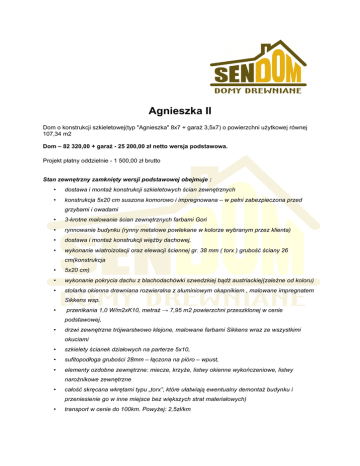 Agnieszka II Dom o konstrukcji szkieletowej(typ "Agnieszka" 8x7 + garaż 3,5x7) o powierzchni użytkowej równej 107,34 m2 Dom – 82 320,00 + garaż - 25 200,00 zł netto wersja podstawowa. Projekt płatny oddzielnie - 1 500,00 zł brutto Stan zewnętrzny zamknięty wersji podstawowej obejmuje : dostawa i montaż konstrukcji szkieletowych ścian zewnętrznych konstrukcja 5x20 cm suszona komorowo i impregnowana – w pełni zabezpieczona przed grzybami i owadami 3-krotne malowanie ścian zewnętrznych farbami Gori rynnowanie budynku (rynny metalowe powlekane w kolorze wybranym przez klienta) dostawa i montaż konstrukcji więźby dachowej, wykonanie wiatroizolacji oraz elewacji ściennej gr. 38 mm ( torx ) grubość ściany 26 cm(konstrukcja 5x20 cm) wykonanie pokrycia dachu z blachodachówki szwedzkiej bądź austriackiej(zależne od koloru) stolarka okienna drewniana rozwieralna z aluminiowym okapnikiem , malowane impregnatem Sikkens wsp. przenikania 1,0 W/m2xK10, metraż → 7,95 m2 powierzchni przeszklonej w cenie podstawowej, drzwi zewnętrzne trójwarstwowo klejone, malowane farbami Sikkens wraz ze wszystkimi okuciami szkielety ścianek działowych na parterze 5x10, sufitopodłoga grubości 28mm – łączona na pióro – wpust, elementy ozdobne zewnętrzne: miecze, krzyże, listwy okienne wykończeniowe, listwy narożnikowe zewnętrzne całość skręcana wkrętami typu „torx”, które ułatwiają ewentualny demontaż budynku i przeniesienie go w inne miejsce bez większych strat materiałowych) transport w cenie do 100km. Powyżej: 2,5zł/km Dodatki: ganek – 3 500 zł schody zabiegowe + podest – 3 500 zł dopłata do drzwi tarasowych 160x205 cm – 1 800 zł ścianka kolankowa 50 cm na budynku – 3 200 zł tynk na ściany parteru – 5 500 zł taras zadaszony 3x6 m – 7 350 zł 2 szt. okien połaciowych 74x118 cm – 3 000 zł stolarka okienna 14,02 m^2: 4 600 zł − 4 szt. 100x130 cm − 2 szt. 70x90 cm − 3 szt. 80x90 cm − 5 szt. 90x120 cm Całość w stanie surowym zewnętrznie zamkniętym –139 970, 00 zł netto Cena jaką mogę zaproponować to 126 000,00 zł netto w ofercie promocyjnej Stan deweloperski płatny oddzielnie: ocieplenie 20 cm + 5 cm na stelażu metalowym (możliwość zastosowania ecofibru po dodatkowych uzgodnieniach i określeniu różnicy cenowej), zamknięciem ścian płytą GK malowanymi jednokrotnie na biało lub boazerią nie lakierowaną , instalacja wod-kan z instalacją grzewczą (bez pieca i grzejników) instalacja elektryczna drzwi wewnętrzne drewniane z oblistwowaniami, klamkami i malowaniem wg projektu parapety wewnętrzne malowane wygłuszona podłoga (5 cm wełny mineralnej) wykończona płytą jastrychową zamknięcie stropu na poddaszu z drabinka strychową (deski nie lakierowane) piec na pelet i/lub ekogroszek z podajnikiem (Landzberg PR-1,7 – 17 kW) grzejniki na parterze grzejniki na poddasze grzejniki dwupanelowe kominek nie uwzględniony w cenie Koszt stanu deweloperskiego – 85 200,00 zł netto Cena nie obejmuje : (ceny do ustalenia) Wykonania fundamentu (moŜliwość wykonania przez naszą ekipę monterską) Wykonania komina (moŜliwość wykonania przez naszą ekipę monterską) Wykonania prac wykończeniowych wewnętrznych :wełna,płyta gk. instalacje. Dodatki : komin podłoga pływająca na poddaszu Istnieje możliwość budowy domu według projektu klienta bądź rozbudowy naszego projektu. Powyższa oferta nie stanowi oferty w rozumieniu prawa handlowego, jest jedynie zaproszeniem do rozmowy. Pozdrawiam, Specjalista ds. sprzedaży Michał Adamski tel: +48 664 492 169 mail: [email protected] SENDOM DOMY DREWNIANE ul. Partyzantów 10c 83-430 Stara Kiszewa tel/fax (058) 687-66-18 www.sendom.pl