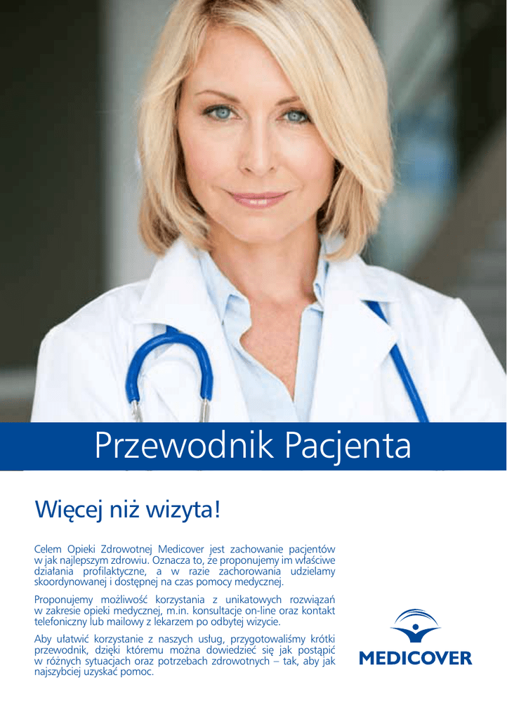 Przewodnik Pacjenta Więcej niż wizyta! Celem Opieki Zdrowotnej Medicover jest zachowanie pacjentów w jak najlepszym zdrowiu. Oznacza to, że proponujemy im właściwe działania profilaktyczne, a w razie zachorowania udzielamy skoordynowanej i dostępnej na czas pomocy medycznej. Proponujemy możliwość korzystania z unikatowych rozwiązań w zakresie opieki medycznej, m.in. konsultacje on‑line oraz kontakt telefoniczny lub mailowy z lekarzem po odbytej wizycie. Aby ułatwić korzystanie z naszych usług, przygotowaliśmy krótki przewodnik, dzięki któremu można dowiedzieć się jak postąpić w różnych sytuacjach oraz potrzebach zdrowotnych – tak, aby jak najszybciej uzyskać pomoc. NAGŁE SYTUACJE ZAGRAŻAJĄCE ŻYCIU (np. utrata przytomności, duszności, drgawki, ostry ból za mostkiem, plamienia i krwawienia w ciąży) (np. nadciśnienie i choroby serca astma, alergia, choroby tarczycy) URAZY I OPARZENIA HOT LINE MEDICOVER 24/7, 500 900 999 Zadzwoń i uzyskaj pomoc Ważne! Dyspozytorzy Hot Line Medicover udzielają porad medycznych, wskazują miejsce udzielenia pomocy doraźnej, decydują o interwencji pogotowia lub organizacji wizyty. Hot Line Medicover jest do Twojej dyspozycji 24h na dobę, 7 dni w tygodniu. Pamiętaj! Dzwoniąc do Hot Line Medicover umawiasz także wizyty domowe. Wizyty domowe oraz interwencje pogotowia Medicover realizowane są w obszarze udzielania świadczeń. PRZEZIĘBIENIA I INFEKCJE (np. ból gardła, grypa, biegunka, zakażenie układu moczowego) MEDICOVER ONLINE Skorzystaj z konsultacji on-line z lekarzem i uzyskaj poradę medyczną lub Umów wizytę do lekarza opieki podstawowej lub lekarza prowadzącego MEDICOVER EXPRESS -zapraszamy już od września Z prostym problemem zdrowotnym zgłoś się do Medicover Express. Aby umówić wizytę zaloguj się do Medicover OnLine lub zadzwoń do Centrum Obsługi Klienta. Wizytę odbędziesz jeszcze tego samego dnia. Usługa dostępna jest tylko dla dorosłych. Więcej informacji na www.medicover.pl CENTRUM OBSŁUGI KLIENTA, 500 900 500 Zadzwoń i umów wizytę do lekarza opieki podstawowej lub lekarza prowadzącego lub Poproś o kontakt telefoniczny z koordynatorem opieki lub lekarzem NOWE OBJAWY O NIEUSTALONEJ PRZYCZYNIE CHOROBY PRZEWLEKŁE I OPIEKA SPECJALISTY MEDICOVER ONLINE Umów wizytę do swojego lekarza prowadzącego lub Zadaj pytanie swojemu lekarzowi prowadzącemu. Jeśli Twój lekarz uzna, że istnieją wskazania medyczne, skieruje Cię na konsultacje do właściwego specjalisty lub Umów wizytę do specjalisty, pod którego opieką pozostajesz. Możesz mu także zadać pytanie. Jeśli Twój stan zdrowia wymaga stałej opieki specjalistycznej, zapewniamy ciągłość leczenia u tego samego specjalisty. lub Skorzystaj z konsultacji on-line z lekarzem i uzyskaj poradę lub Jeśli potrzebujesz recepty, zamów receptę na stale przyjmowane leki CENTRUM OBSŁUGI KLIENTA, 500 900 500 Zadzwoń i umów wizytę u lekarza prowadzącego lub lekarza specjalisty lub Poproś o kontakt telefoniczny z koordynatorem opieki lub lekarzem (np. złe sampopoczucie, bóle głowy, bóle brzucha, ból pleców) MEDICOVER ONLINE Skorzystaj z konsultacji on‑line, uzyskaj poradę medyczną oraz skierowania na ewentualne badania dodatkowe lub Zadaj pytanie swojemu lekarzowi prowadzącemu i uzyskaj poradę medyczną i wskazówki na temat dalszego postępowania lub Umów wizytę do lekarza prowadzącego CENTRUM OBSŁUGI KLIENTA, 500 900 500 Zadzwoń i umów wizytę do lekarza prowadzącego lub Poproś o kontakt telefoniczny z koordynatorem opieki lub lekarzem Pamiętaj! Jeśli w Medicover OnLine nie znalazłeś wizyty w terminie, w którym potrzebujesz, zadzwoń do Centrum Obsługi Klienta, a my znajdziemy dla Ciebie rozwiązanie. Możesz poprosić również o połączenie ze swoim koordynatorem opieki. Pamiętaj także o innych możliwościach uzyskania porady medycznej, tj. konsultacjach on‑line z lekarzem czy pytaniu do swojego lekarza prowadzącego poprzez Medicover OnLine. WIZYTA PROFILAKTYCZNA SKIEROWANIA NA BADANIA MEDICOVER ONLINE Pamiętaj! CENTRUM OBSŁUGI KLIENTA, 500 900 500 MEDICOVER ONLINE Zadaj pytanie swojemu lekarzowi prowadzącemu. Skonsultuj z nim swoje potrzeby zdrowotne. W razie wskazań medycznych lekarz skieruje Cię na odpowiednie badania przed wizytą profilaktyczną Umów wizytę u swojego lekarza prowadzącego Zadzwoń i umów wizytę u lekarza prowadzącego SZCZEPIENIA PROFILAKTYCZNE – DOROŚLI MEDICOVER EXPRESS -zapraszamy już od września Szczepienie przeciwko grypie i WZW możesz wykonać w Medicover Express. Aby umówić wizytę zaloguj się do Medicover OnLine lub zadzwoń do Centrum Obsługi Klienta. Wizytę odbędziesz jeszcze tego samego dnia. Więcej informacji na www.medicover.pl Wszystkie badania wykonujemy ze wskazań medycznych. Aby otrzymać skierowanie na badania RTG, tomografię komputerową oraz rezonans magnetyczny konieczna jest wizyta u lekarza. Skorzystaj z konsultacji on-line z lekarzem i zapytaj o skierowanie lub Zadaj pytanie dotyczące skierowania lekarzowi opieki podstawowej lub lekarzowi prowadzącemu lub Umów wizytę u lekarza opieki podstawowej lub lekarza prowadzącego CENTRUM OBSŁUGI KLIENTA, 500 900 500 Zadzwoń i umów wizytę u lekarza opieki podstawowej lub lekarza prowadzącego WYNIKI BADAŃ I ICH OPISY MEDICOVER ONLINE Wejdź w zakładkę „Moje Zdrowie” i zapoznaj się ze swoimi wynikami oraz komentarzem lekarza. W razie dodatkowych pytań zadaj pytanie lekarzowi, który zlecił badanie. lub Skorzystaj z konsultacji on-line z lekarzem i poproś o interpretację wyników CENTRUM OBSŁUGI KLIENTA, 500 900 500 Zadzwoń i poproś o kontakt ze swoim koordynatorem opieki, w celu konsultacji wyników Pamiętaj! Wyniki udostępniane są w Medicover OnLine automatycznie, po godzinie 20.00, w dniu otrzymania wyników. Lekarz komentuje wyniki w pierwszym dniu swojej pracy. Oryginał wyników badań możesz odebrać w dowolnym Centrum Medicover. Zanim odbie