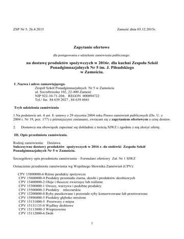 ZSP Nr 5. 26.4.2015 Zamość dnia 03.12.2015r. Zapytanie ofertowe dla postępowania o udzielenie zamówienia publicznego: na dostawę produktów spożywczych w 2016r. dla kuchni Zespołu Szkół Ponadgimnazjalnych Nr 5 im. J. Piłsudskiego w Zamościu. I .Nazwa i adres zamawiającego. Zespół Szkół Ponadgimnazjalnych Nr 5 w Zamościu ul. Szczebrzeska 102, 22-400 Zamość NIP 922-10-71-204; REGON 000094722 Tel./ fax 84 639 2027 , 84 639 6041 Tryb udzielenia zamówienia 1.Na podstawie art. 4 ust. 8. ustawy z 29 stycznia 2004 roku Prawo zamówień publicznych (Dz. U. z 2004 r. Nr 19, poz. 177) z późniejszymi zmianami, zwracam się z zapytaniem ofertowym o cenę dostaw. 2. Dostawca ma obowiązek zapoznać się dokładnie z treścią SIWZ i zgodnie z nią złożyć ofertę. III. Opis przedmiotu zamówienia. Rodzaj zamówienia: Dostawa. Sukcesywne dostawy produktów spożywczych w 2016 r. do stołówki Zespołu Szkół Ponadgimnazjalnych Nr 5 w Zamościu. Szczegółowy opis przedmiotu zamówienia – Formularz ofertowy Zał. Nr 1 SIWZ Oznaczenie przedmiotu zamówienia wg Wspólnego Słownika Zamówień (CPV): CPV 15800000-6 Różne produkty spożywcze CPV 15600000-4 Produkty przemiału ziarna, skrobi i produktów skrobiowych CPV 15400000-2 Oleje i tłuszcze zwierzęce lub roślinne CPV 15300000-1 Owoce, warzywa i podobne produkty CPV 15500000-3 Produkty mleczarskie CPV 15200000-0 Ryby puszkowane i pozostałe ryby konserwowane lub przetworzone CPV 15896000-5 Produkty głęboko mrożone CPV 15131000-5 Przetwory z mięsa CPV 15131135-0 Wędliny drobiowe CPV 15113000-3 Wieprzowina CPV 15112000-6 Drób 1 CPV 15810000-9 Świeże wyroby piekarskie CPV 03220000-9 Warzywa, owoce i orzechy CPV 03222321-9 Jabłka CPV 03142500-3 Jaja Miejsce dostaw: magazyn żywnościowy Zespołu Szkół Ponadgimnazjalnych Nr 5 w Zamościu. Szczegółowy wykaz określony został odpowiednio w załącznikach od nr .6 do nr .20 SIWZ. Warunki realizacji zamówienia określone zostały w załączonym do SIWZ projekcie umowy załącznik nr . 5. Każdy Dostawca może złożyć oferty na dowolną ilość części zamówienia wraz z formularzem oferty zał. nr 1 IV. Termin wykonania zamówienia. Wymagany termin realizacji zamówienia: do 31.12.2016r. Planowane rozpoczęcie dostaw : od 01.01.2016 r. V. Warunki udziału w postępowaniu oraz opis sposobu dokonywania oceny spełnienia tych warunków. 5.1. O udzielenie zamówienia mogą ubiegać się Dostawcy, którzy spełniają warunki udziału w postępowaniu, o których mowa w art. 22 ust. 1 ustawy . 5.2 O udzielenie zamówienia mogą ubiegać się Dostawcy, którzy spełniają warunek udziału w postępowaniu dotyczący braku podstaw do wykluczenia z postępowania o udzielenie zamówienia publicznego w okolicznościach, o których mowa w art. 24 ust. 1 ustawy. VI. Wykaz oświadczeń lub dokumentów, jakie mają dostarczyć wykonawcy w celu potwierdzenia spełniania warunków udziału w postępowaniu : 1. w zakresie wykazania spełniania przez Dostawcę warunków, o których mowa w art. 22 ust. 1 ustawy należy przedłożyć: 1) oświadczenie o spełnianiu warunków udziału w postępowaniu (zał. nr. 2 do SIWZ). 2. W zakresie potwierdzenia niepodlegania wykluczeniu na podstawie art. 24 ust. 1 ustawy, należy przedłożyć: 1) oświadczenie o braku podstaw do wykluczenia (zał. nr.3 do SIWZ). 3.Dokumenty dotyczące przynależności do tej samej grupy kapitałowej : Dostawca składa listę podmiotów należących do tej samej grupy kapitałowej, o której mowa w art.24 ust.2 pkt5, albo informację o tym , że nie należy do grupy kapitałowej. (zał. nr 4 SIWZ). 4.Inne dokumenty: Formularz oferty wraz z formularzem cenowym z wypełnionymi wszystkimi rubrykami . VII. Informacje o sposobie porozumiewania się Zamawiającego z Wykonawcami oraz przekazywania oświadczeń lub dokumentów, a także wskazanie osób uprawnionych do porozumiewania się z wykonawcami. 1. Oświadczenia, wnioski, zawiadomienia oraz informacje Zamawiający i Dostawcy przekazują pisemnie, mailem lub faksem. Korespondencję związaną z niniejszym postępowaniem, należy kierować na adres: 2 Zespół Szkół Ponadgimnazjalnych Nr 5 w Zamościu ul. Szczebrzeska 102, 22-400 Zamość NIP 922-10-71-204; REGON 000094722 Tel./ fax 84 639 2027 , 84 639 6041 Osobą uprawnioną do kontaktowania się z Dostawcami w sprawach przedmiotu zamówienia jest p. Adam Pasieczny - tel. 84 639 20 27 VIII. Wymagania dotyczące wadium. Wadium nie obowiązuje. IX. Termin związania ofertą. Okres związania ofertą wynosi 30 dni wraz z upływem terminu składania ofert. X. Opis sposobu przygotowywania ofert. 1. Dostawca sporządza formularz oferty zgodnie z wzorem stanowiącym załącznik nr 1 SIWZ, – wpisując cenę brutto zgodną z formularzem cenowym danego zamówienia , brak wyceny jakiejkolwiek pozycji świadczy, że wykonawca nie jest w stanie zrealizować tej dostawy. Taką ofertę zamawiający odrzuca. 2. Dostawca składa ofertę zgodnie z wymaganiami SIWZ. 3. Ofertę należy złożyć w języku polskim z zastosowaniem formy pisemnej pod rygorem nieważności 4. Wszelkie miejsca, w których Dostawca naniósł poprawki powinny być parafowane przez osobę lub osoby podpisujące ofertę. 5. Dostawca powinien umieścić ofertę w zaklejonej kopercie, która będzie zaadresowana do Zamawiającego oraz będzie posiadać następujący napis: oferta na „Dostawę produktów spożywczych w 2016r. dla kuchni Zespołu Szkół Ponadgimnazjalnych Nr 5 w Zamościu ”, nie otwierać do godz. 9.30 6. Poza oznaczeniami podanymi powyżej na opakowaniu należy podać czytelnie nazwę i adres Dostawcy. 7.Wszelkie koszty związane z przygotowaniem i złożeniem oferty ponosi wykonawca. 8. Zamawiający nie przewiduje zwrotu kosztów udziału w postępowaniu. XI. Miejsce oraz termin składania i otwarcia ofert. Ofertę należy złożyć w zamkniętych kopertach w siedzibie zamawiającego w Zamościu, ul. Szczebrzeska 102, w sekretariacie s