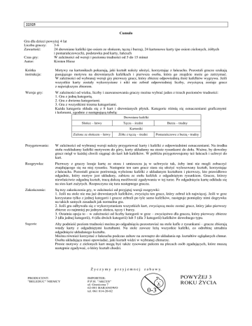 22325 Cumulo Gra dla dzieci powyżej 4 lat Liczba graczy: 3-6 Zawartość: 24 drewniane kafelki (po osiem ze słońcem, tęczą i burzą), 24 kartonowe karty (po osiem zielonych, żółtych i pomarańczowych), podstawka pod karty, łańcuch Czas gry: W zależności od wersji i poziomu trudności od 5 do 15 minut Autor: Kirsten Hiese Krótka instrukcja: Motywy na kartonikach pokazują, jaki kształt należy ułożyć, korzystając z łańcucha. Pozostali gracze szukają pasującego motywu na drewnianych kafelkach i pierwsza osoba, która go znajdzie może go zatrzymać. W zależności od wybranej wersji gry pierwszy gracz, który zbierze odpowiednią ilość kafelków wygrywa. Jeśli wszystkie karty zostały wykorzystane i nikt nie zebrał odpowiedniej liczby, zwycięzcą zostaje gracz z największym zbiorem. Wersje gry: W zależności od wieku, liczby i zaawansowania graczy można wybrać jeden z trzech poziomów trudności: 1. Gra z jedną kategorią. 2. Gra z dwiema kategoriami. 3. Gra z wszystkimi trzema kategoriami. Każda kategoria składa się z 8 kart i drewnianych płytek. Kategorie różnią się oznaczeniami graficznymi i kolorami, zgodnie z następującą tabelą: Drewniane kafelki Słońce – łatwy Tęcza – średni Burza – trudny Kartoniki Zielone ze słońcem – łatwy Żółte z tęczą – średni Pomarańczowe z burzą - trudny Przygotowanie: W zależności od wybranej wersji należy przygotować karty i kafelki z odpowiednimi oznaczeniami. Na środku stołu rozkładamy kafelki motywem do góry, karty układamy na stosie rysunkami do dołu. Ważne, by dowolny gracz mógł w każdej chwili sięgnąć do kart lub kafelków. W pobliżu przygotowujemy też łańcuch i uchwyt do kart. Rozgrywka: Pierwszy z graczy losuje kartę ze stosu i umieszcza ją w uchwycie tak, żeby inni nie mogli zobaczyć znajdującego się na niej rysunku. Następnie ten sam gracz stara się ułożyć wylosowany kształt, korzystając z łańcucha. Pozostali gracze porównują wyłożone kafelki z układanym kształtem i pierwszy, kto prawidłowo odgadnie, który motyw jest układany, zabiera ze stołu kafelek z odgadniętym rysunkiem. Gracze, którzy niewłaściwie odgadną kształt, tracą dalszą możliwość zgadywania w tej turze. Po odgadnięciu kartę odkłada się na stos kart zużytych. Rozpoczyna się tura następnego gracza. Zakończenie: Są trzy zakończenia gry, w zależności od przyjętej wersji rozgrywki: 1. Jeśli na stole nie ma już drewnianych kafelków, zwycięża ten gracz, który zebrał ich najwięcej. Jeśli w grze korzystano tylko z jednej kategorii i gracze zebrali po tyle samo kafelków, następuje pomiędzy nimi dogrywka na takich samych zasadach jak normalna gra. 2. Jeśli gra odbywała się z wykorzystaniem wszystkich kart, zwycięzcą może zostać gracz, który jako pierwszy zbierze co najmniej po jednym słońcu, tęczy i burzy. 3. Ostatnia opcja to – w zależności od liczby kategorii w grze – zwycięstwo dla gracza, który pierwszy zbierze 3 (dla jednej kategorii), 4 (dla dwóch kategorii) lub 5 (dla 3 kategorii) kafelków dowolnego typu. Sugestie Aby podnieść poziom trudności można po odgadnięciu pozostawiać na stole kafle z rysunkami – gracze zbierają wtedy karty z odgadniętymi kształtami. Na stole zawsze leżą wszystkie kafelki, co odrobinę utrudnia odgadnięcie układanego kształtu. Można również korzystać z łańcucha podczas zabaw na zewnątrz do układania np. kształtów oglądanych chmur. Osoba układająca musi opowiadać, jaki kształt widzi w wybranej chmurze. Proste motywy z zielonych kart mogą być także rysowane palcem na plecach osób zgadujących, które muszą następnie zgadywać, o który kształt chodzi. Życzymy PRODUCENT: ”BELEDUC” NIEMCY przyjemnej IMPORTER: P.P.H. ”AKCES” ul. Graniczna 7 62-081 BARANOWO tel. 061 814-20-82 z a b a w y. POWYŻEJ 3 ROKU ŻYCIA