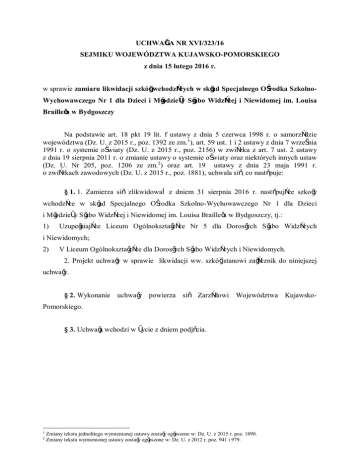 UCHWAŁA NR XVI/323/16 SEJMIKU WOJEWÓDZTWA KUJAWSKO-POMORSKIEGO z dnia 15 lutego 2016 r. w sprawie zamiaru likwidacji szkół wchodzących w skład Specjalnego Ośrodka SzkolnoWychowawczego Nr 1 dla Dzieci i Młodzieży Słabo Widzącej i Niewidomej im. Louisa Braille’a w Bydgoszczy Na podstawie art. 18 pkt 19 lit. f ustawy z dnia 5 czerwca 1998 r. o samorządzie województwa (Dz. U. z 2015 r., poz. 1392 ze zm. 1), art. 59 ust. 1 i 2 ustawy z dnia 7 września 1991 r. o systemie oświaty (Dz. U. z 2015 r., poz. 2156) w związku z art. 7 ust. 2 ustawy z dnia 19 sierpnia 2011 r. o zmianie ustawy o systemie oświaty oraz niektórych innych ustaw (Dz. U. Nr 205, poz. 1206 ze zm.2) oraz art. 19 ustawy z dnia 23 maja 1991 r. o związkach zawodowych (Dz. U. z 2015 r., poz. 1881), uchwala się, co następuje: § 1. 1. Zamierza się zlikwidować z dniem 31 sierpnia 2016 r. następujące szkoły wchodzące w skład Specjalnego Ośrodka Szkolno-Wychowawczego Nr 1 dla Dzieci i Młodzieży Słabo Widzącej i Niewidomej im. Louisa Braille’a w Bydgoszczy, tj.: 1) Uzupełniające Liceum Ogólnokształcące Nr 5 dla Dorosłych Słabo Widzących i Niewidomych; 2) V Liceum Ogólnokształcące dla Dorosłych Słabo Widzących i Niewidomych. 2. Projekt uchwały w sprawie likwidacji ww. szkół stanowi załącznik do niniejszej uchwały. § 2. Wykonanie uchwały powierza się Zarządowi Województwa KujawskoPomorskiego. § 3. Uchwała wchodzi w życie z dniem podjęcia. 1 2 Zmiany tekstu jednolitego wymienionej ustawy zostały ogłoszone w: Dz. U. z 2015 r. poz. 1890. Zmiany tekstu wymienionej ustawy zostały ogłoszone w: Dz. U. z 2012 r. poz. 941 i 979. UZASADNIENIE 1. Przedmiot regulacji: Przedmiotem niniejszej uchwały jest zamiar likwidacji dwóch szkół wchodzących w skład Specjalnego Ośrodka Szkolno-Wychowawczego Nr 1 dla Dzieci i Młodzieży Słabo Widzącej i Niewidomej im. Louisa Braille’a w Bydgoszczy, tj.: 1) Uzupełniające Liceum Ogólnokształcące Nr 5 dla Dorosłych Słabo Widzących i Niewidomych, 2) V Liceum Ogólnokształcące dla Dorosłych Słabo Widzących i Niewidomych. 2. Omówienie podstawy prawnej: Zgodnie art. 18 pkt 19 lit. f ustawy o samorządzie województwa, do wyłącznej właściwości sejmiku województwa należy podejmowanie uchwał w sprawach majątkowych województwa dotyczących tworzenia, przekształcania i likwidowania wojewódzkich samorządowych jednostek organizacyjnych oraz wyposażania ich w majątek. Zgodnie z art. 59 ust. 1 i 2 ustawy o systemie oświaty organ prowadzący jest obowiązany, co najmniej na 6 miesięcy przed terminem likwidacji, zawiadomić o zamiarze likwidacji szkoły: rodziców uczniów (w przypadku szkoły dla dorosłych - uczniów), właściwego kuratora oświaty oraz organ wykonawczy jednostki samorządu terytorialnego właściwej do prowadzenia szkół danego typu. Szkoła lub placówka publiczna prowadzona przez jednostkę samorządu terytorialnego może zostać zlikwidowana po zasięgnięciu opinii organu sprawującego nadzór pedagogiczny. Zgodnie z art.7 ust.2 ustawy o zmianie ustawy o systemie oświaty oraz niektórych innych ustaw, z dniem 1 września 2012 r. likwiduje się klasę pierwszą, a w latach następnych kolejne klasy dotychczasowej zasadniczej szkoły zawodowej dla dorosłych, technikum dla dorosłych, liceum profilowanego dla dorosłych, uzupełniającego liceum ogólnokształcącego dla dorosłych. Zgodnie z art. 19 ustawy z dnia 23 maja 1991 r. o związkach zawodowych (Dz. U. z 2015 r. poz. 1881), organ samorządu terytorialnego przedkłada, odpowiednim władzom statutowym związku, projekt aktów prawnych, również na adres elektroniczny, celem zaopiniowania przez reprezentatywne organizacje związkowe. 3. Konsultacje wymagane przepisami prawa (łącznie z przepisami wewnętrznymi): Po podjęciu niniejszej uchwały o zamiarze likwidacji Uzupełniającego Liceum Ogólnokształcącego Nr 5 dla Dorosłych Słabo Widzących i Niewidomych oraz V Liceum Ogólnokształcącego dla Dorosłych Słabo Widzących i Niewidomych, organ prowadzący: 1) zasięga opinii organu sprawującego nadzór pedagogiczny – Kujawsko-Pomorskiego Kuratora Oświaty; 2) zasięga opinii władz statutowych związku – Niezależnego Samorządnego Związku Zawodowego „Solidarność”, Ogólnopolskiego Porozumienia Związków Zawodowych i Forum Związków Zawodowych. 4. Uzasadnienie merytoryczne: Przyczyną podjęcia uchwały o zamiarze likwidacji jest konieczność uporządkowania struktury Specjalnego Ośrodka Szkolno-Wychowawczego Nr 1 dla Dzieci i Młodzieży Słabo Widzącej i Niewidomej im. Louisa Braille’a w Bydgoszczy oraz dostosowanie typów szkół do stanu zgodnego z obowiązującym prawem oświatowym oraz istniejącym stanem faktycznym. W Specjalnym Ośrodku Szkolno-Wychowawczym Nr 1 dla Dzieci i Młodzieży Słabo Widzącej i Niewidomej im. Louisa Braille’a w Bydgoszczy istnieje Uzupełniające Liceum Ogólnokształcące Nr 5 dla Dorosłych Słabo Widzących i Niewidomych. Zgodnie z przepisami prawa oświatowego, nakazującymi zaprzestania naboru do uzupełniających liceów ogólnokształcących dla dorosłych o trzyletnim profilu kształcenia poczynając od 1 września 2012 r., Ośrodek nie dokonywał naboru do ww. liceum, w związku z czym zostało ono wygaszone do 31 sierpnia 2015 r. Obecnie żaden uczeń nie pobiera w nim nauki. W strukturze ww. Ośrodka istnieje również V Liceum Ogólnokształcące dla Dorosłych Słabo Widzących i Niewidomych, które z uwagi na brak zainteresowania ofertą wśród uczniów nie dokonywało naboru od 2004 roku i aktualnie nie ma uczniów pobierających naukę w ww. szkole i nie jest planowany w przyszłości dalszy nabór uczniów. 5. Ocena skutków regulacji: W wyniku podjętej uchwały nastąpi uporządkowanie istniejącej struktury Specjalnego Ośrodka Szkolno-Wychowawczego Nr 1 dla Dzieci i Młodzieży Słabo Widzącej i Niewidomej im. Louisa Braille’a w Bydgoszczy, zgodnie z 