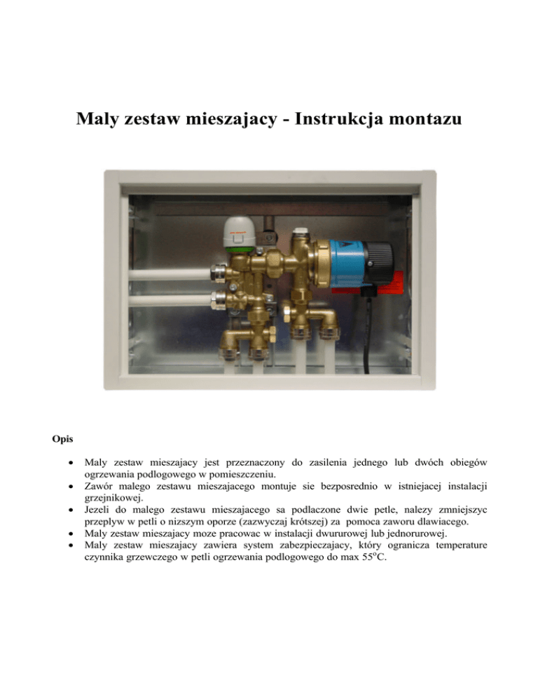 Maly zestaw mieszajacy - Instrukcja montazu Opis • • • • • Maly zestaw mieszajacy jest przeznaczony do zasilenia jednego lub dwóch obiegów ogrzewania podlogowego w pomieszczeniu. Zawór malego zestawu mieszajacego montuje sie bezposrednio w istniejacej instalacji grzejnikowej. Jezeli do malego zestawu mieszajacego sa podlaczone dwie petle, nalezy zmniejszyc przeplyw w petli o nizszym oporze (zazwyczaj krótszej) za pomoca zaworu dlawiacego. Maly zestaw mieszajacy moze pracowac w instalacji dwururowej lub jednorurowej. Maly zestaw mieszajacy zawiera system zabezpieczajacy, który ogranicza temperature czynnika grzewczego w petli ogrzewania podlogowego do max 55o C. 1. 2. 3. 4. 5. 6. 7. 8. 9. Glowica termostatyczna z czujnikiem wyniesionym Pompa cyrkulacyjna Odpowietrznik Zasilanie z instalacji grzejnikowej Powrót do instalacji grzejnikowej Zasilanie petli ogrzewania podlogowego Powrót petli ogrzewania podlogowego Nastawa wstepna instalacji ogrzewania podlogowego Nastawa zalezna od rodzaju instalacji (jedno- lub dwururowa) Montaz • • • • • • • • • Maly zestaw mieszajacy nalezy zamontowac w pozycji poziomej. Maly zestaw mieszajacy powinien byc zamontowany powyzej poziomu obiegów instalacji ogrzewania podlogowego. Cisnienie dyspozycyjne w instalacji grzejnikowej powinno wynosic minimum 1kPa. Przed podlaczeniem malego zestawu mieszajacego nalezy dokladnie przeplukac instalacje. Przed uruchomieniem uklad nalezy odpowietrzyc i sprawdzic szczelnosc podlaczen. Poniewaz praca pompy cyrkulacyjnej moze powodowac powstawanie dzwieków, nalezy umiescic ja w miejscu, gdzie dzwieki nie beda uciazliwe np. jesli ogrzewanie podlogowe zainstalowane jest w sypialni, maly zestaw mieszajacy lepiej jest umiescic w sasiednim pomieszczeniu. Temperatura wody w instalacji grzejnikowej powinna byc co najmniej 15o C wyzsza niz w petlach ogrzewania podlogowego. Jeden obieg o dlugosci max 80 m moze ogrzac powierzchnie okolo 20 m2 . Dwa obiegi max 2x80 m – powierzchnie okolo 40 m2 . Zamontowac glowice termostatyczna i umiescic czujnik w odpowiednim miejscu pomieszczenia okolo 1,7 m ponad podloga. Regulacja • Informacja o instalacjach jedno- i dwururowych na stronach 5 i 6. Akcesoria Laczniki do rur z tworzyw sztucznych 16x2 na ¾“ 17x2 na ¾“ 20x2 na ¾” Nr katalogowy CSY0053033 UFH0050114 CSY0053035 Uruchomienie 1. Zwiekszyc temperature zasilania instalacji grzejnikowej do wartosci zaprojektowanej (zazwyczaj okolo 70o C). 2. Aby wyregulowac instalacje ogrzewania podlogowego, temperatura jastrychowej plyty grzejnej powinna wynosic min 20o C. 3. Jezeli temperatura plyty grzejnej jest nizsza, nalezy doprowadzic ja do 20o C i utrzymac przez 10 minut. 4. Sprawdzic temperature wody w petlach ogrzewania podlogowego. Powinna ona wynosic okolo 35-40o C. Jezeli jest za wysoka, trzeba zdjac kolpak ochronny lub glowice termostatyczna i zredukowac strumien zasilajacy z instalacji grzejnikowej – patrz strona 3. Dane techniczne Max cisnienie pracy Max temperatura wody w instalacji grzejnikowej Max temperatura wody w instalacji ogrzewania podlogowego Max róznica cisnien Podlaczenie elektryczne Zuzycie energii Zakres regulacji glowicy termostatycznej Nr katalogowy malego zestawu mieszajacego Nr katalogowy rozgalezien do malego zestawu mieszajacego 1 MPa (10 bar) 80o C 55o C 100 kPa 1x230V/50 Hz 23 W 10-26oC UFH0050470 UFH0050473 Instalacja dwururowa Nastawa wstepna Instalacja jednorurowa Nastawa wstepna Montaz wspornika mocujacego do sciany