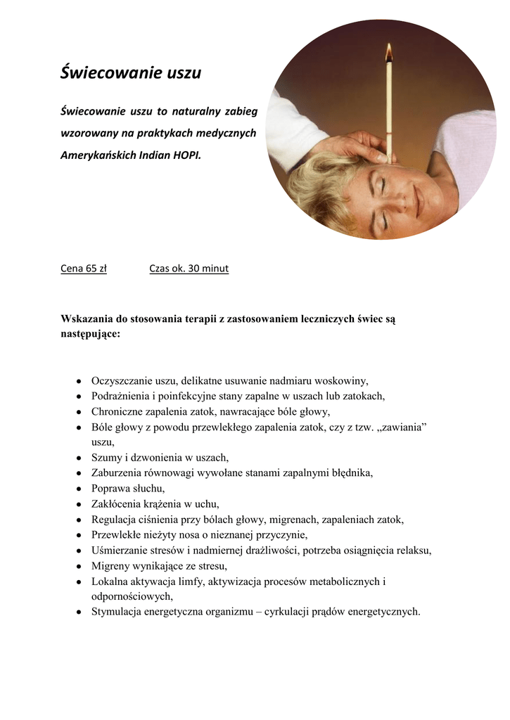 Świecowanie uszu Świecowanie uszu to naturalny zabieg wzorowany na praktykach medycznych Amerykaoskich Indian HOPI. Cena 65 zł Czas ok. 30 minut Wskazania do stosowania terapii z zastosowaniem leczniczych świec są następujące: Oczyszczanie uszu, delikatne usuwanie nadmiaru woskowiny, Podrażnienia i poinfekcyjne stany zapalne w uszach lub zatokach, Chroniczne zapalenia zatok, nawracające bóle głowy, Bóle głowy z powodu przewlekłego zapalenia zatok, czy z tzw. „zawiania” uszu, Szumy i dzwonienia w uszach, Zaburzenia równowagi wywołane stanami zapalnymi błędnika, Poprawa słuchu, Zakłócenia krążenia w uchu, Regulacja ciśnienia przy bólach głowy, migrenach, zapaleniach zatok, Przewlekłe nieżyty nosa o nieznanej przyczynie, Uśmierzanie stresów i nadmiernej drażliwości, potrzeba osiągnięcia relaksu, Migreny wynikające ze stresu, Lokalna aktywacja limfy, aktywizacja procesów metabolicznych i odpornościowych, Stymulacja energetyczna organizmu – cyrkulacji prądów energetycznych.