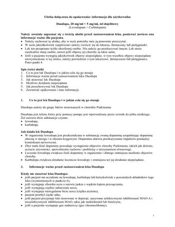 Ulotka dołączona do opakowania: informacja dla użytkownika Duodopa, 20 mg/ml + 5 mg/ml, żel dojelitowy (Levodopum + Carbidopum) Należy uważnie zapoznać się z treścią ulotki przed zastosowaniem leku, ponieważ zawiera ona informacje ważne dla pacjenta. Należy zachować tę ulotkę, aby w razie potrzeby móc ją ponownie przeczytać. W razie jakichkolwiek wątpliwości należy zwrócić się do lekarza, farmaceuty lub pielęgniarki. Lek ten przepisano ściśle określonej osobie. Nie należy go przekazywać innym. Lek może zaszkodzić innej osobie, nawet jeśli objawy jej choroby są takie same. Jeśli u pacjenta wystąpią jakiekolwiek objawy niepożądane, w tym wszelkie objawy niepożądane niewymienione w tej ulotce, należy powiedzieć o tym lekarzowi, farmaceucie lub pielęgniarce. Patrz punkt 4. Spis treści ulotki 1. Co to jest lek Duodopa i w jakim celu się go stosuje 2. Informacje ważne przed zastosowaniem leku Duodopa 3. Jak stosować lek Duodopa 4. Możliwe działania niepożądane 5. Jak przechowywać lek Duodopa 6. Zawartość opakowania i inne informacje 1. Co to jest lek Duodopa i w jakim celu się go stosuje Duodopa należy do grupy leków stosowanych w chorobie Parkinsona. Duodopa jest żelem, który przy pomocy pompy jest wprowadzany przez cewnik do jelita cienkiego. Żel zawiera dwie substancje czynne: lewodopę, karbidopę. Jak działa lek Duodopa W organizmie lewodopa jest przekształcana w substancję zwaną dopaminą uzupełniając dopaminę obecną w mózgu i w rdzeniu kręgowym. Dopamina ułatwia przekazywanie impulsów pomiędzy komórkami nerwowymi. Zbyt mała ilość dopaminy powoduje wystąpienie objawów choroby Parkinsona, takich jak drżenie, uczucie sztywności, spowolnienie ruchowe i problemy z utrzymaniem równowagi. Leczenie lewodopą zwiększa ilość dopaminy w organizmie i dlatego zmniejsza nasilenie objawów choroby. Karbidopa zwiększa działanie lecznicze lewodopy i zmniejsza też jej działania niepożądane. 2. Informacje ważne przed zastosowaniem leku Duodopa Kiedy nie stosować leku Duodopa: jeśli pacjent ma uczulenie na lewodopę, karbidopę lub którykolwiek z pozostałych składników tego leku (wymienionych w punkcie 6), jeśli występuje choroba oczu o nazwie jaskra z wąskim kątem przesączania, jeśli występują ciężkie zaburzenia serca, jeśli występuje nieregularne bicie serca (ciężka arytmia), pacjent przebył ciężki udar, jeśli pacjent przyjmuje leki stosowane w depresji, nazywane selektywnymi inhibitorami MAO-A i nieselektywnymi inhibitorami MAO, takie jak moklobemid lub fenelzyna, jeśli u pacjenta występuje guz nadnerczy (guz chromochłonny), 1 jeśli pacjent ma zaburzenia hormonalne, takie jak nadmierna produkcja kortyzolu (zespół Cushinga) lub za wysokie stężenie hormonów tarczycy (nadczynność tarczycy), jeśli pacjent miał kiedykolwiek raka skóry lub ma nietypowe znamiona („pieprzyki”) lub zmiany na skórze, których nie obejrzał lekarz. Nie stosować leku Duodopa, jeśli którykolwiek z powyższych punktów dotyczy pacjenta. W razie jakichkolwiek wątpliwości przed rozpoczęciem stosowania leku Duodopa należy zwrócić się do lekarza. Ostrzeżenia i środki ostrożności Przed rozpoczęciem stosowania leku Duodopa należy omówić z lekarzem, jeśli: pacjent przebył kiedykolwiek zawał serca, zablokowanie naczyń krwionośnych w sercu lub inne choroby serca, w tym zaburzenia rytmu serca (arytmię), u pacjenta stwierdzono chorobę płuc, taką jak astma, u pacjenta występowało kiedykolwiek zaburzenie hormonalne, u pacjenta występowała kiedykolwiek depresja z myślami samobójczymi lub jakiekolwiek inne zaburzenia psychiczne, u pacjenta stwierdzono chorobę oczu o nazwie jaskra z szerokim kątem przesączania, pacjent miał kiedykolwiek wrzód żołądka, jeśli u pacjenta występowały kiedykolwiek drgawki (konwulsje), jeśli pacjent przebył kiedykolwiek zabieg chirurgiczny w obrębie górnej części jamy brzusznej. Jeśli powyższe dotyczy pacjenta (lub pacjent nie jest pewny), należy powiedzieć o tym lekarzowi przed zastosowaniem leku Duodopa. Należy zwrócić uwagę na następujące działania niepożądane Złośliwy zespół neuroleptyczny Nie należy przerywać stosowania lub zmniejszać dawki leku Duodopa, o ile nie zaleci tego lekarz. Nagłe przerwanie stosowania lub szybkie zmniejszenie dawki leku Duodopa może spowodować ciężkie zaburzenie nazywane złośliwym zespołem neuroleptycznym (patrz punkt 4 „Ciężkie działania niepożądane”). Uczucie senności lub zawroty głowy Jeśli pacjent nagle zasypia (napady snu) lub odczuwa nadmierną senność, lub uczucie pustki w głowie, lub zawroty głowy nie powinien prowadzić pojazdów, używać narzędzi lub obsługiwać maszyn do chwili całkowitego przebudzenia lub ustąpienia uczucia pustki w głowie, lub zawrotów głowy (patrz punkt 2 „Prowadzenie pojazdów i obsługiwanie maszyn”). Zmiany skórne Należy powiedzieć lekarzowi, farmaceucie lub pielęgniarce, jeśli pacjent zauważył pojawienie się nietypowych zmian lub znamion („pieprzyków”) na skórze lub ich nasilenie (patrz punkt 4 „Inne działania niepożądane”). Zaburzenia kontroli impulsów – zmiany w zachowaniu pacjenta Należy powiedzieć o tym lekarzowi, jeśli pacjent, jego rodzina lub opiekun zauważą pojawienie się popędów lub nieodpartych pragnień ulegania zachowaniom, które są nietypowe dla pacjenta lub pacjent nie jest zdolny do przeciwstawienia się impulsywnemu pragnieniu, popędowi lub pokusie wykonania pewnych czynności, które mogą być szkodliwe dla niego samego lub innych. Takie zachowania są nazywane zaburzeniami kontroli impulsów i zalicza się do nich: uzależnienie od hazardu, nadmierne objadanie się lub wydawanie pieniędzy, nadmierny popęd płciowy albo nasilone myśli lub odczucia o charakterze seksualnym. Może być konieczne ponowne przeanalizowanie stosowanego leczenia przez lekarza. Lekarz om