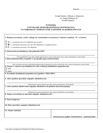 Sianów, ................................ Urząd Gminy i Miasta w Sianowie ul. Armii Polskiej 30 76-004 Sianów WNIOSEK O WYDANIE JEDNORAZOWEGO ZEZWOLENIA NA SPRZEDAŻ I PODAWANIE NAPOJÓW ALKOHOLOWYCH 1. Rodzaj zezwolenia, o który ubiega się wnioskodawca (zaznaczyć właściwe znakiem "X" w kratce) A - o zawartości do 4,5% alkoholu oraz na piwo B - o zawartości powyżej 4,5% do 18% alkoholu (z wyjątkiem piwa) C - o zawartości powyżej 18% alkoholu 2. Oznaczenie przedsiębiorcy lub jednostki OSP: ----------------------------------------------------------------------------------------------------------------------------------------Firma przedsiębiorcy oraz adres siedziby (kod pocztowy, poczta, miejscowość, ulica, numer nieruchomości, numer lokalu) 3. Dane pełnomocnika (wypełnić w przypadku jego ustanowienia): ----------------------------------------------------------------------------------------------------------------------------------------Imię i nazwisko oraz adres zamieszkania pełnomocnika (kod pocztowy, poczta, miejscowość, ulica, numer nieruchomości, numer lokalu) 4. Numer w rejestrze przedsiębiorców lub ewidencji działalności gospodarczej: NIP ……………………………………………. KRS ……………………………………………. 5. Przedmiot działalności gospodarczej (zgodnie z PKD 2007): 6. Adres punktu sprzedaży napojów alkoholowych: ----------------------------------------------------------------------------------------------------------------------------------------(kod pocztowy, poczta, miejscowość, ulica, numer nieruchomości, numer lokalu) 7. Adres punktu składowania napojów alkoholowych (punktu dystrybucyjnego): ----------------------------------------------------------------------------------------------------------------------------------------(kod pocztowy, poczta, miejscowość, ulica, numer nieruchomości, numer lokalu) 8. Numer zezwolenia na sprzedaż napojów alkoholowych*: 9. Nazwa imprezy: 10. Data sprzedaży napojów alkoholowych: 11. Numer telefonu: własnoręczny podpis wnioskodawcy / pełnomocnika ______________________________________________________________________ * nie dotyczy jednostek Ochotniczych Straży Pożarnych. KARTA USŁUGI I. WYMAGANE DOKUMENTY, KTÓRE NALEŻY DOŁĄCZYĆ DO WNIOSKU (ORYGINAŁY DO WGLĄDU): 1) ważne zezwolenie na sprzedaż napojów alkoholowych wraz z dowodem wniesienia opłaty**, 2) pełnomocnictwo (w przypadku ustanowienia pełnomocnika) wraz z potwierdzeniem opłaty skarbowej w wysokości 17zł za złożenie dokumentu potwierdzającego udzielenie pełnomocnictwa. II. OPŁATY: Opłata za jednorazowe zezwolenie wnoszona jest na rachunek Urzędu Gminy i Miasta w Sianowie nr 84 9317 1012 0050 9760 2000 0010 przed wydaniem zezwolenia w wysokości: a) 43,75 zł – na sprzedaż napojów zawierających do 4,5% alkoholu oraz piwa, b) 43,75 zł – na sprzedaż napojów zawierających powyżej 4,5% do 18% alkoholu (z wyjątkiem piwa), c) 175,00 zł – na sprzedaż napojów zawierających powyżej 18% alkoholu. III. JEDNOSTKA ODPOWIEDZIALNA: Biuro Obsługi Interesantów UGiM w Sianowie pok. 1 - Adrian Lewandowski – Inspektor ds. działalności gospodarczej tel. 94 346 95 18 e-mail: [email protected] IV. TERMIN I SPOSÓB ZAŁATWIENIA: Wydanie zezwolenia maksymalnie na dwa dni w terminie do 1 miesiąca. V. TRYB ODWOŁAWCZY: Odwołanie od decyzji wnosi się w terminie 14 dni, od dnia jej otrzymania, do Samorządowego Kolegium Odwoławczego w Koszalinie, za pośrednictwem Burmistrza Gminy i Miasta Sianów. VI. PODSTAWA PRAWNA: - ustawa z dnia 26 października 1982 r. o wychowaniu w trzeźwości i przeciwdziałaniu alkoholizmowi (t. j. Dz. U. z 2012 r. poz. 1356 z późn. zm.), - ustawa z dnia 14 czerwca 1960 r. Kodeks postępowania administracyjnego (t. j. Dz. U. z 2013 r. poz. 267 z późn. zm.). _______________________________________________________________________________________________________________________________________________________________________ ** nie dotyczy jednostek Ochotniczych Straży Pożarnych i przedsiębiorców posiadających zezwolenie na sprzedaż napojów alkoholowych wydanych przez Burmistrza Gminy i Miasta Sianów.